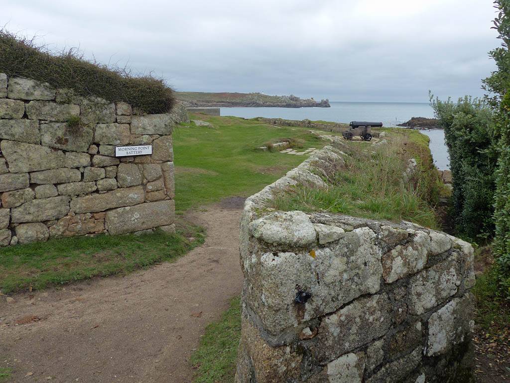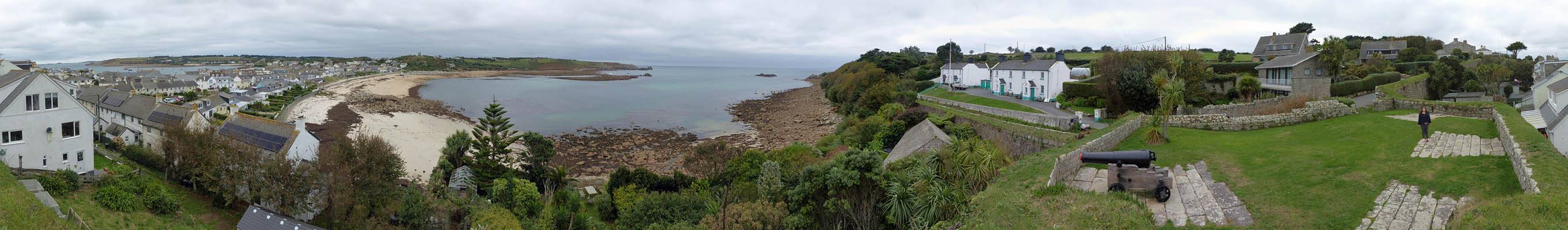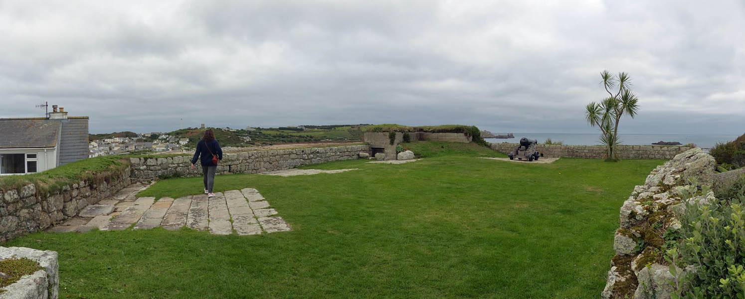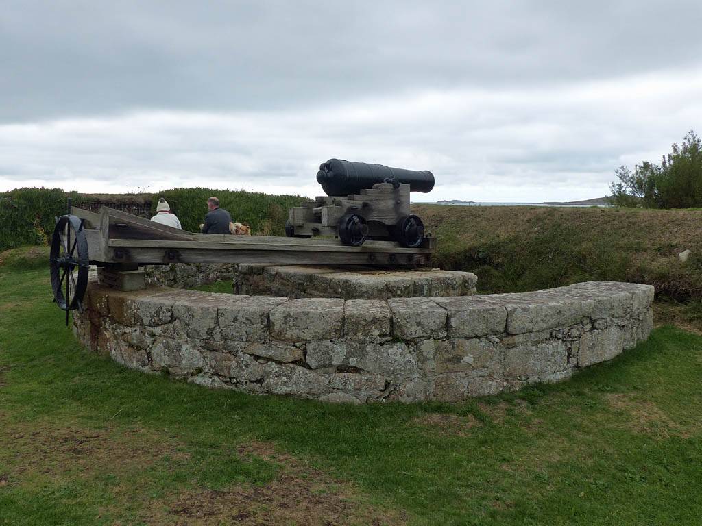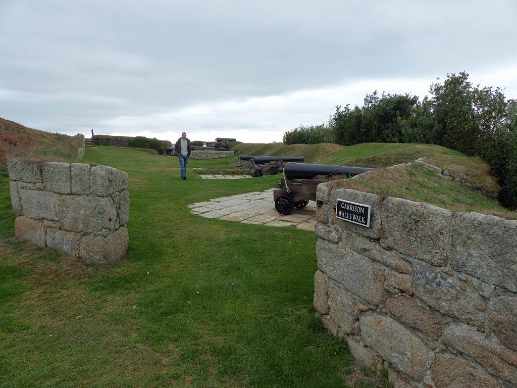 We started going anti-clockwise around the garrison walk. Up garrison lane we went first, pausing at the Star Castle and had a look around. Renée had a lemonade in the bar in the dungeon. Then we continued around route, taking in the views from the batteries with cannons. Towards the end in particular it was a great view back to Porthcressa Beach.