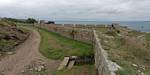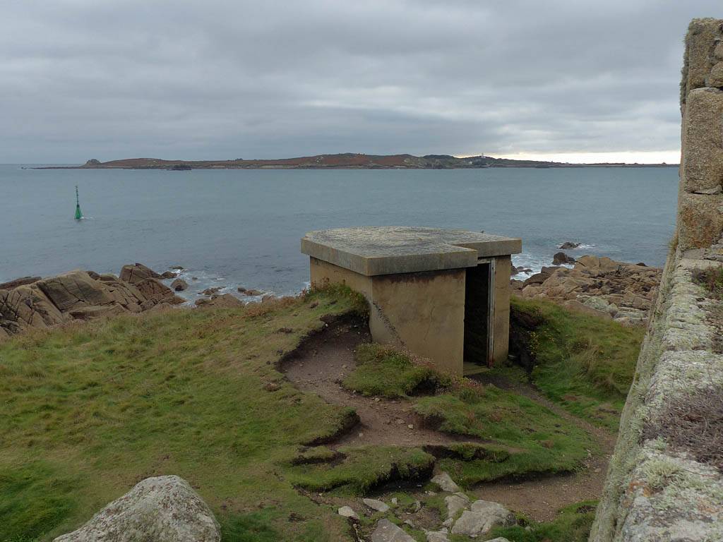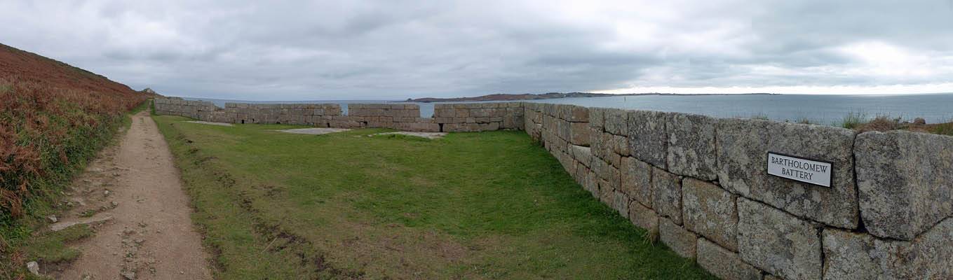 Bartholomew Battery. | Scilly flora. | Woolpack Point Battery. | A Rock Pipit and a Song Thrush inside the battery. |