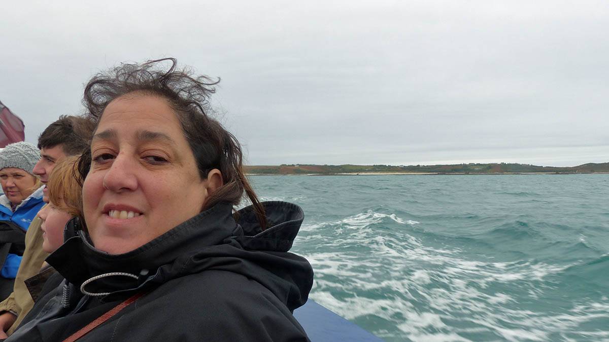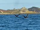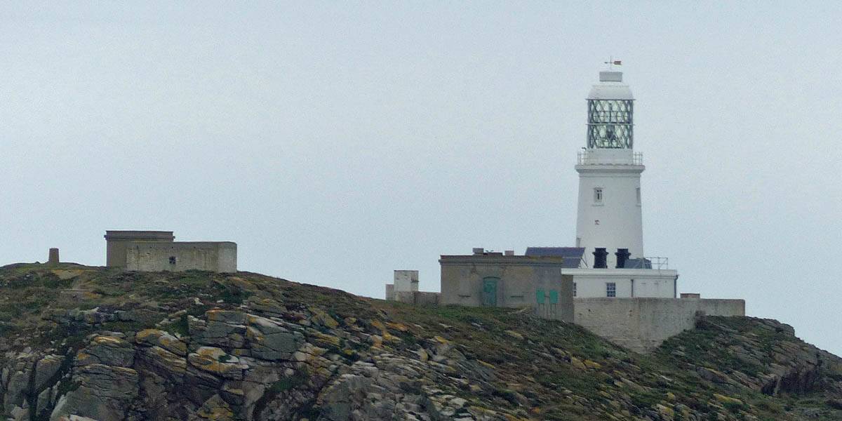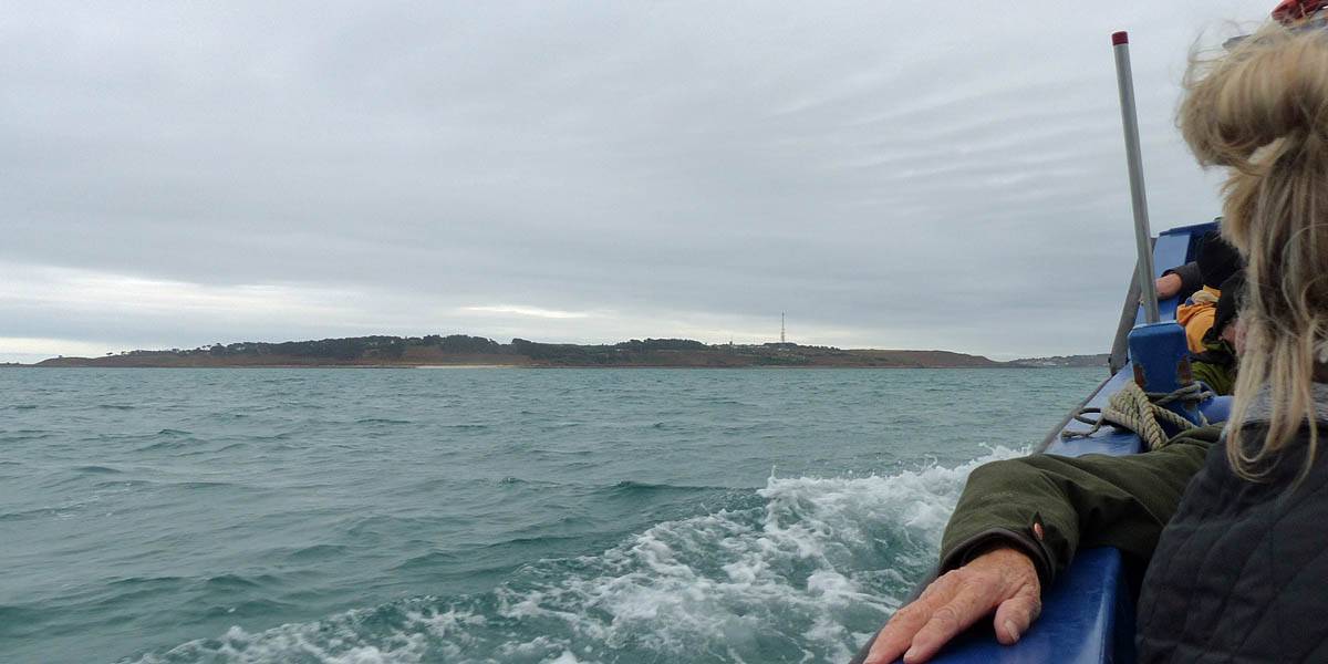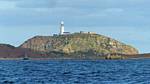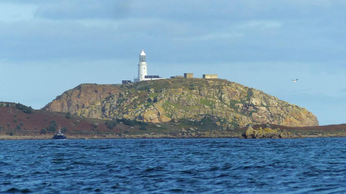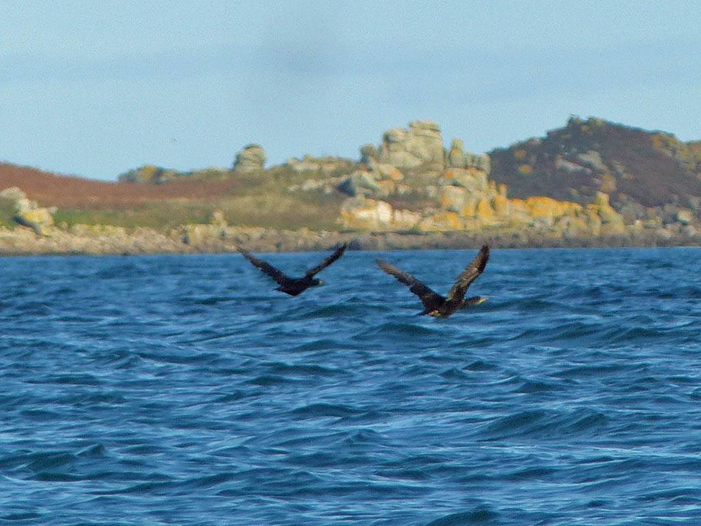 Looking at the coast of St. Mary's and the transmitter on the North side that serves the whole of the Isles of Scilly. | To the North Round Island and it's prominent light house can be seen. | Renée enjoying the boat ride. | Shags / Cormorants flying low and fast past the boat. |