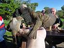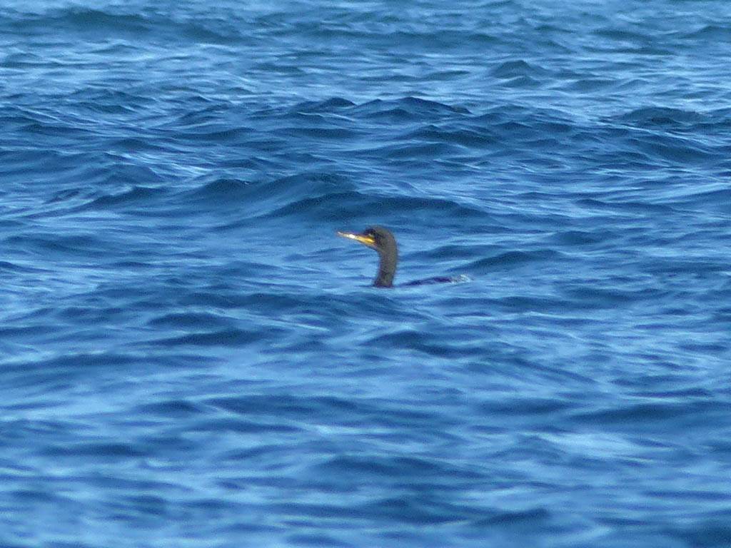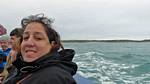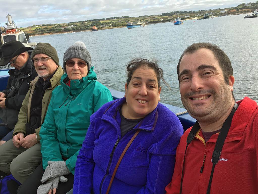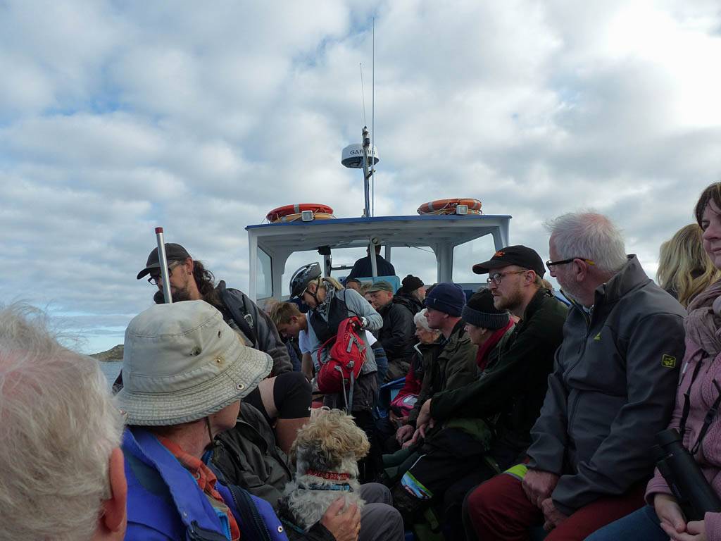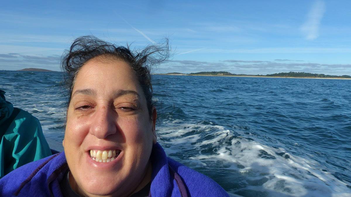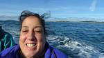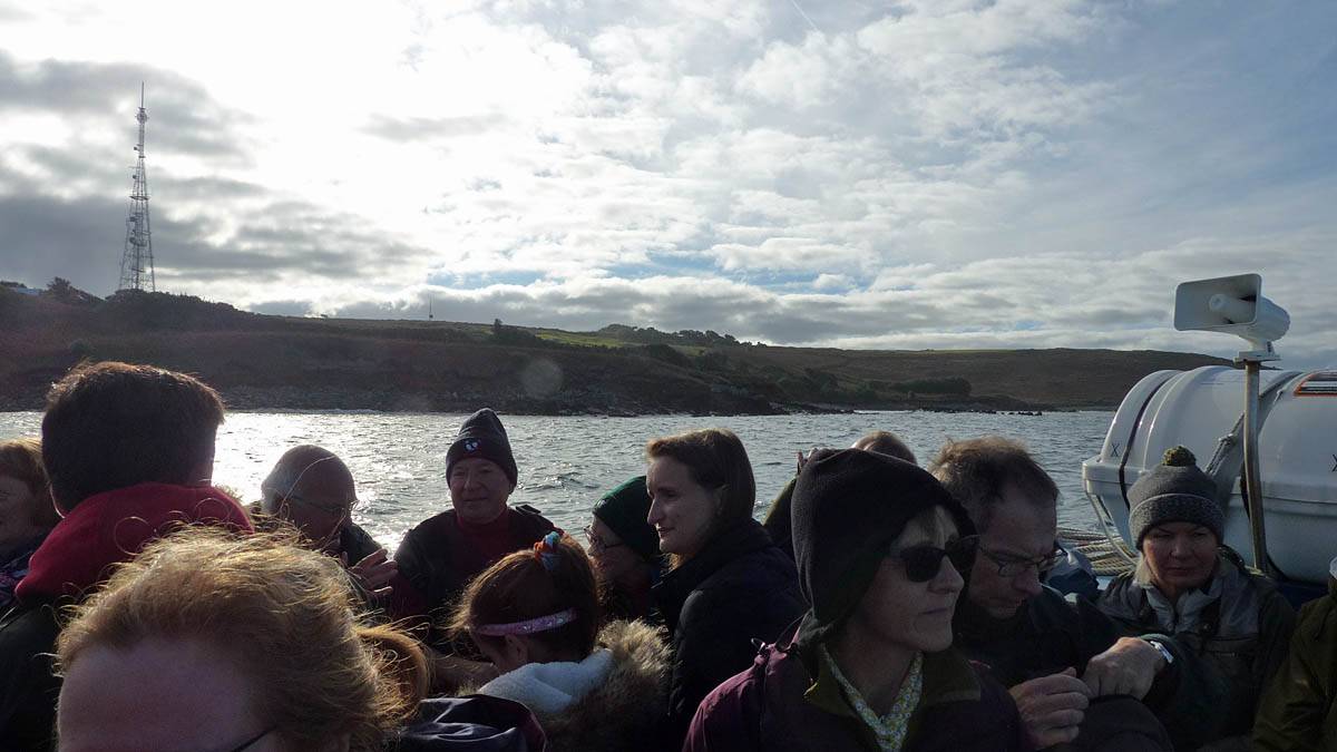 Looking at the coast of St. Mary's and the transmitter on the North side that serves the whole of the Isles of Scilly. | To the North Round Island and it's prominent light house can be seen. | Renée enjoying the boat ride. | Shags / Cormorants flying low and fast past the boat. |