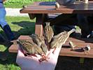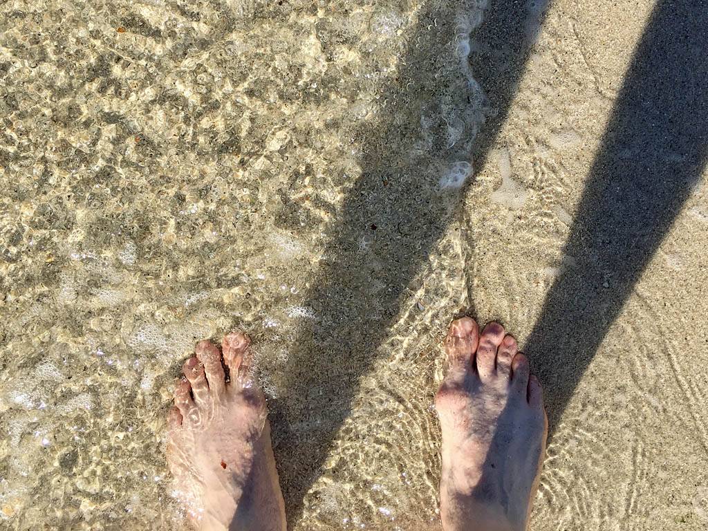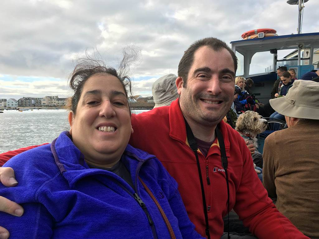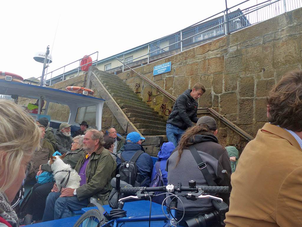 We all filled the boat and Renée and I took the same seats as on the outbound trip. We departed at 4:29PM and had a nice cruise back to St. Mary's. Now not directly into sun, we had a great view of the West Coast of St. Mary's and of Town Beach as we approached. On the way we chatted to others on the boat. We were back at 4:54PM. I noted how much lower we were at low tide compared to high tide when we had set off in the morning. The Quay now seemed huge.