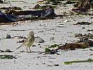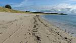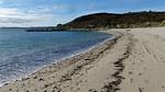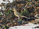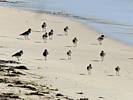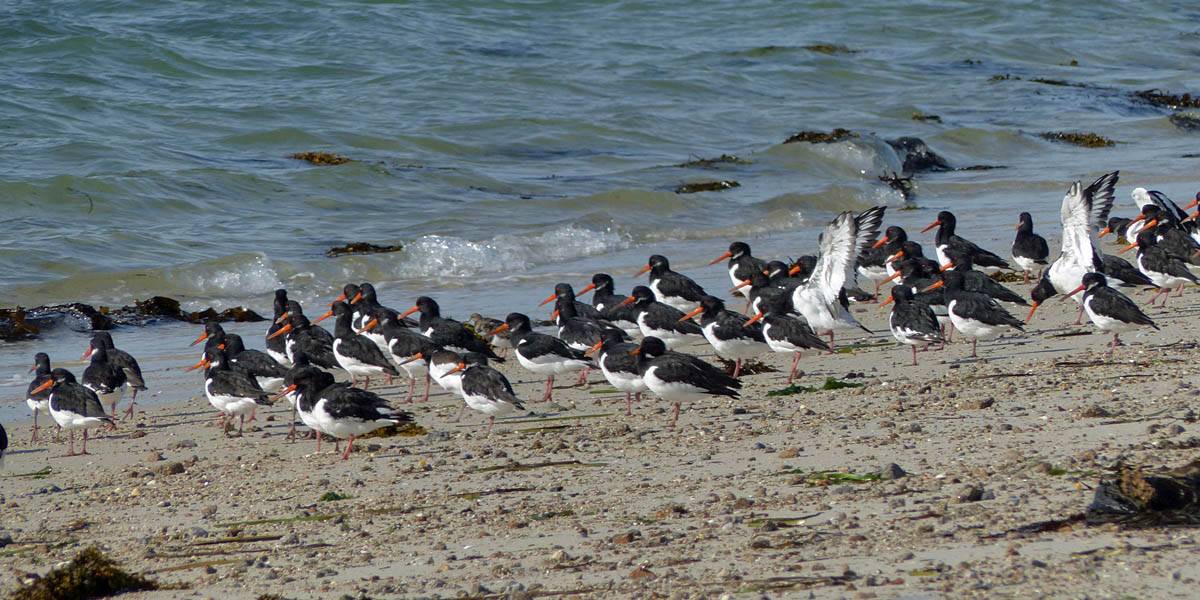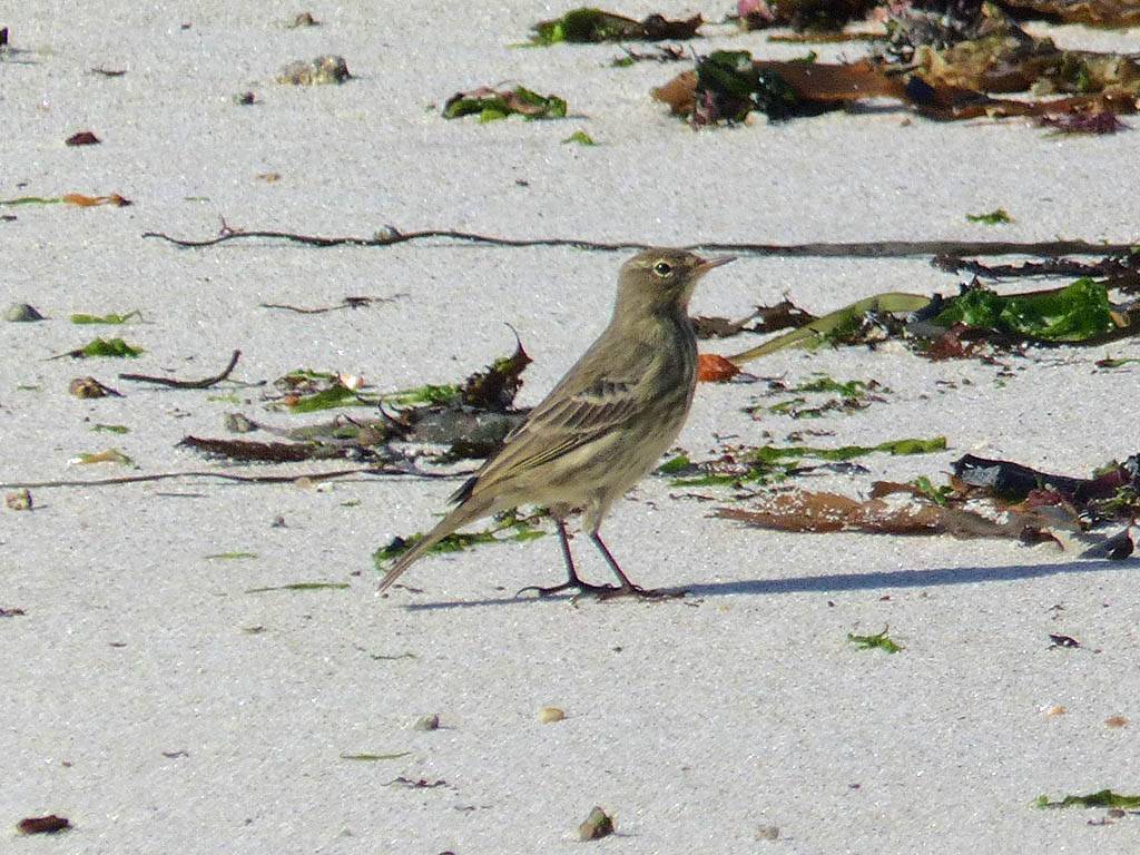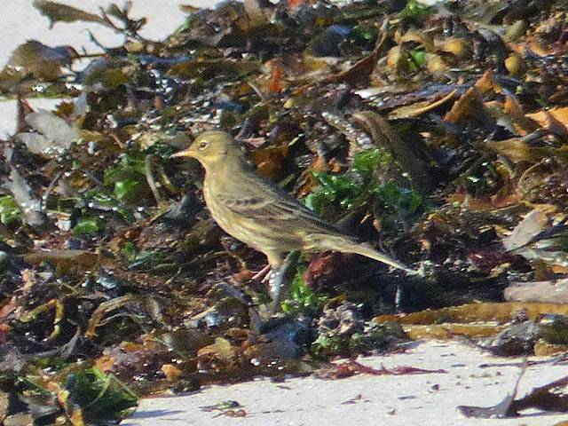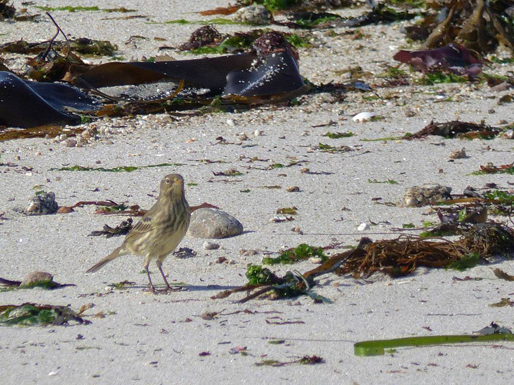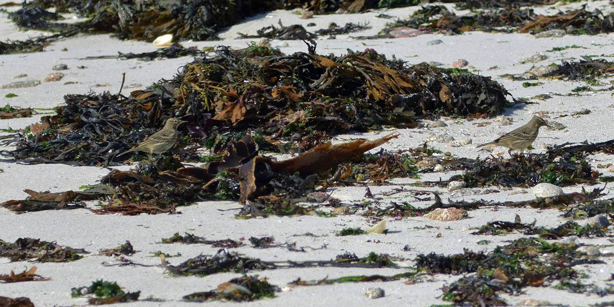 A flock of Oystercatchers on the beach. | A view of Renée on Higher Town Bay from the top of the sand dune. | The Oystercatchers in flight as we were unable to get past the flock without disturbing them. They soon settled behind us back on the beach again. | Shells on the beach. | There was a lot of seaweed washed up by Storm Callum. | A Meadow Pipit foraging amongst the seaweed. |