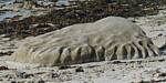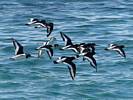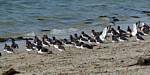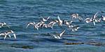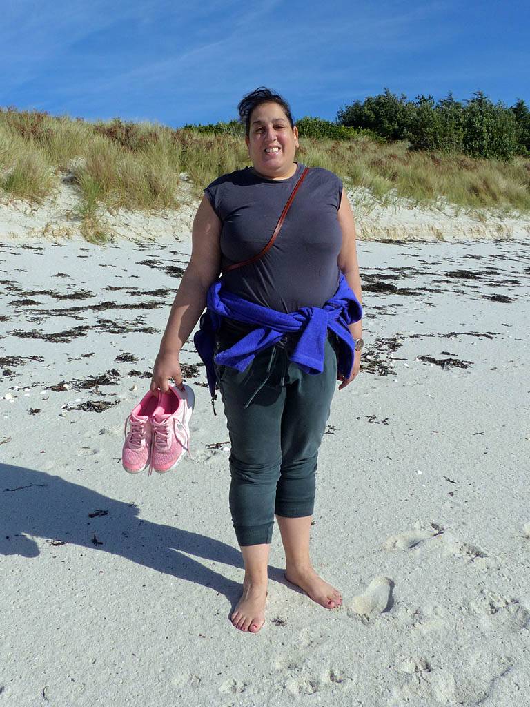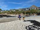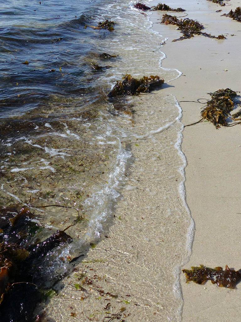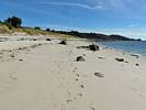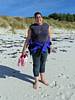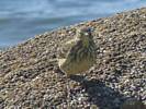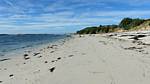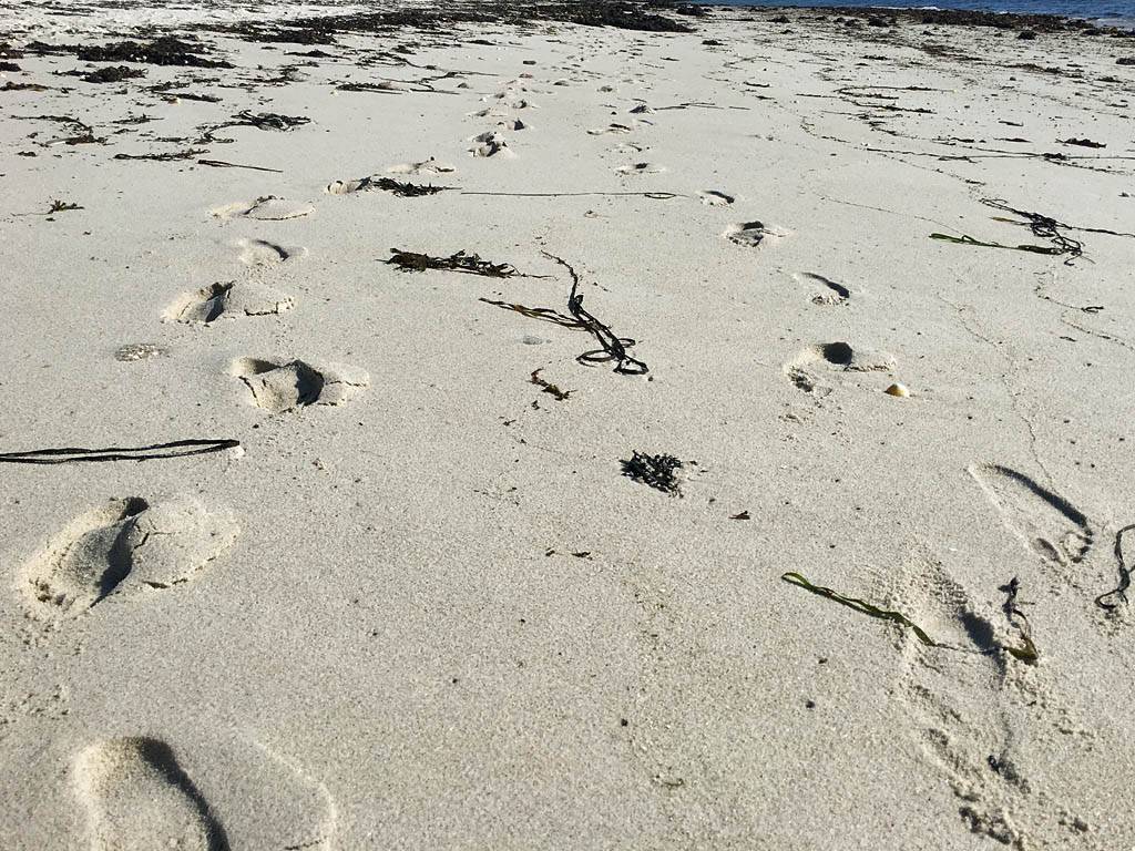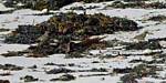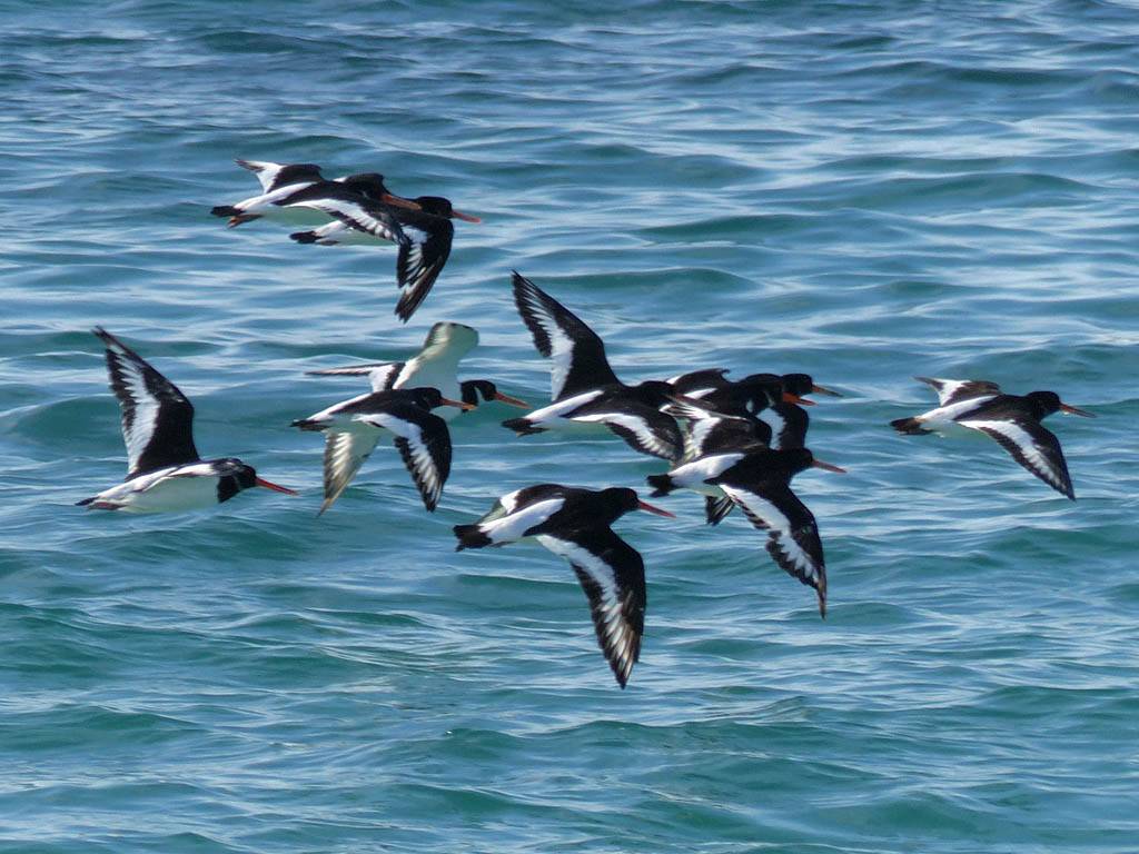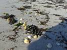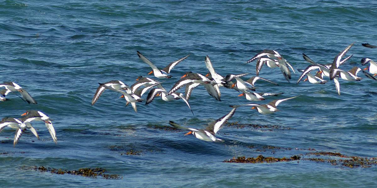 A flock of Oystercatchers on the beach. | A view of Renée on Higher Town Bay from the top of the sand dune. | The Oystercatchers in flight as we were unable to get past the flock without disturbing them. They soon settled behind us back on the beach again. | Shells on the beach. | There was a lot of seaweed washed up by Storm Callum. | A Meadow Pipit foraging amongst the seaweed. |