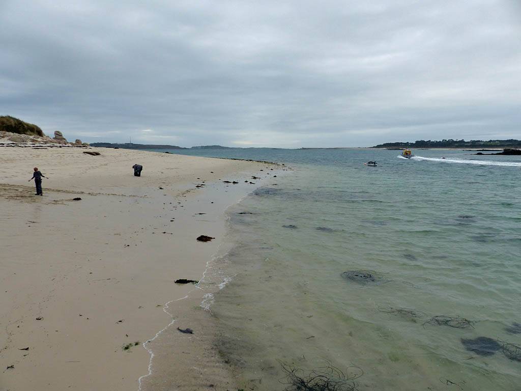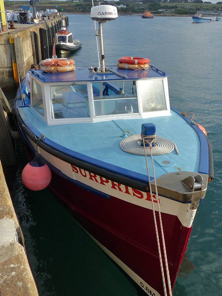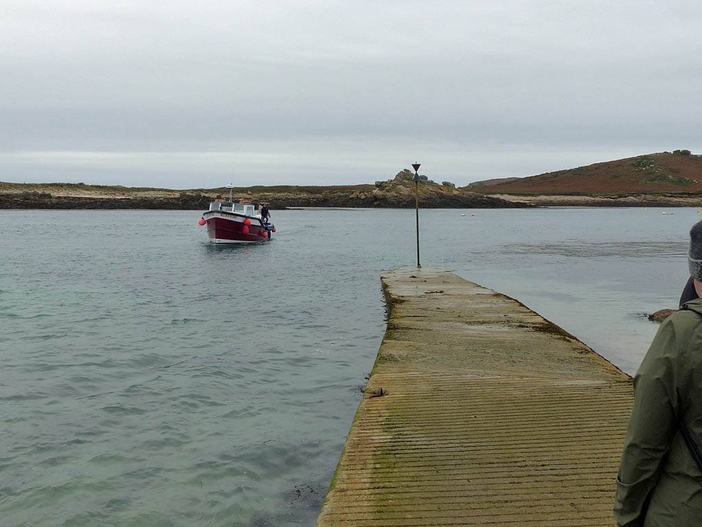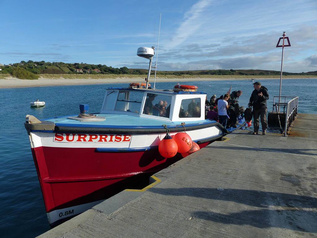 The tide was much lower now as we approached low tide. Renée sat on the ramp while I wandered to the water's edge and back. We chatted to some bird watchers and waited while more and more people gathered for the return boat. The boat to Tresco arrived at 4:10PM. As that boat departed 5 minutes later the Surprise boat arrived at 4:15PM.