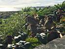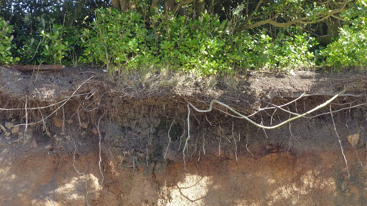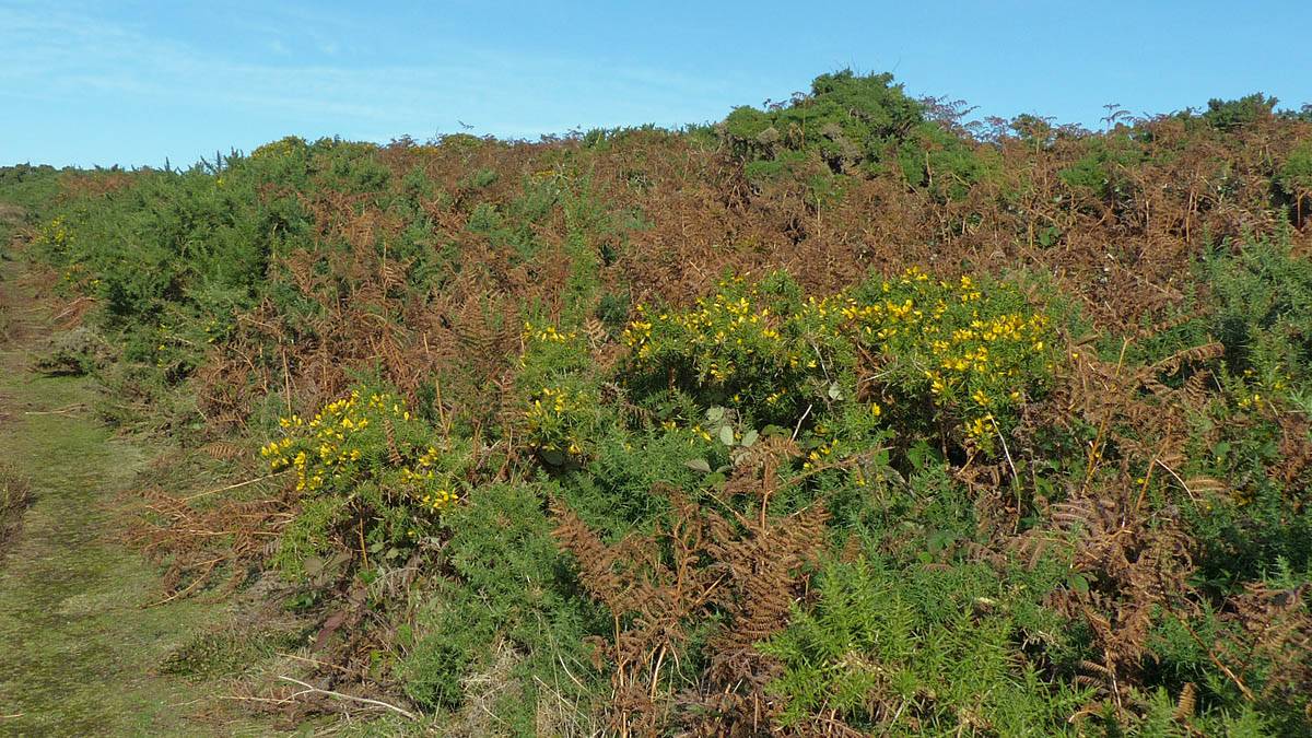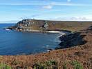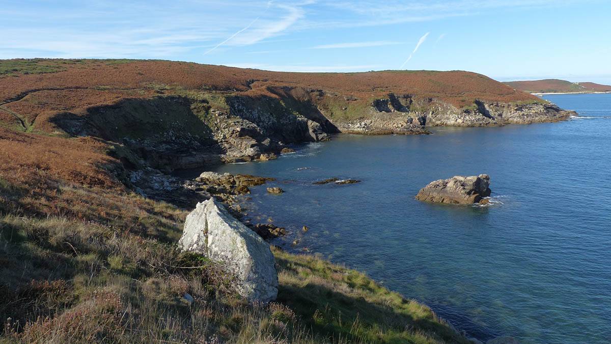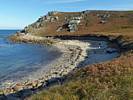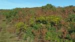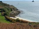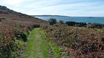 Finding our way over the Heathland on the ridge towards the other side. | Looking along the North Coast. In front is a steep drop off to Bread and Cheese Cove. | After a brief backtrack we found an easy path down to the Eastern corner of Bread and Cheese Cove. The coastal path Westwards was clear from here. |