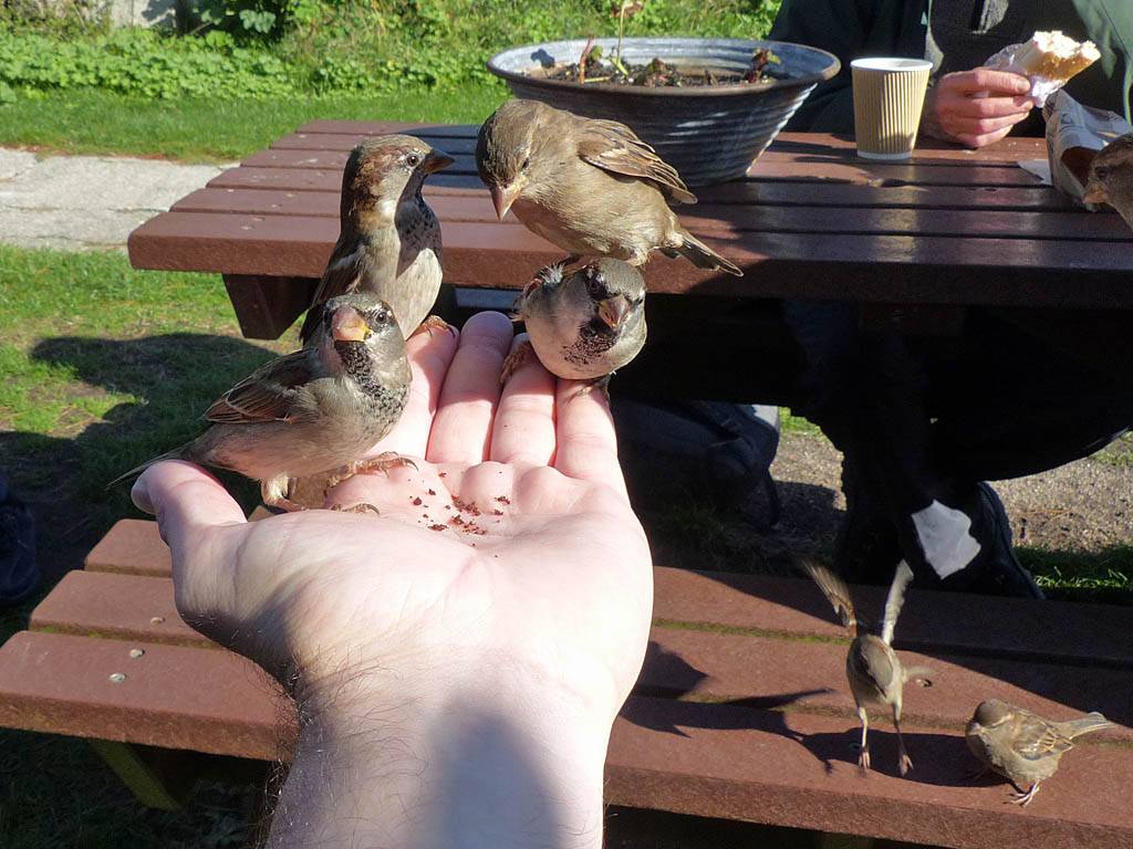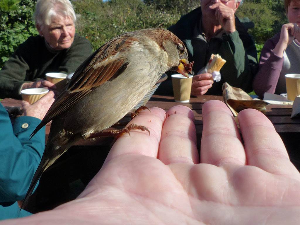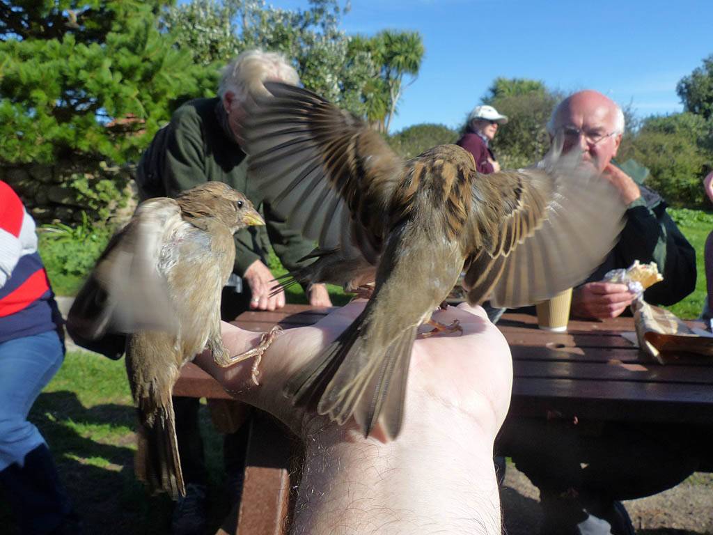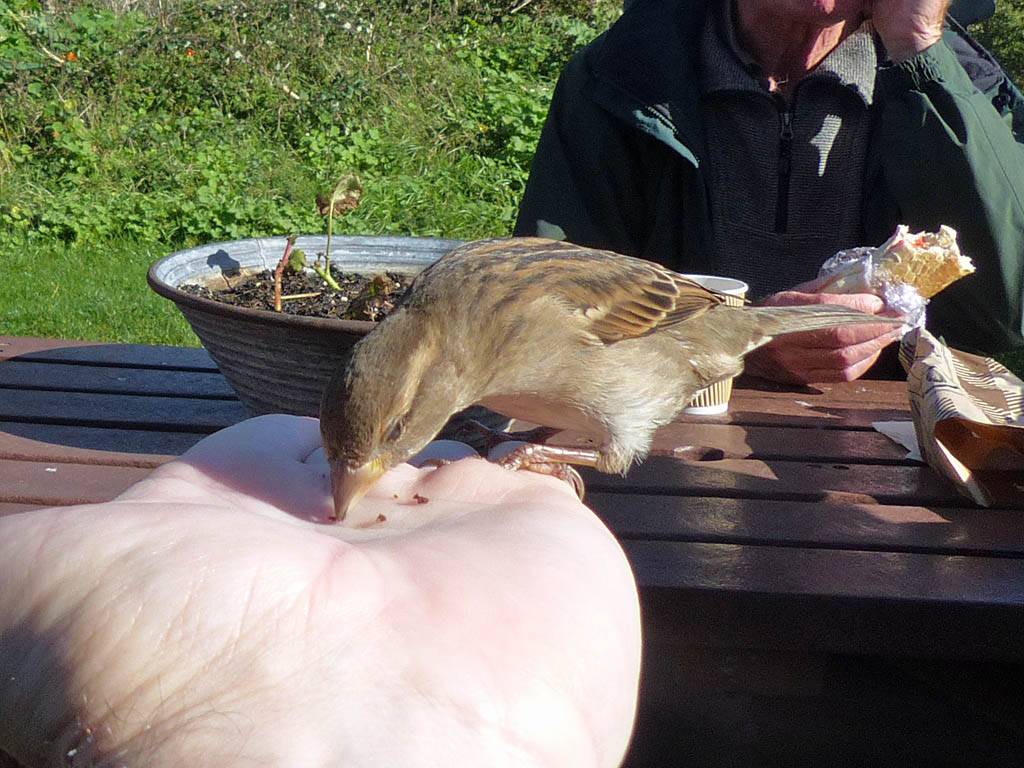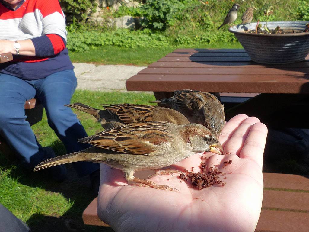 Cheers! Baileys and a Disarrono and Coke with a spectacular view across to St. Mary's and Tresco. | Like at the bakery, the Sparrows are very tame and explored very close to us to see if we had any food. |