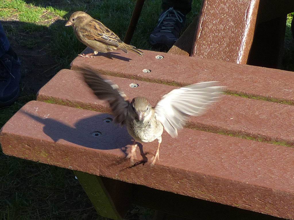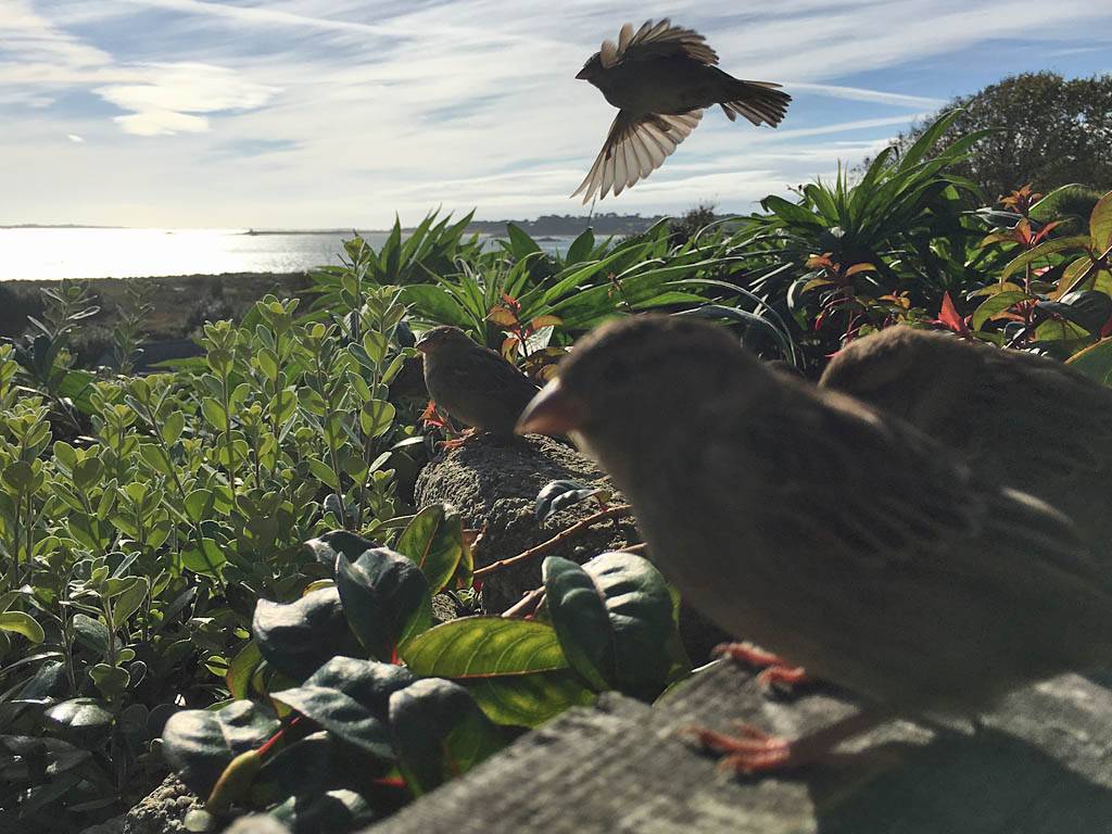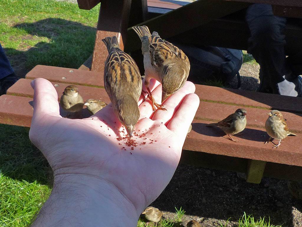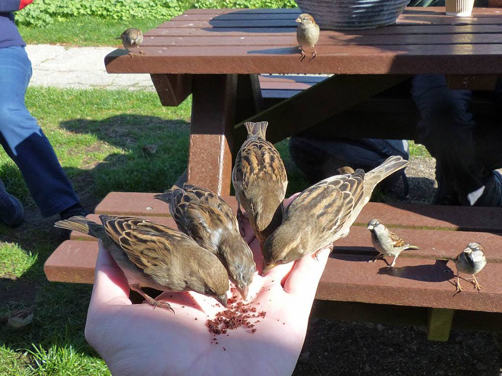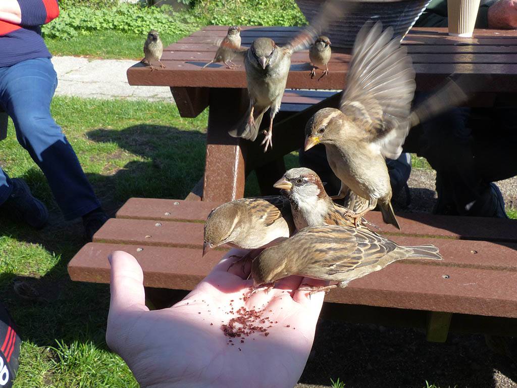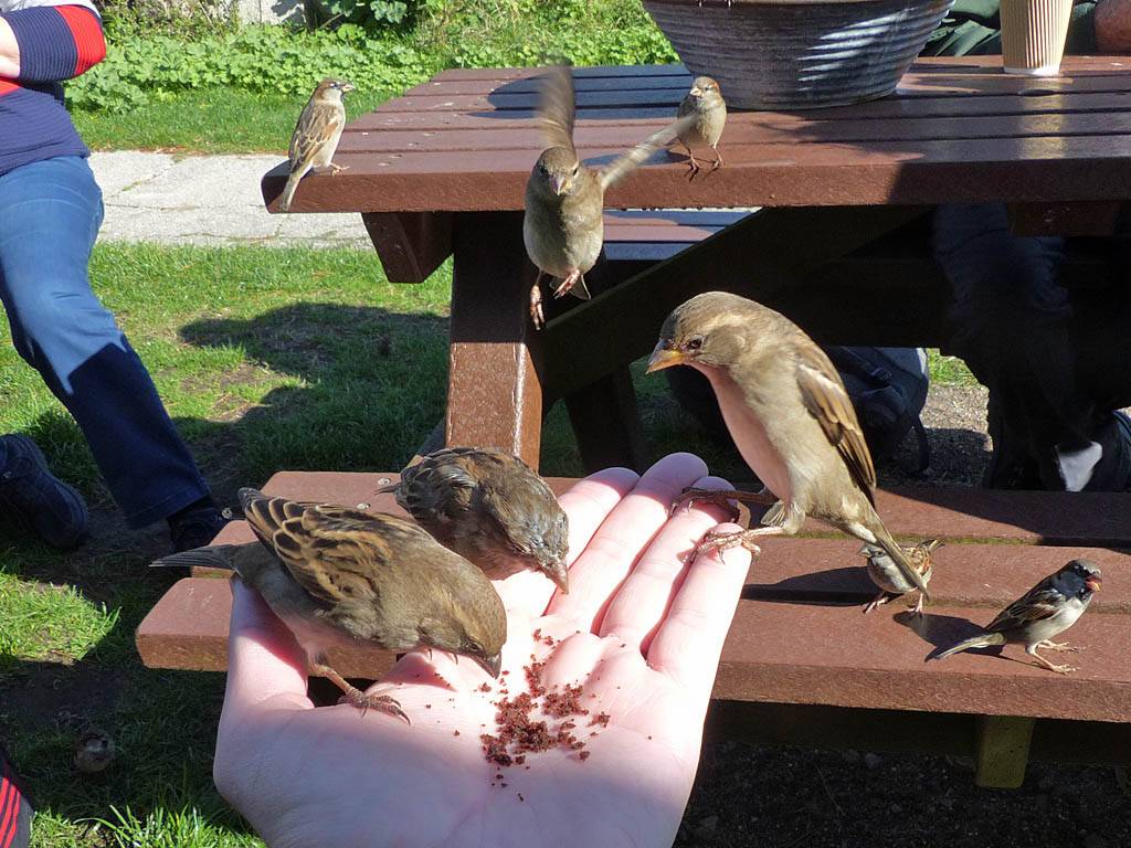 Cheers! Baileys and a Disarrono and Coke with a spectacular view across to St. Mary's and Tresco. | Like at the bakery, the Sparrows are very tame and explored very close to us to see if we had any food. |
