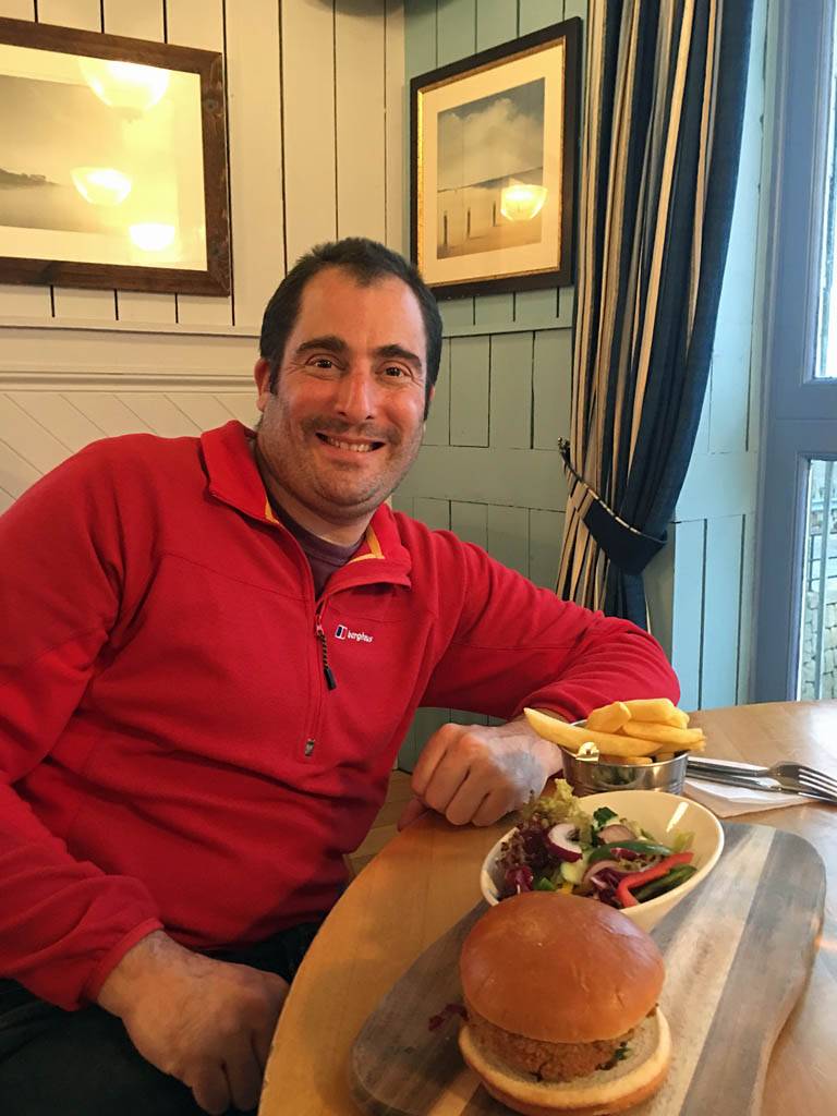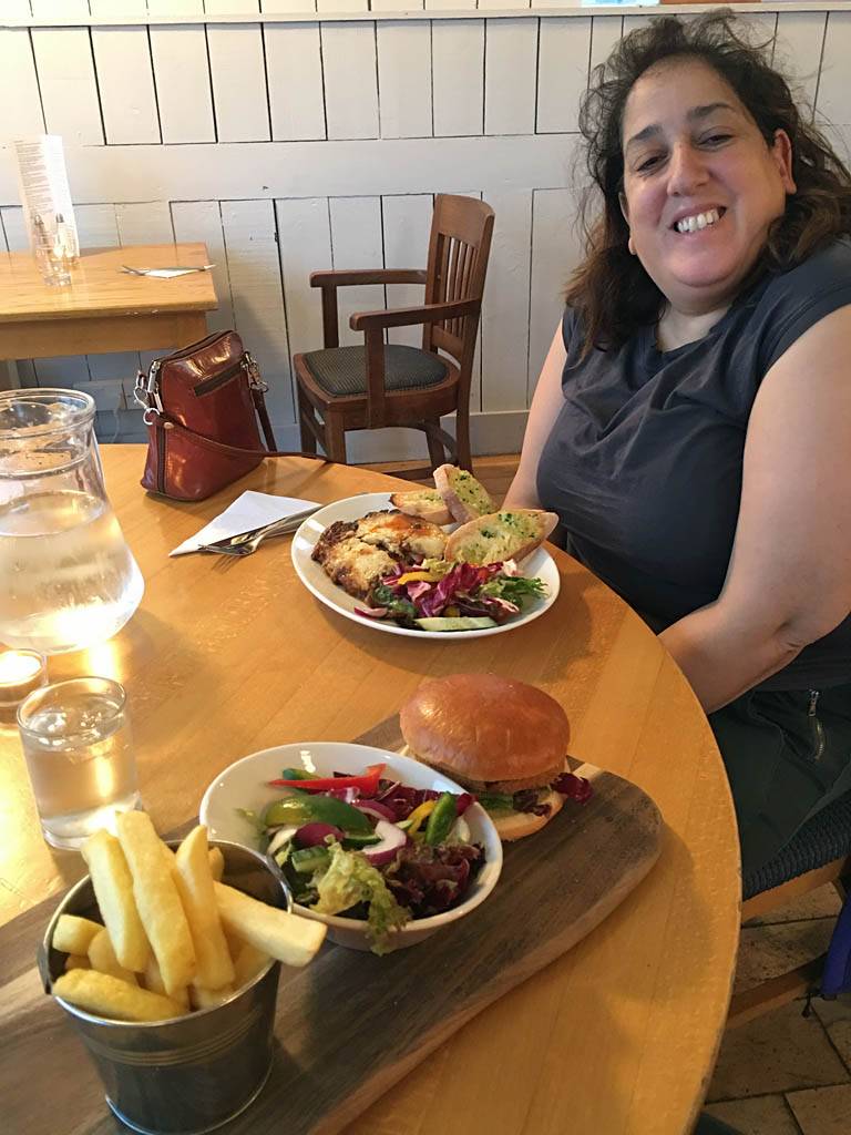 We set off at 6PM for the Mermaid Inn. It was now drizzling. We were glad the rain had held off until the evening. We were the only ones in the restaurant at first. I ordered the Roast Mediterranean vegetable burger. Renée ordered the beef lasagne. They were delicious! After a while a Yorkshireman arrived and we got chatting to him. We ordered sticky toffee pudding and chocolate ice cream for desert. It was a delicious meal and very good value.>/p>