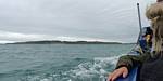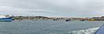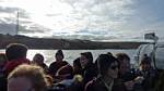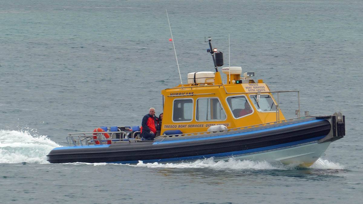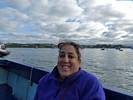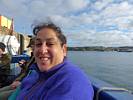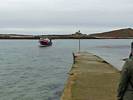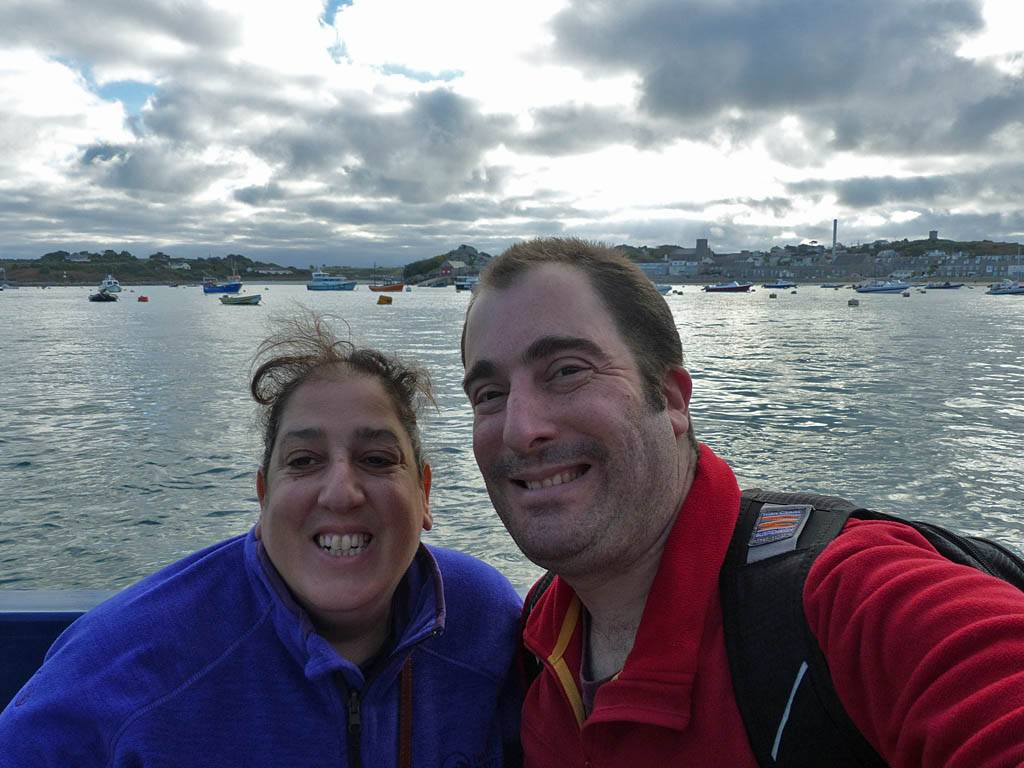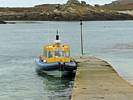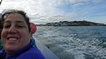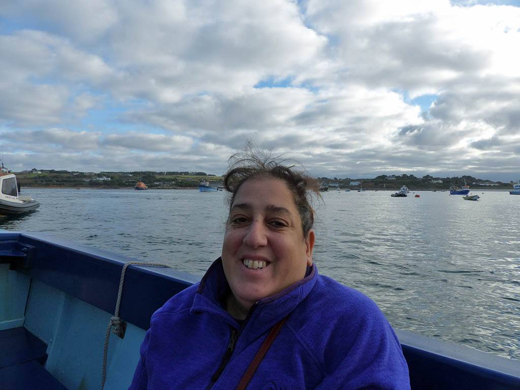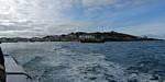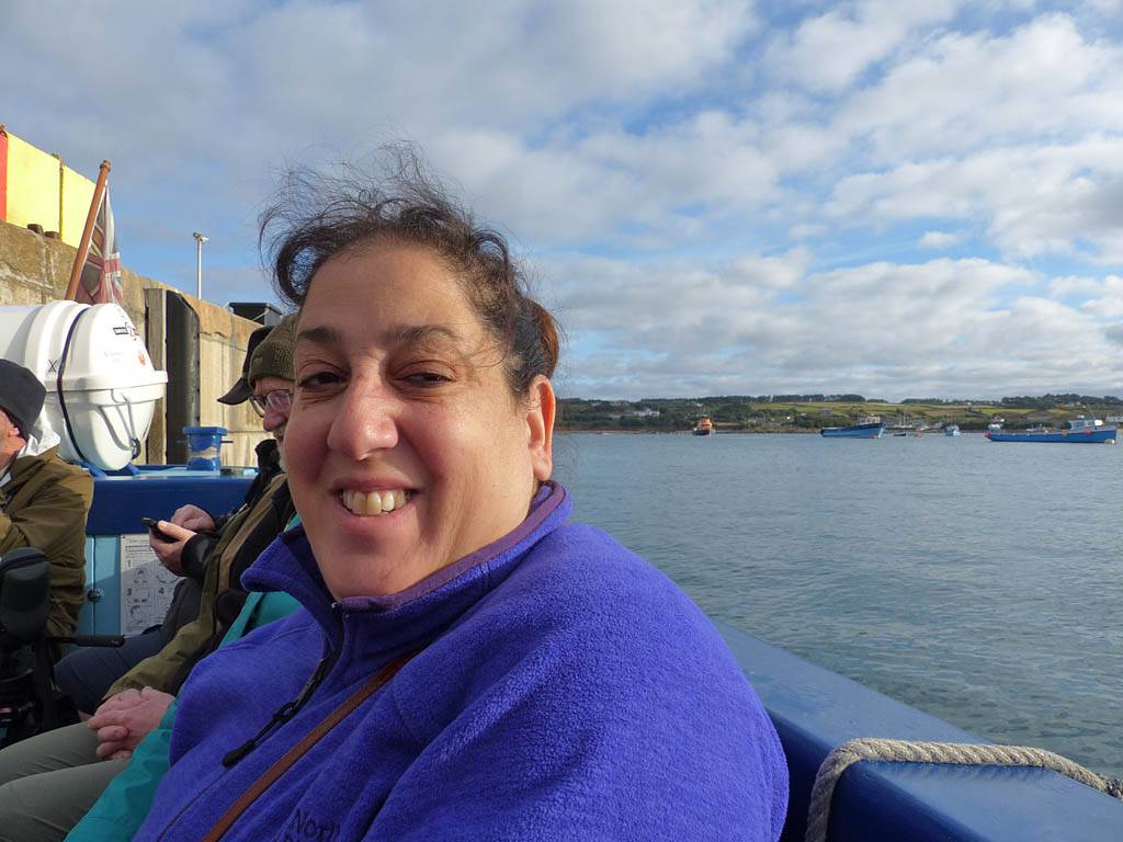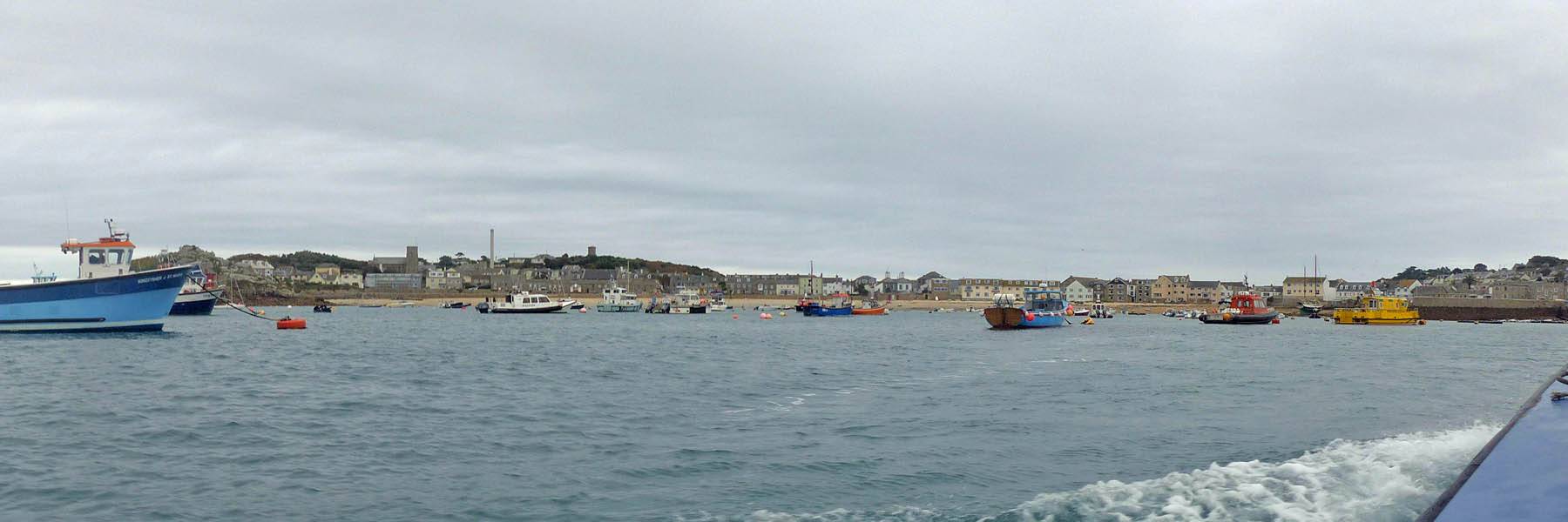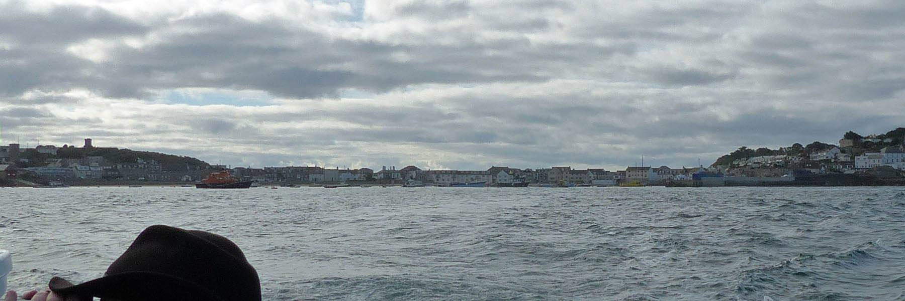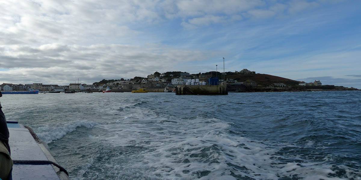 Renée enjoying the ride back. | Approaching St. Mary's Pool and Hugh Town. | Taylor's Island with its conical rock stack. | Entering the harbour. | Mooring up at the Quay. |