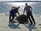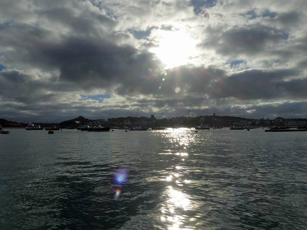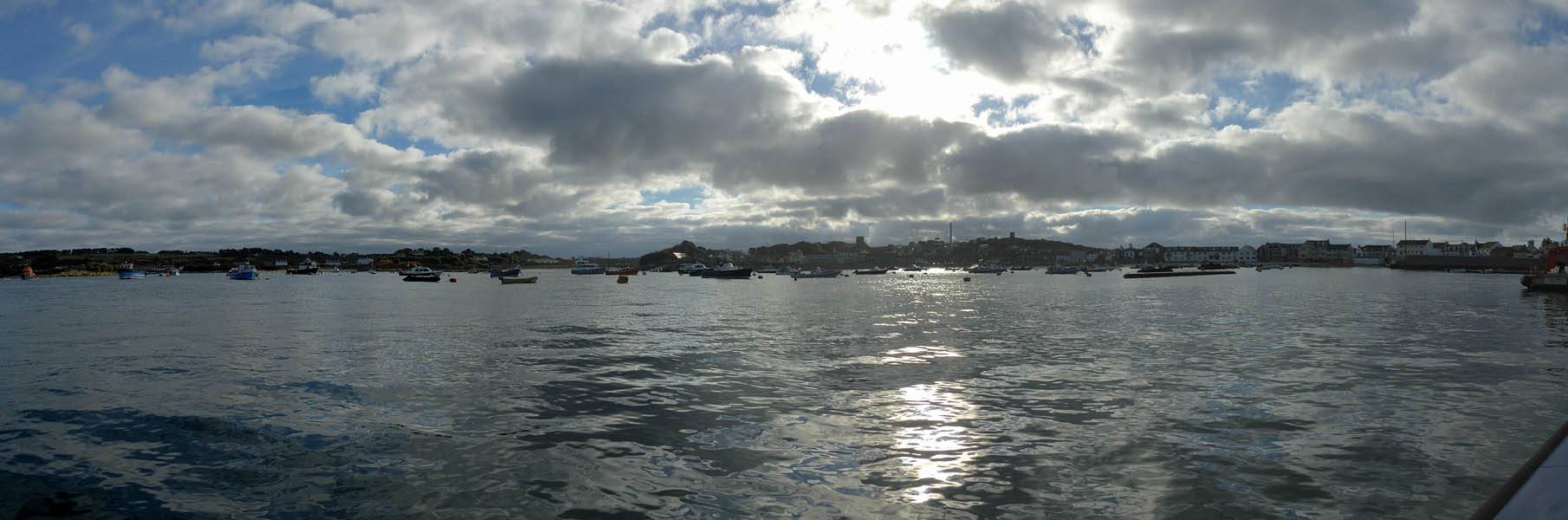 Getting ready to sail. | Leaving Hugh Town behind. | Looking at the Peninnis Head boulders as we pass them. |
