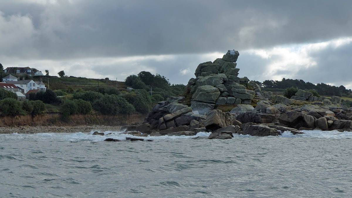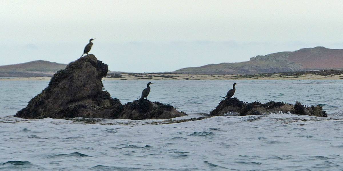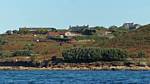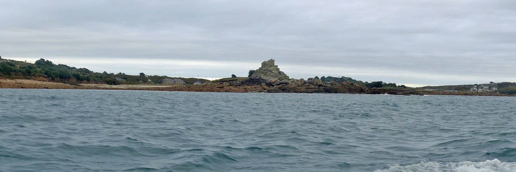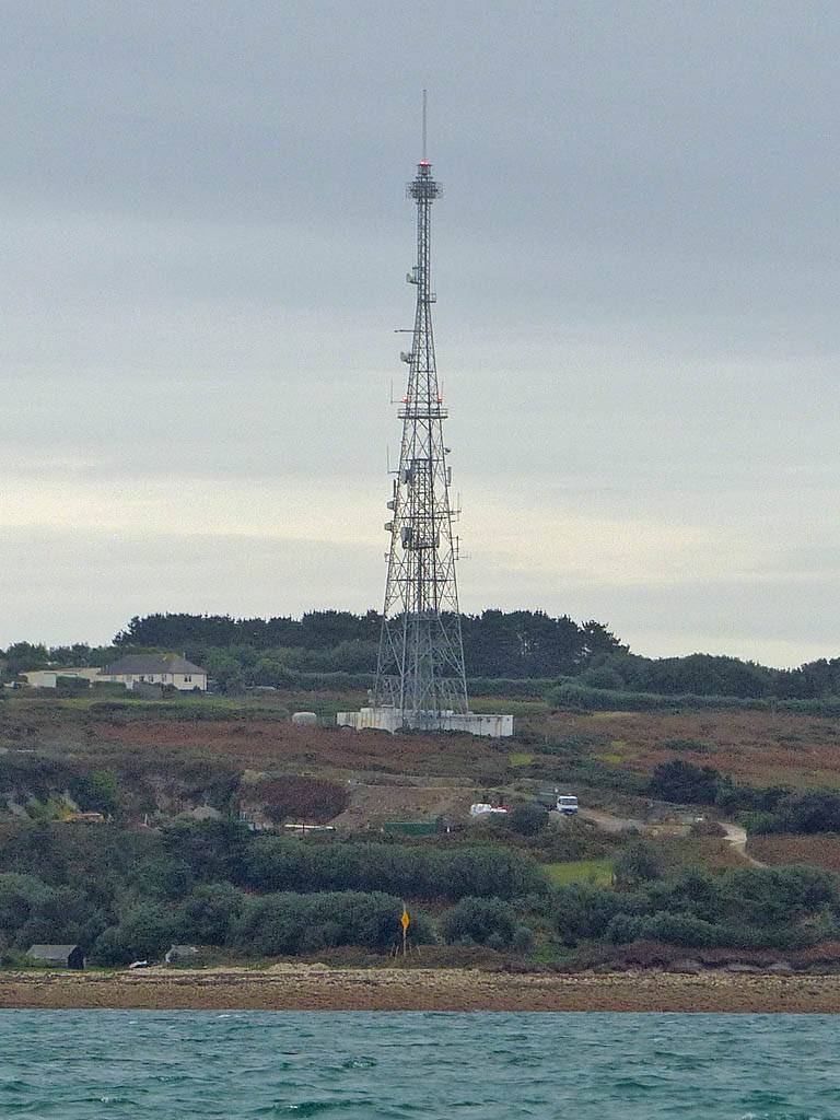 Departing Lower Town Quay and St. Martin's. | More Shags / Cormorants on rocks. | Guther's Island had some curiously stacked rocks. | The transmitter on St. Mary's. | Heading towards St. Mary's. |