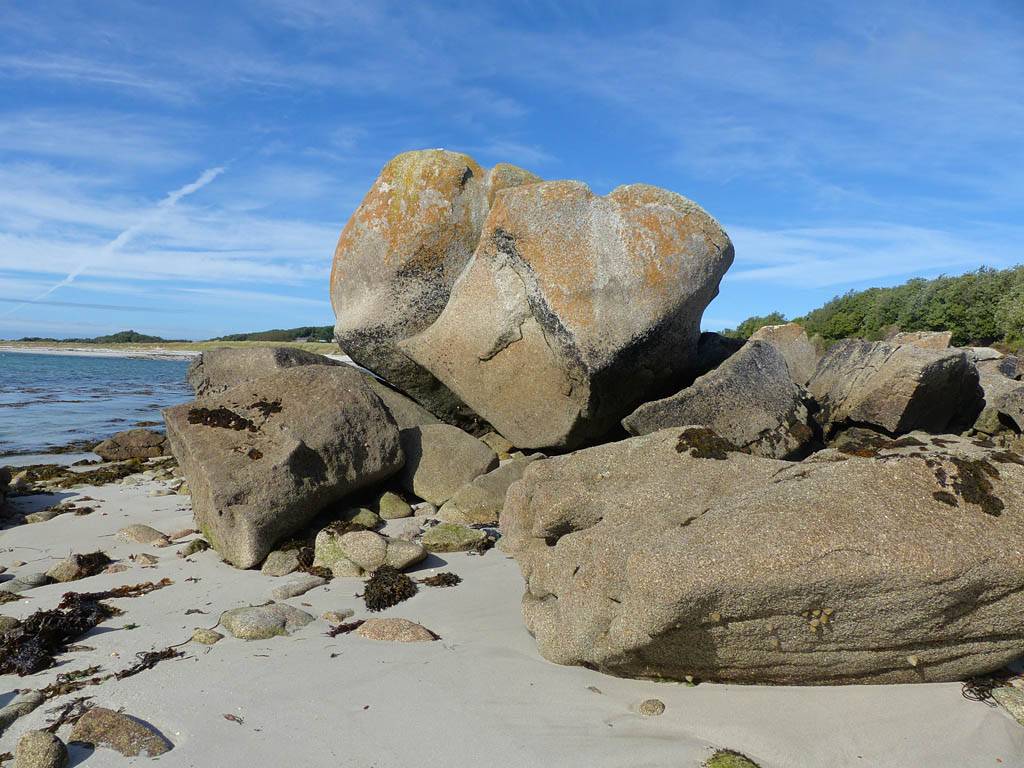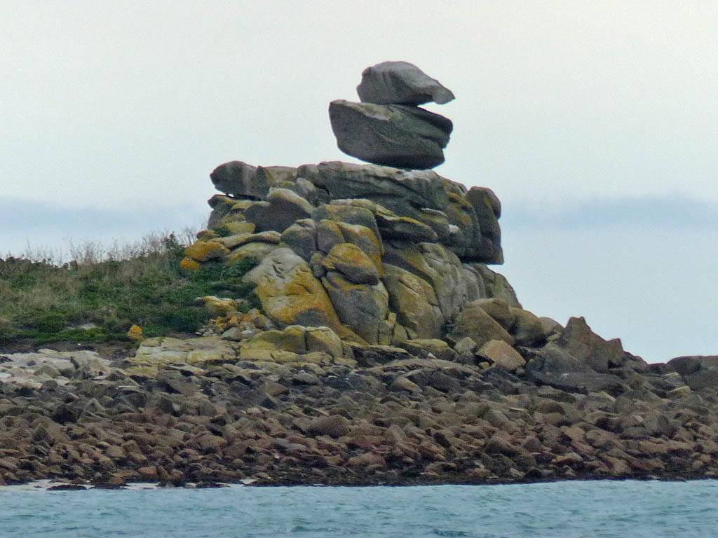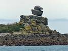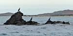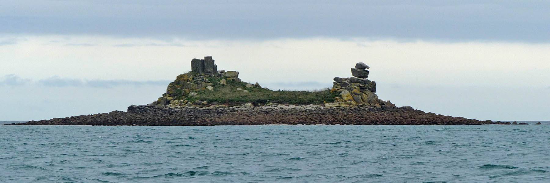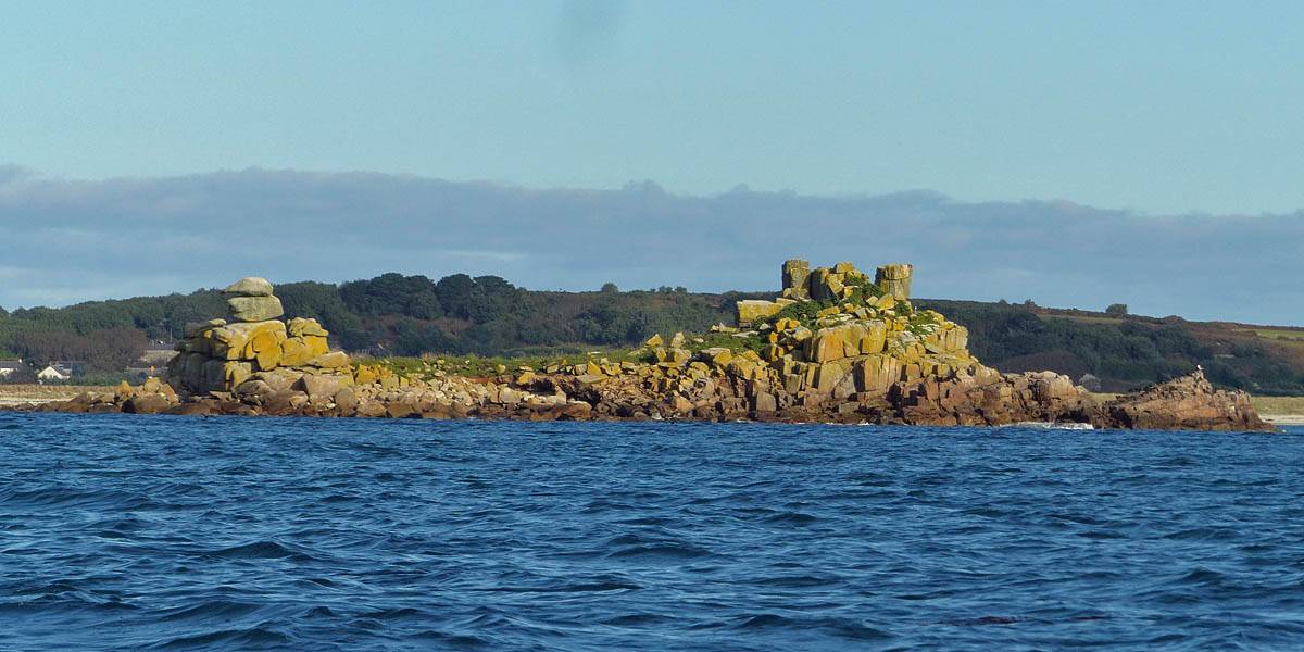 Departing Lower Town Quay and St. Martin's. | More Shags / Cormorants on rocks. | Guther's Island had some curiously stacked rocks. | The transmitter on St. Mary's. | Heading towards St. Mary's. |