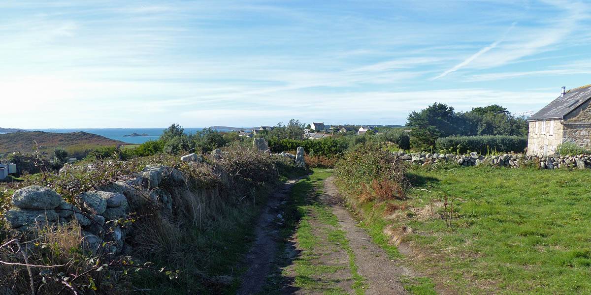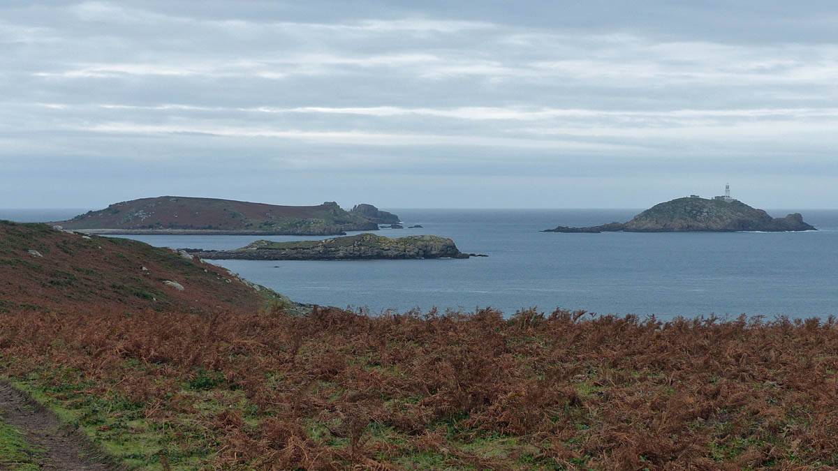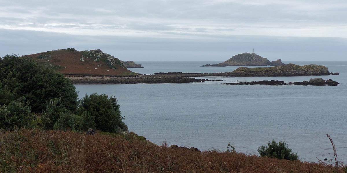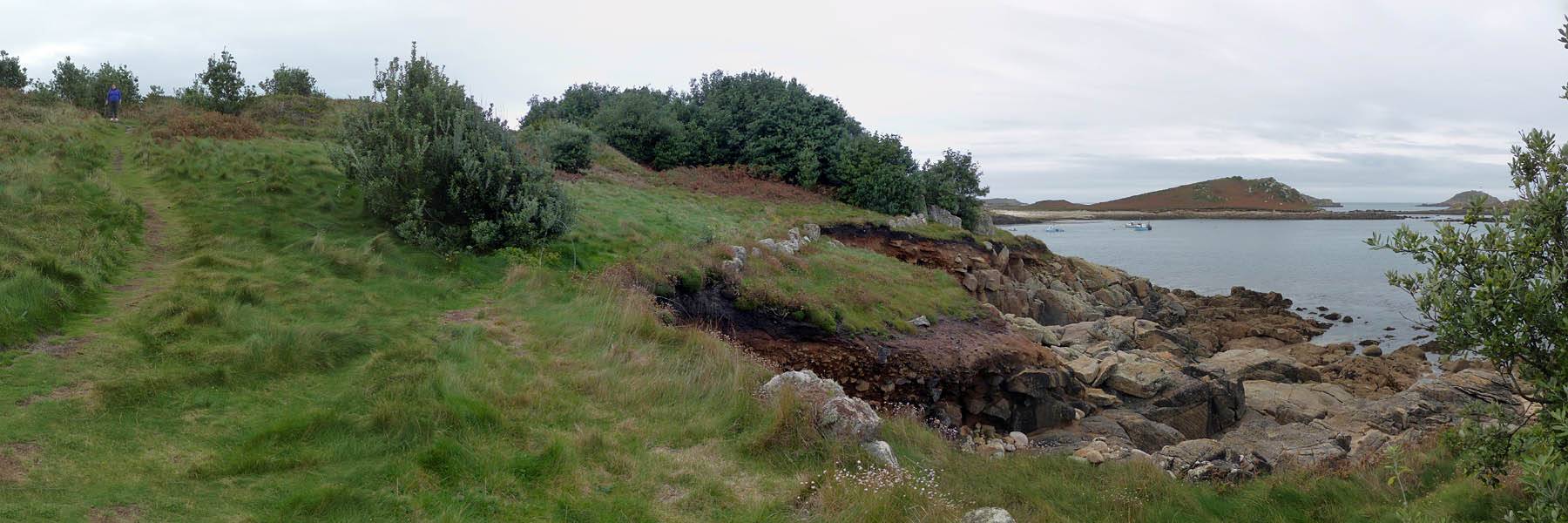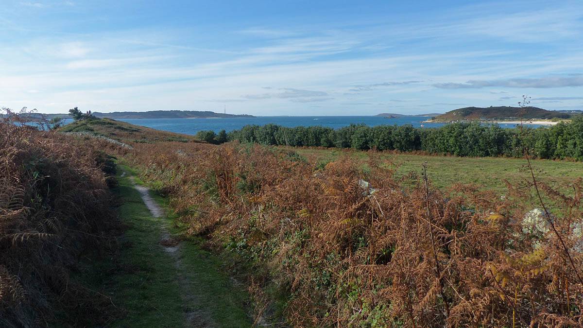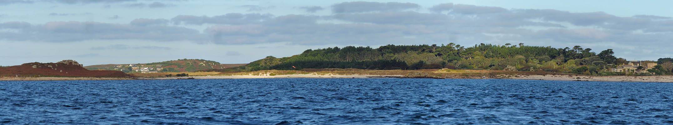 Looking back Eastwards along the East Coast past Bread and Cheese Cove to the Daymark. | The path enters a small pine forest above Lower Town. | Spectacular views out to the West and North including Tean, St. Helen's, Round Island and White Island. | A closer look at Round Island and its lighthouse. |