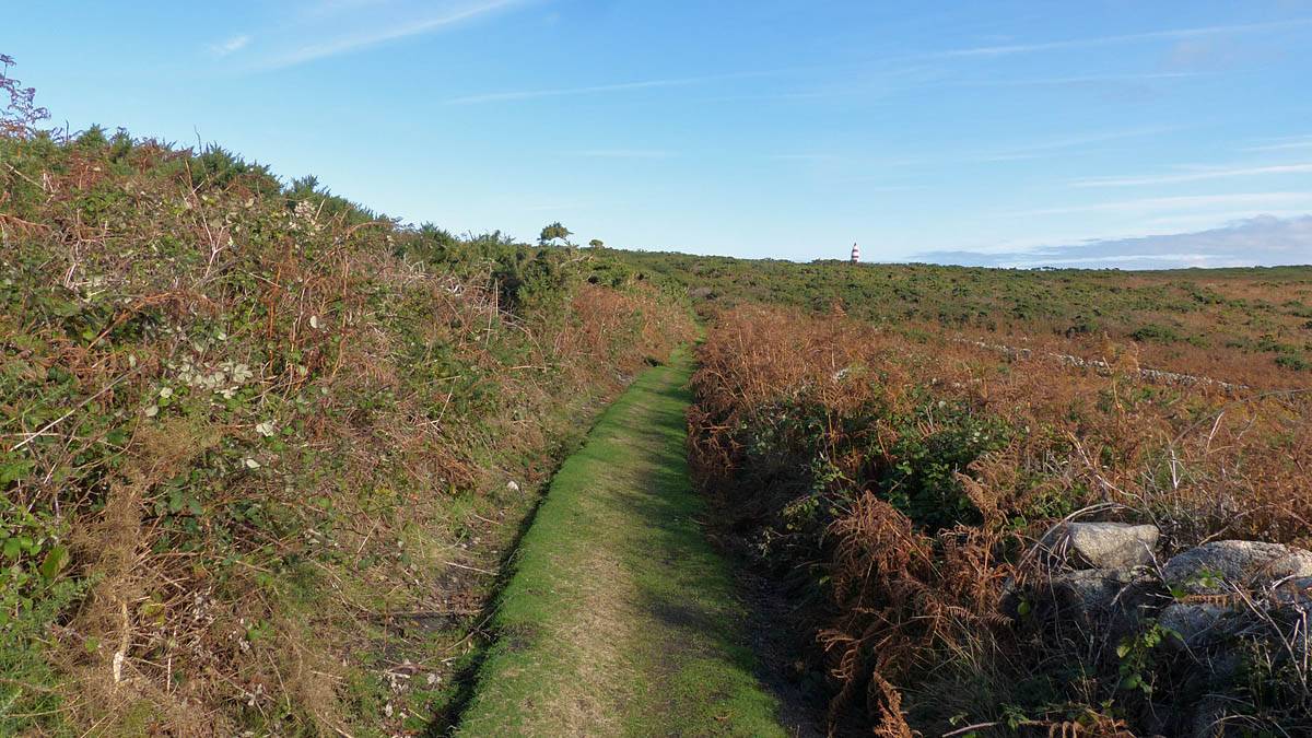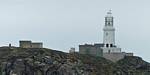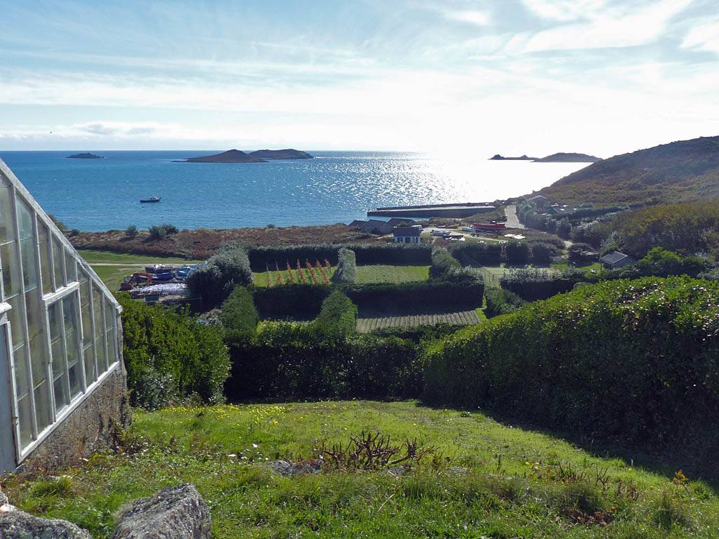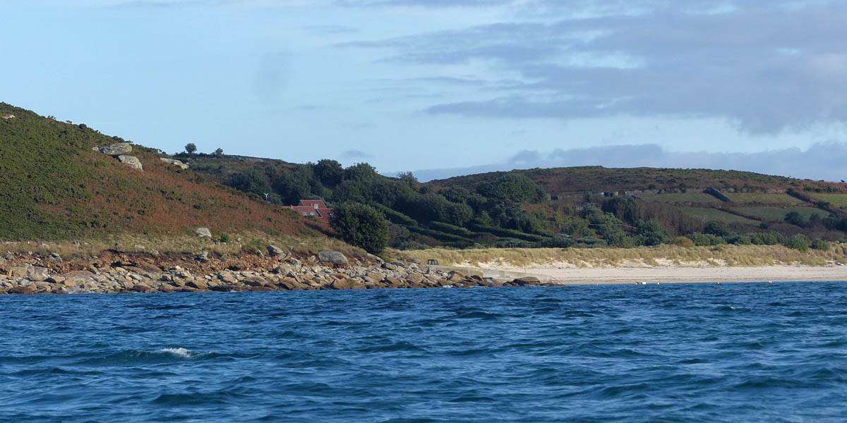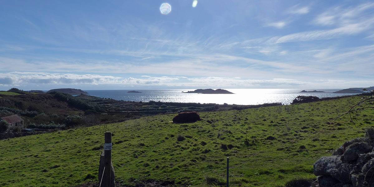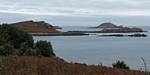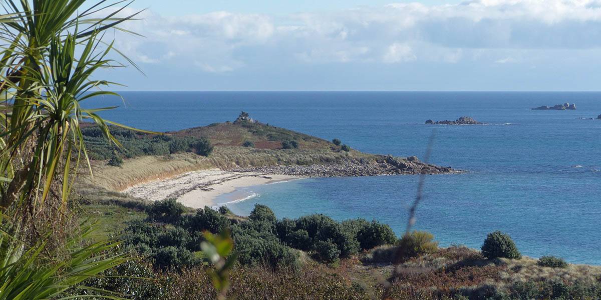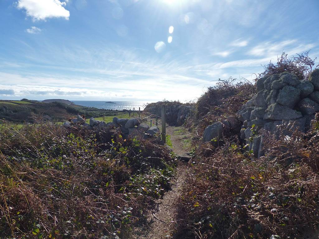Looking back Eastwards along the East Coast past Bread and Cheese Cove to the Daymark. | The path enters a small pine forest above Lower Town. | Spectacular views out to the West and North including Tean, St. Helen's, Round Island and White Island. | A closer look at Round Island and its lighthouse. |