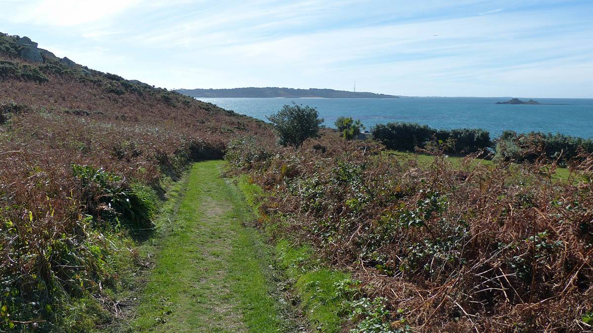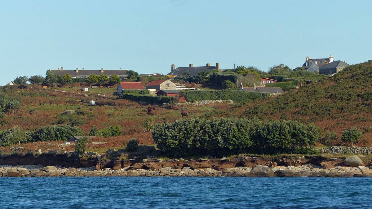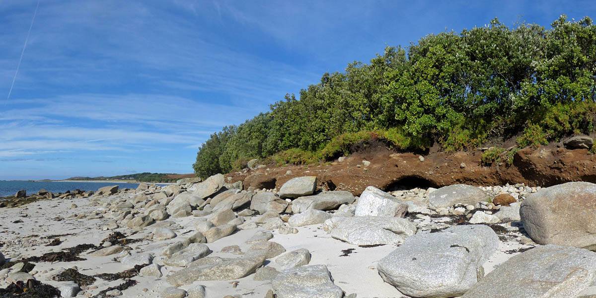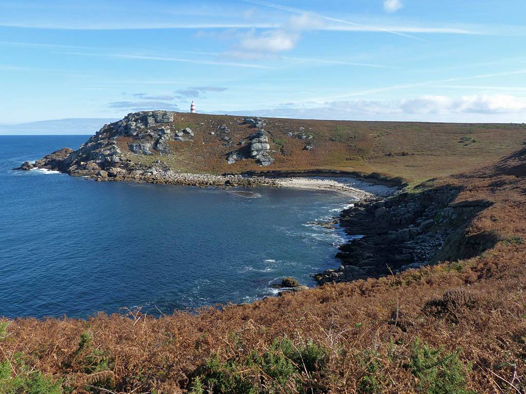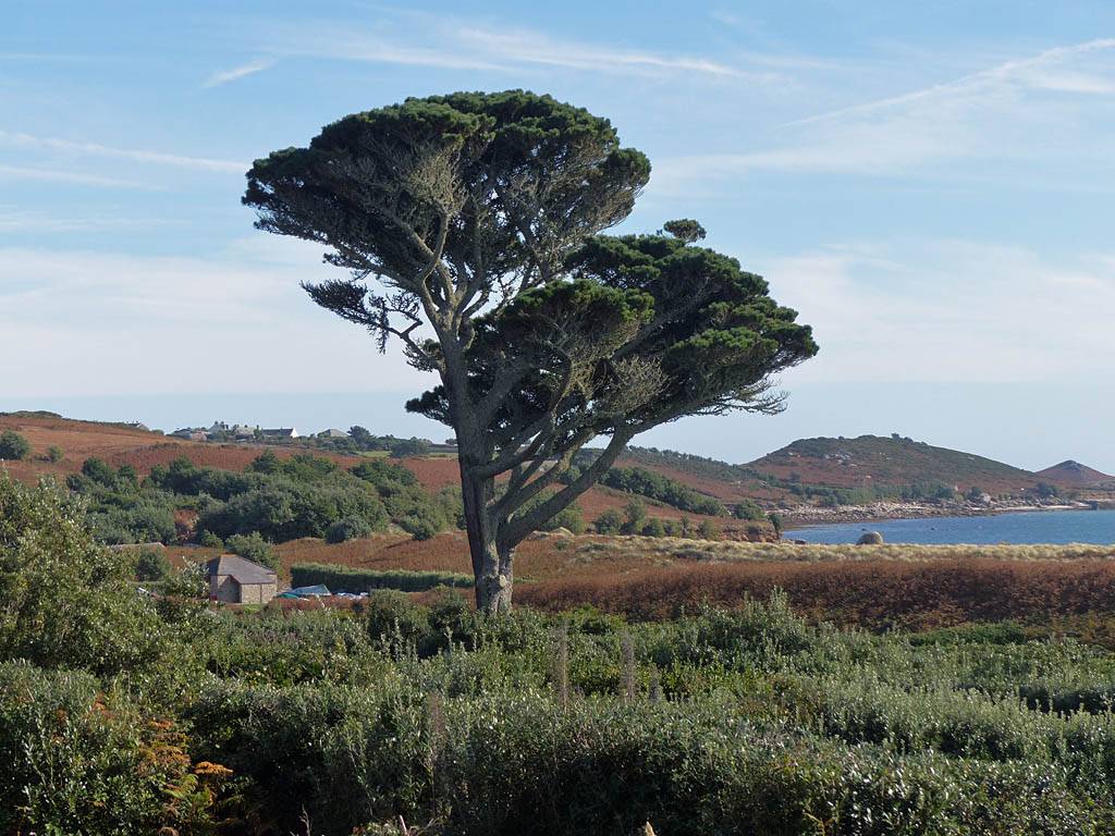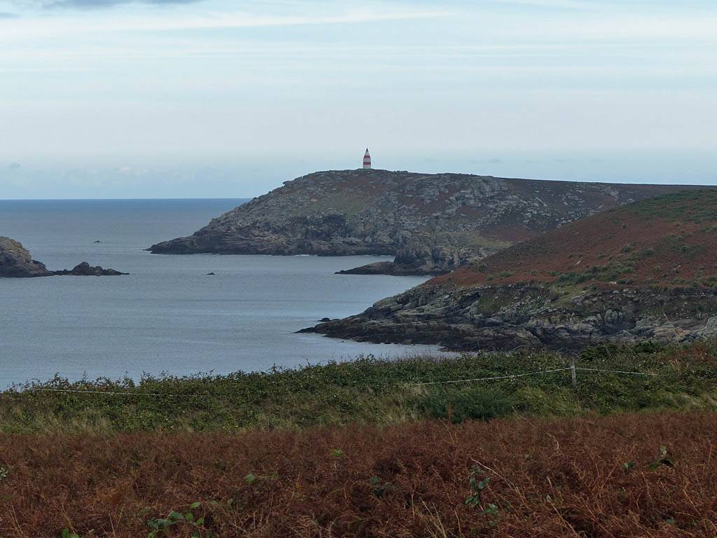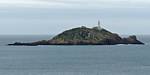 Looking back Eastwards along the East Coast past Bread and Cheese Cove to the Daymark. | The path enters a small pine forest above Lower Town. | Spectacular views out to the West and North including Tean, St. Helen's, Round Island and White Island. | A closer look at Round Island and its lighthouse. |