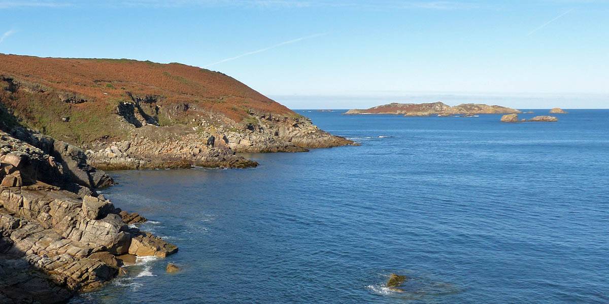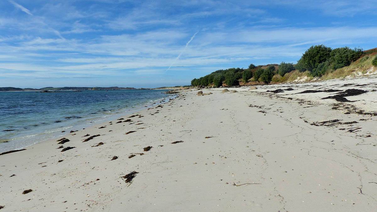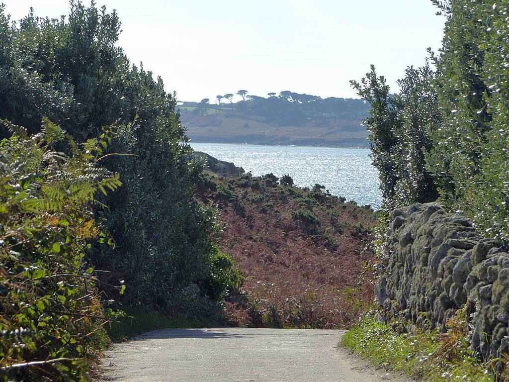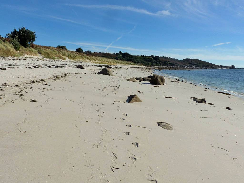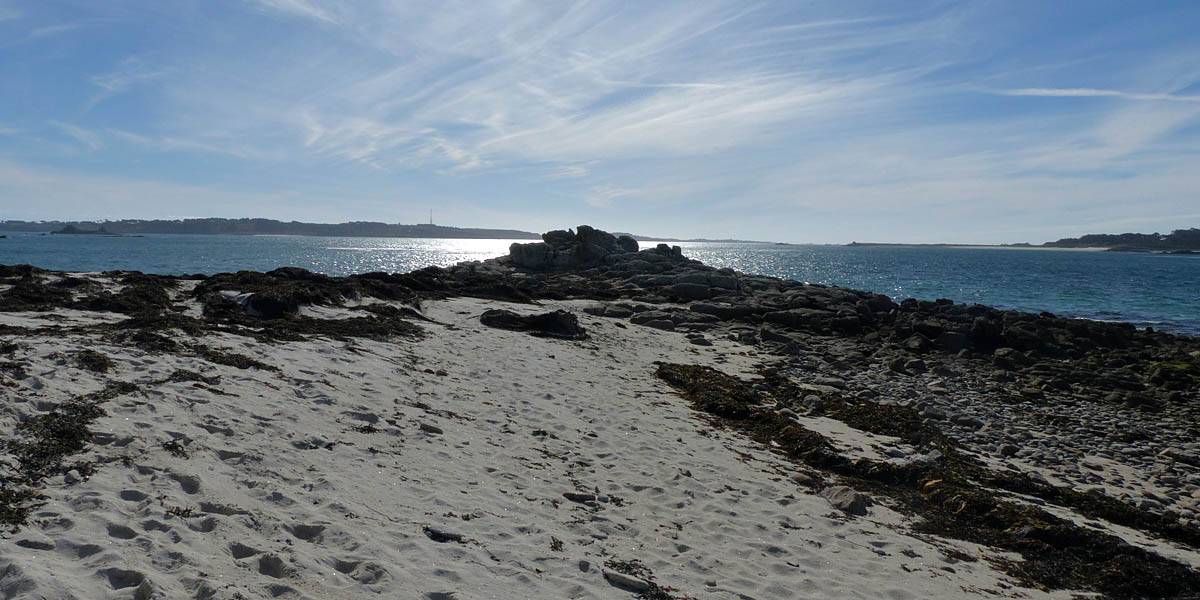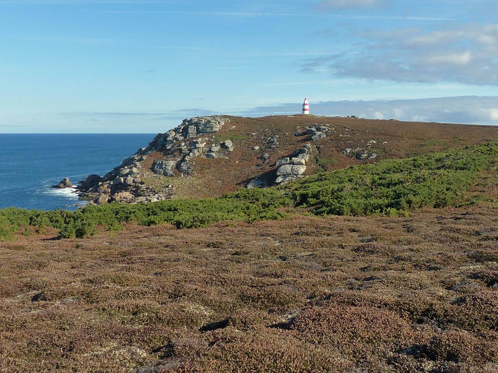 Looking back Eastwards along the East Coast past Bread and Cheese Cove to the Daymark. | The path enters a small pine forest above Lower Town. | Spectacular views out to the West and North including Tean, St. Helen's, Round Island and White Island. | A closer look at Round Island and its lighthouse. |