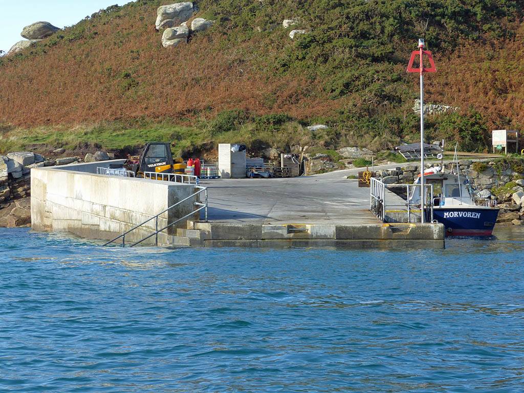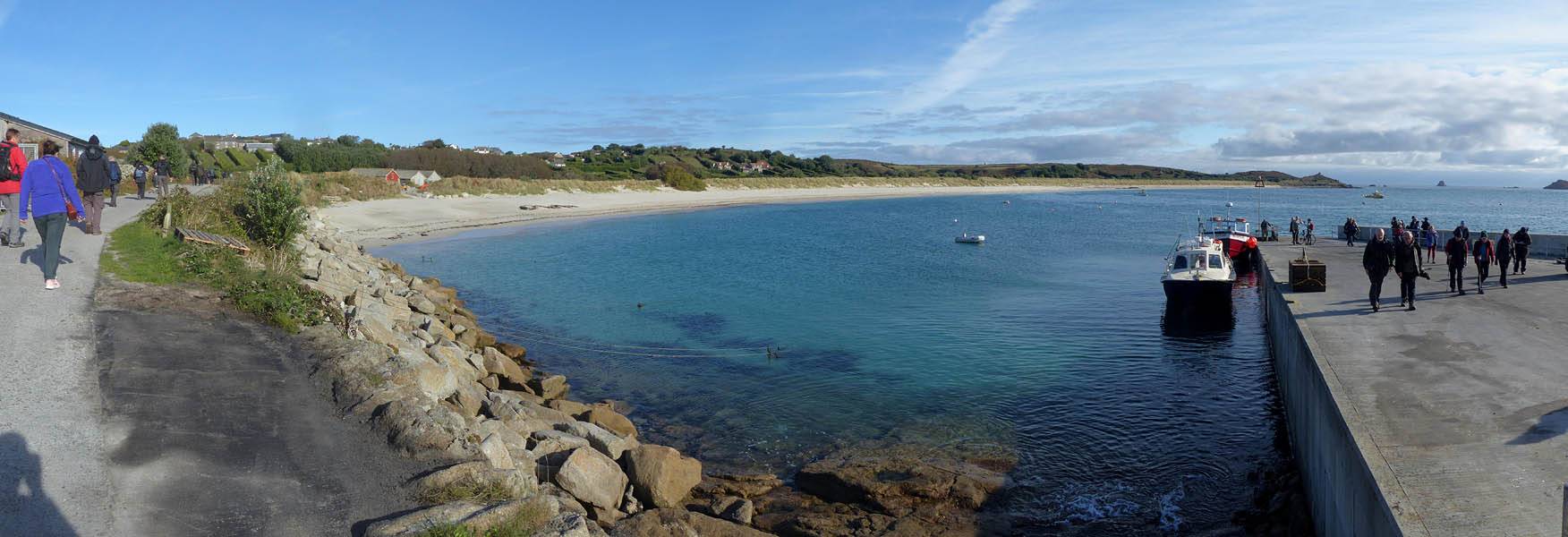 Lower Town Quay. | One of the Tresco boats arriving. | The Surprise boat arriving to take us back to Hugh Town. | One more view Southwards as the Tresco boat departs. | Walking down the quay as the boat moves in to dock. |
