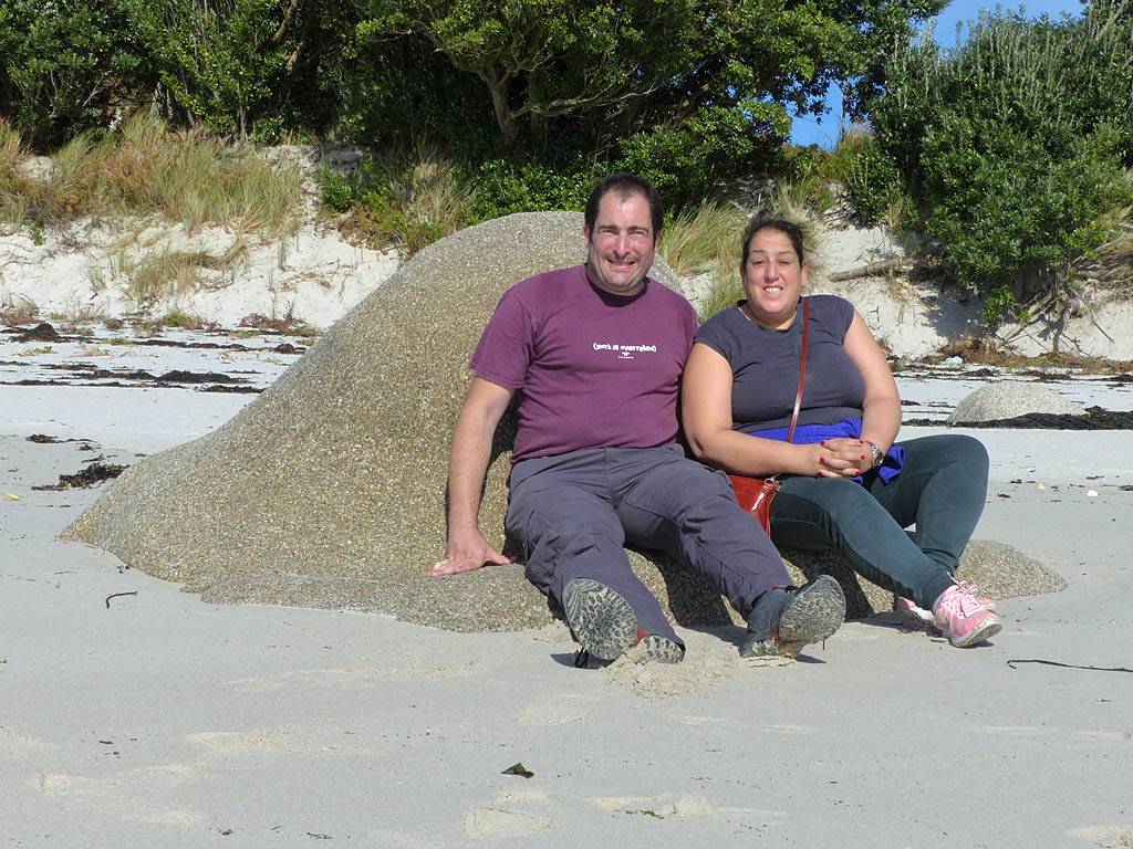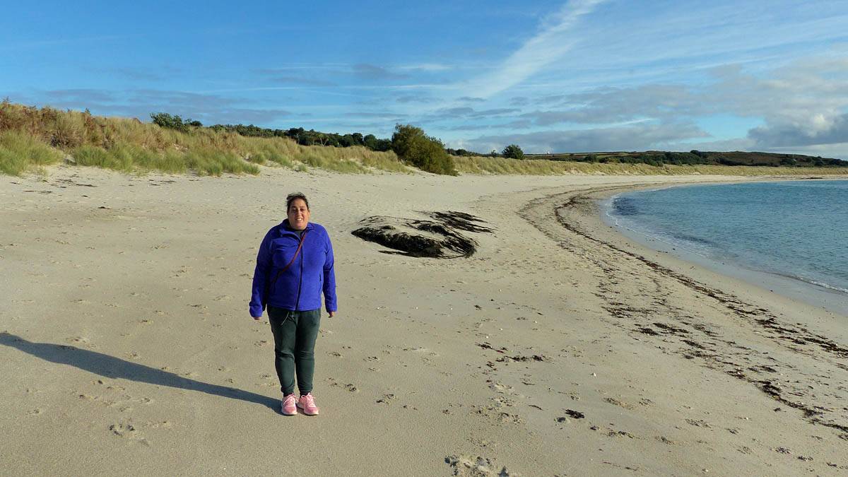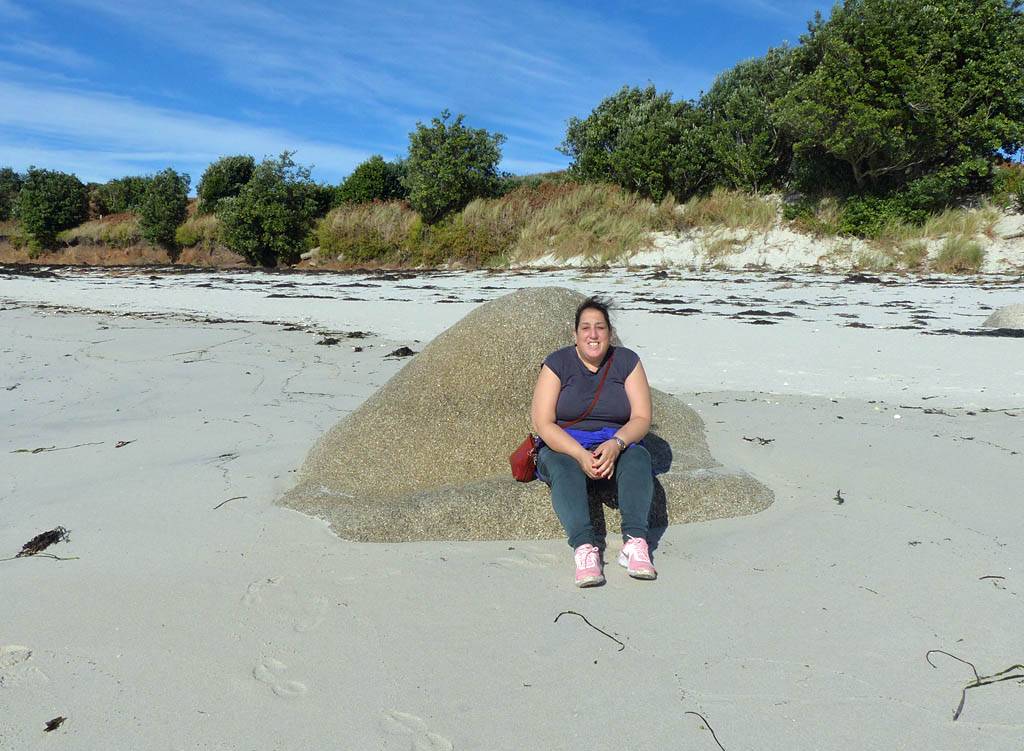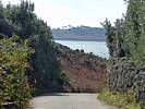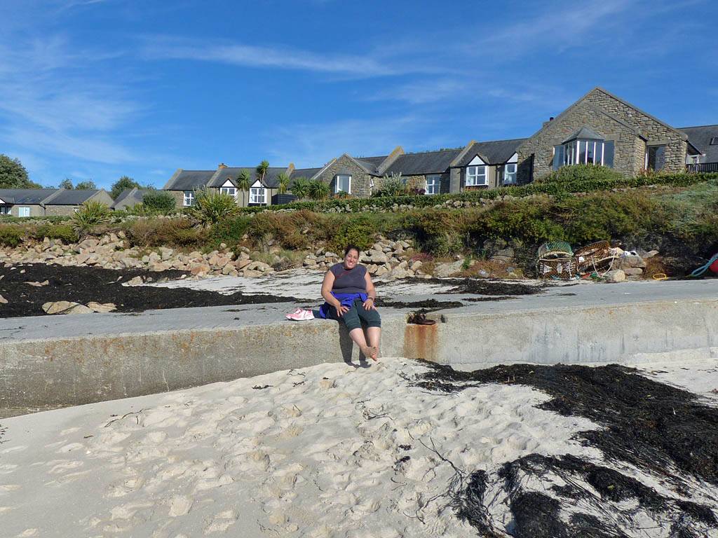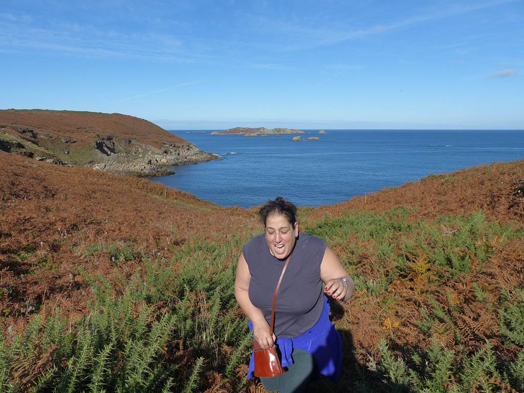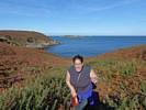 Views of the islands between St. Martin's and Tresco. | Meeting Renée back at the seating area by Karma. | Showing Renée the view just up the hill from the seating area. |