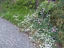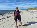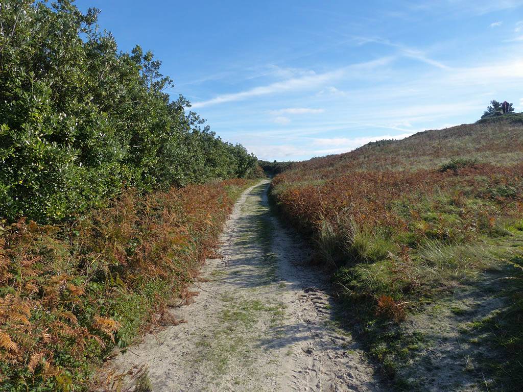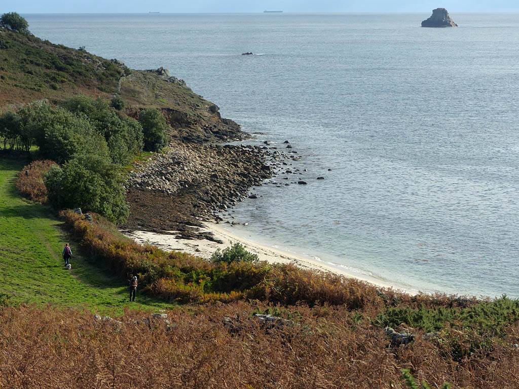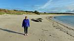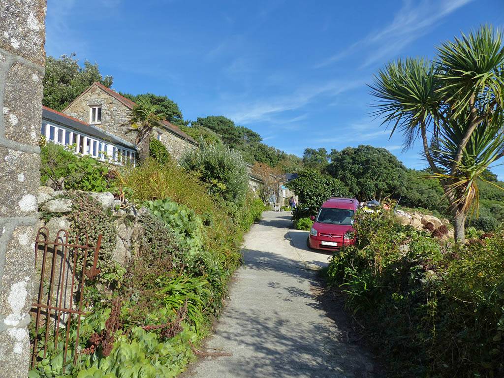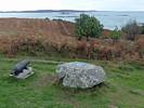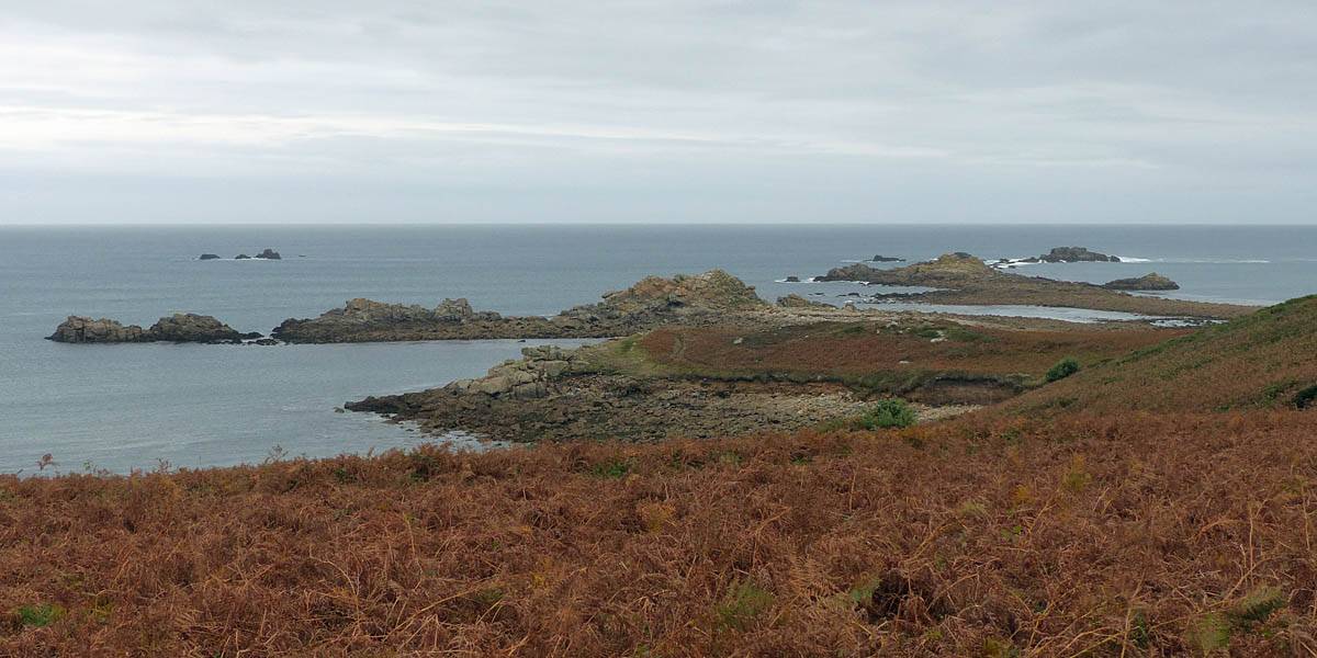 At 3:15PM in Middle Town I wanted to go up the hill and round a hill top circuit but Renée didn't. So she headed back down the path to the quay to sit at the tables and chairs there, while I carried on Southeastwards up the path to a camp site and the island hall. Then I went round and along the top of the ridge above Middle Town. Up here were brambles, heathers and bracken. I followed the path past Tinkler's Hill. At this point the view towards the islands of Tean and St. Helen's was spectacular, as was the view across a myriad of rocks exposed by low tide, to Tresco in the distance. I soon descended to Karma and reached Renée at 3:40PM. I took Renée 5 minutes up the hill to show her the view which she appreciated. Then we returned to the quay at 3:50PM.