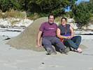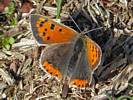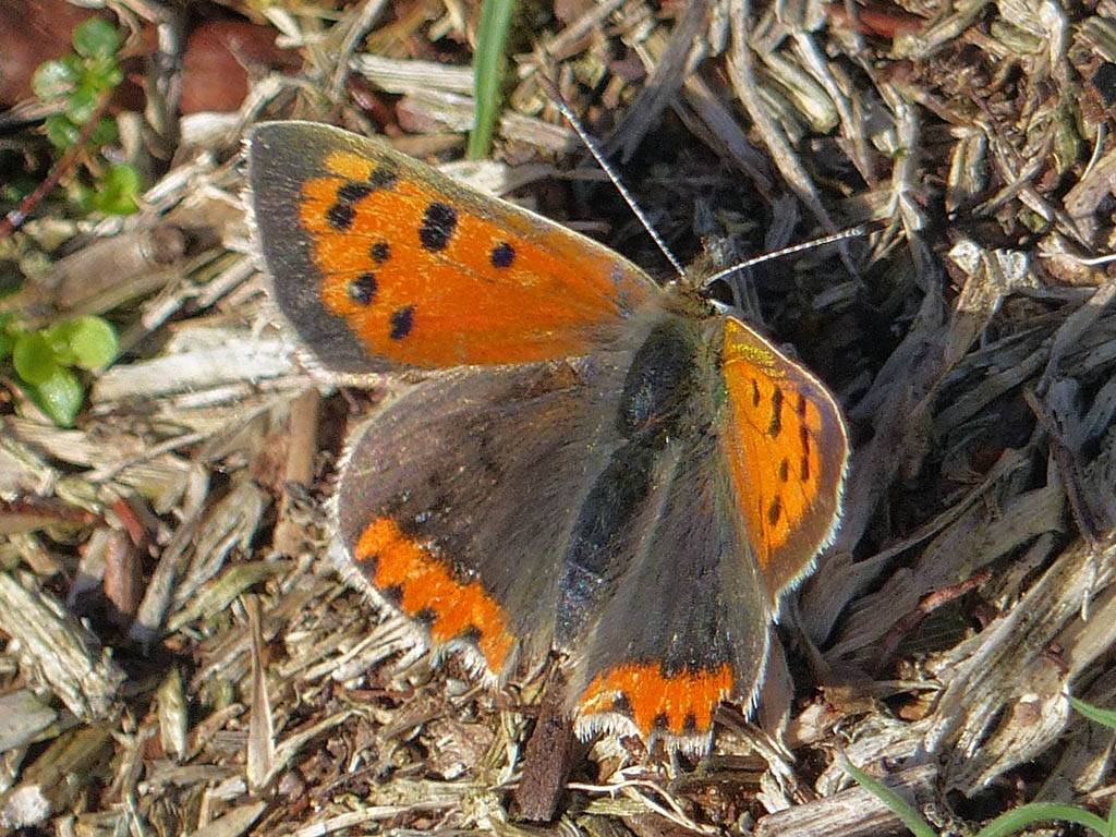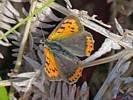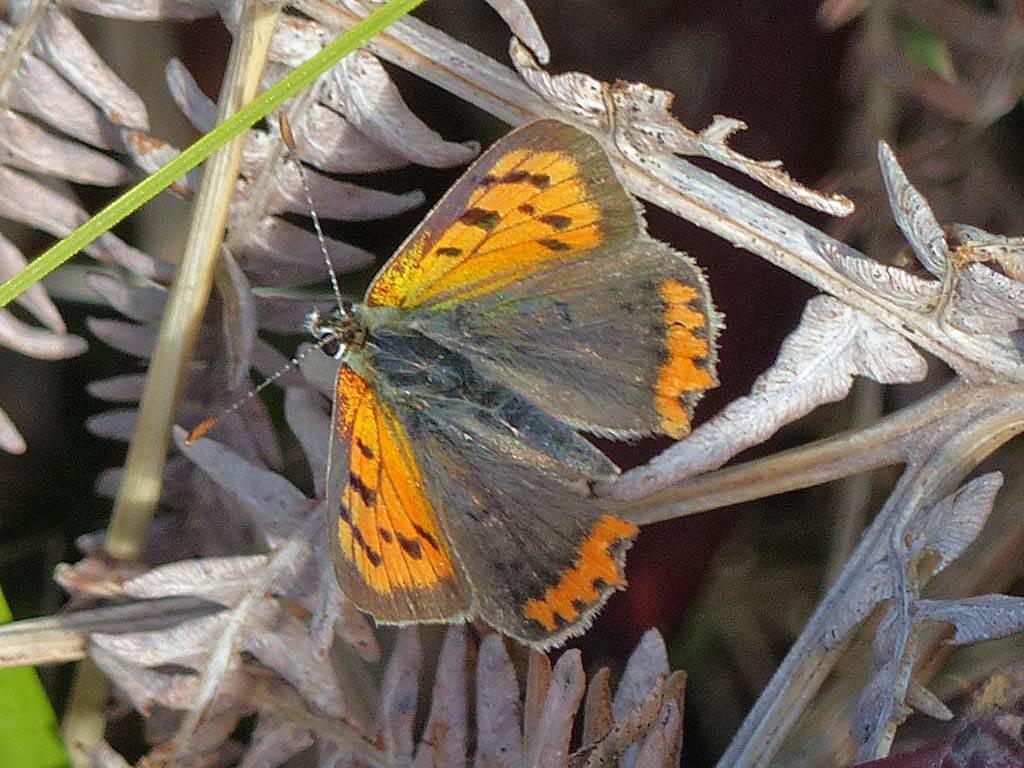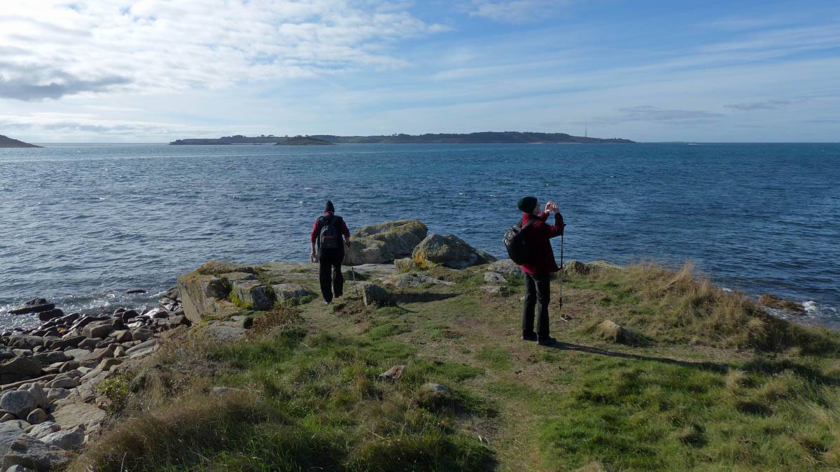 Climbing up onto a track at the Eastern end of the beach. | English Island Point was an excellent scenic point, both by the sea and on top of a small hill. Thanks to the fellow walkers for not minding me taking these pictures. | The Daymark was a prominant landmark to the Northeast. | A Small Copper butterfly basking in the sunshine on the bracken. |