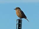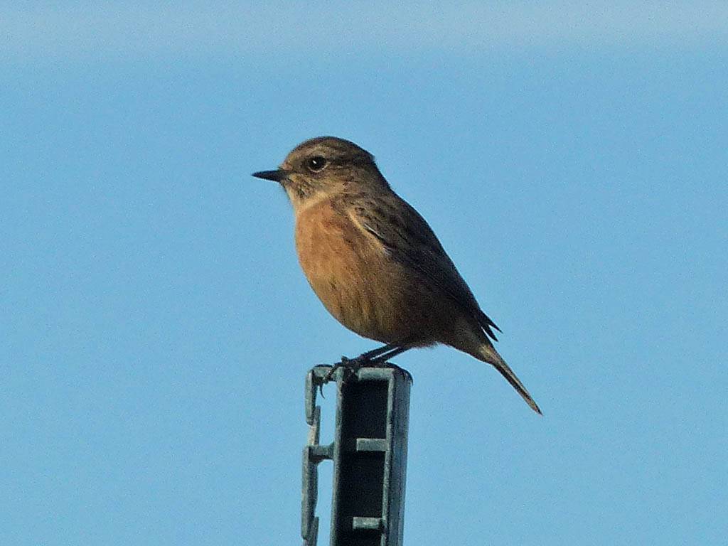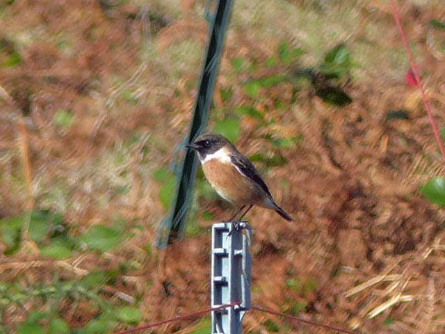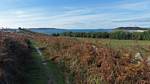 From a small hill three quarters of the way along Bread and Cheese cove the views were fantastic. To the East the Daymark was visible again. To the West the path continued over Burnt Hill and beyond. | A Male Stonechat eyeing us from an electric fence post. | Stopping at a bench to soak in the fresh air and views between Burnt Hill and the Bread and Cheese Cove viewpoint hill. |