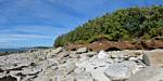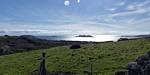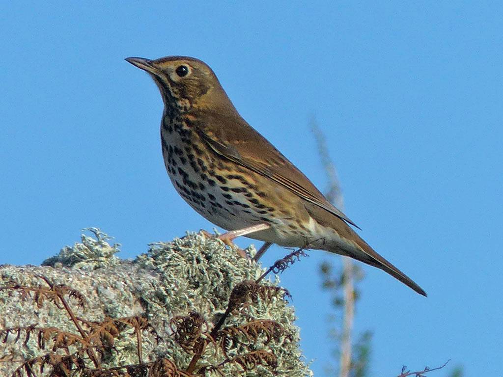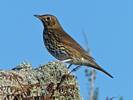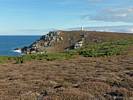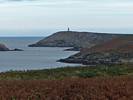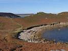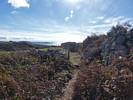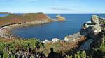 Looking back at English Island Point as we head away inland to the North. | A Song Thrush. | Looking down at Perpitch and Brandy Point to the East. | Continuing North-Northeast along the track. The Daymark is still prominant to the Northeast and Gorse is still flowering here. | The Eastern Isles to the Southeast. Great Ganilly is the biggest one. |