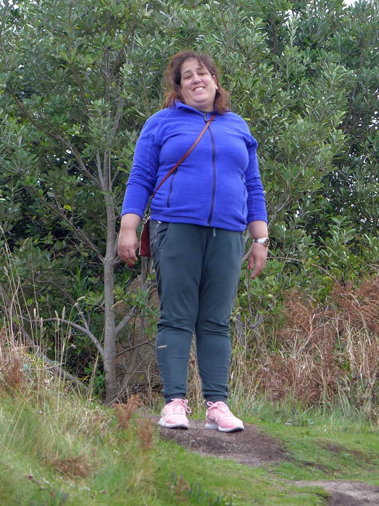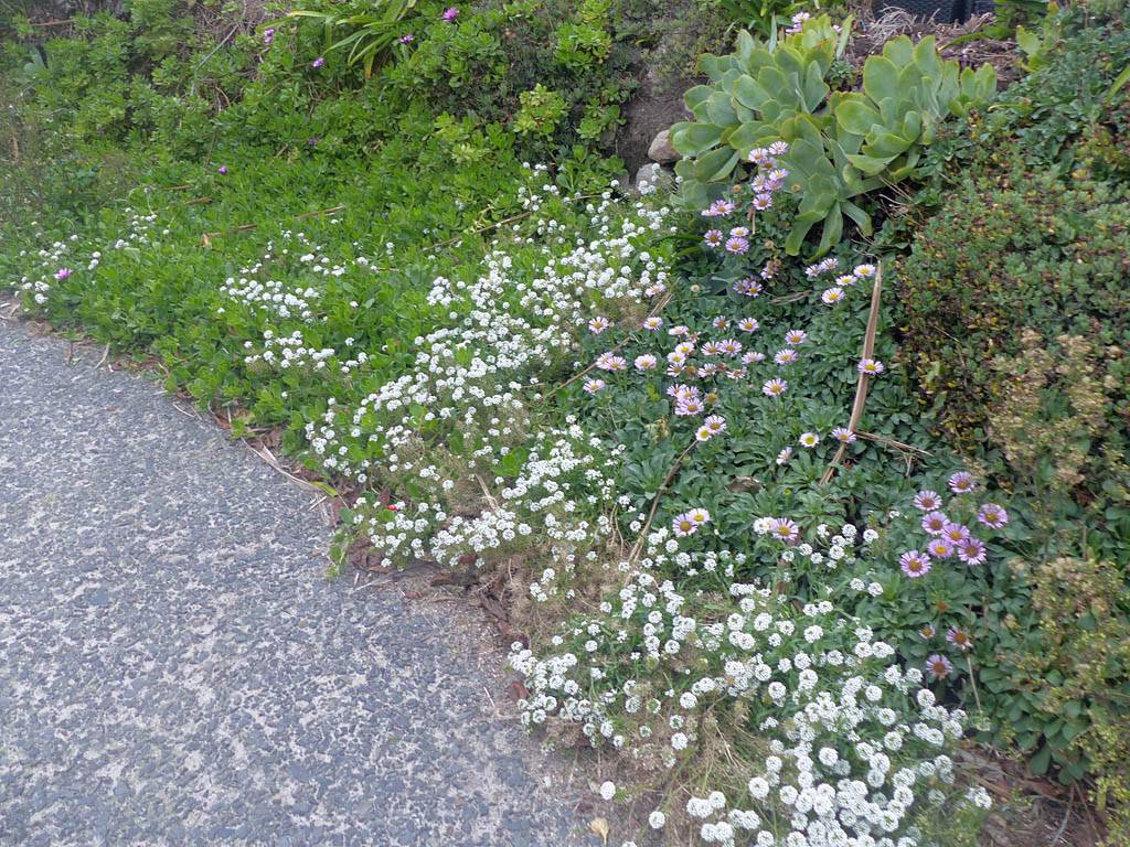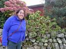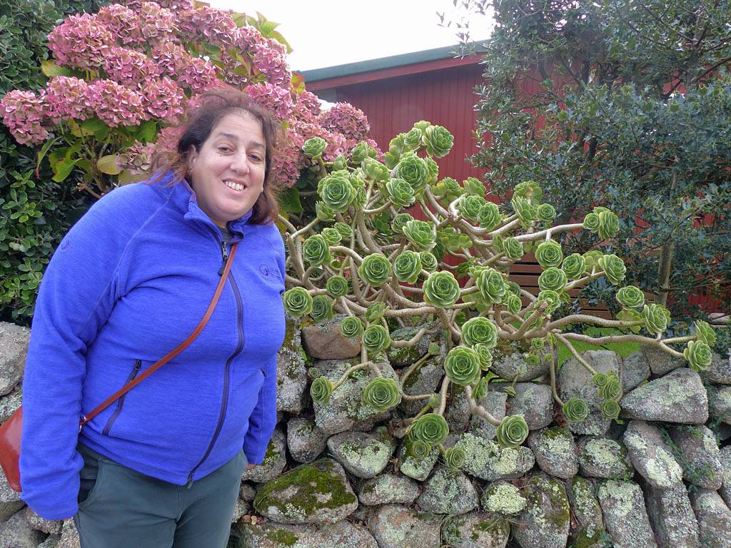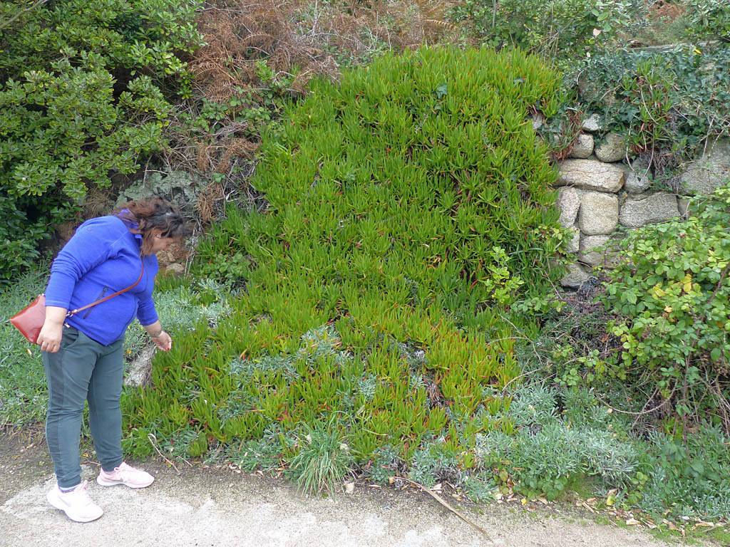 More scenic views down a slope as Renée looks on from the path above. | Checking out one of the succulent plants on the way back to the quay. |