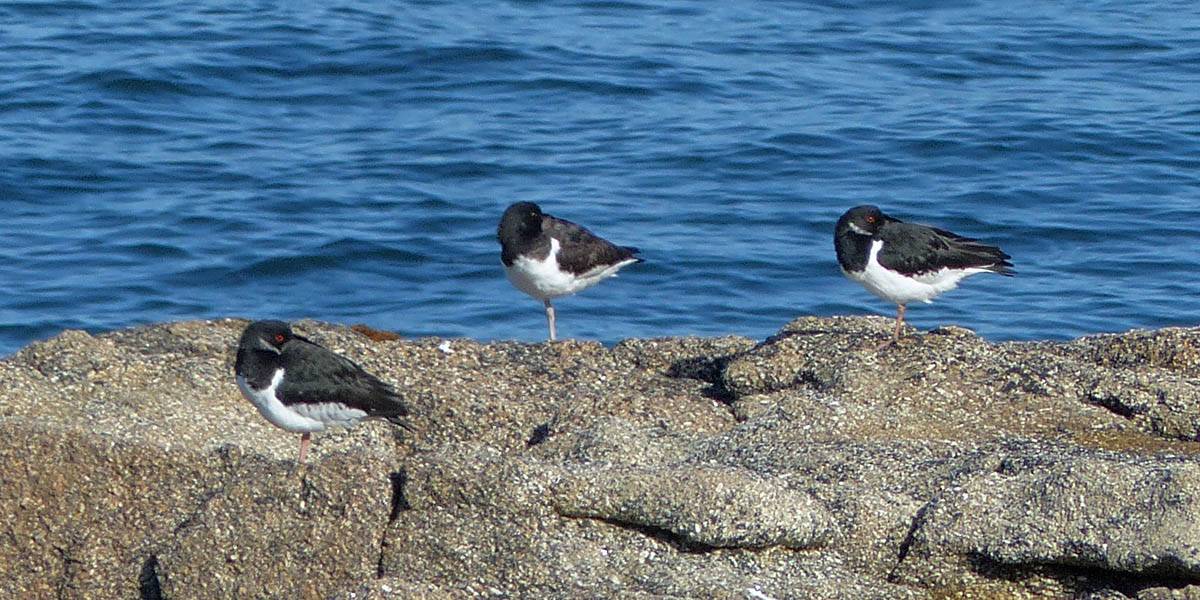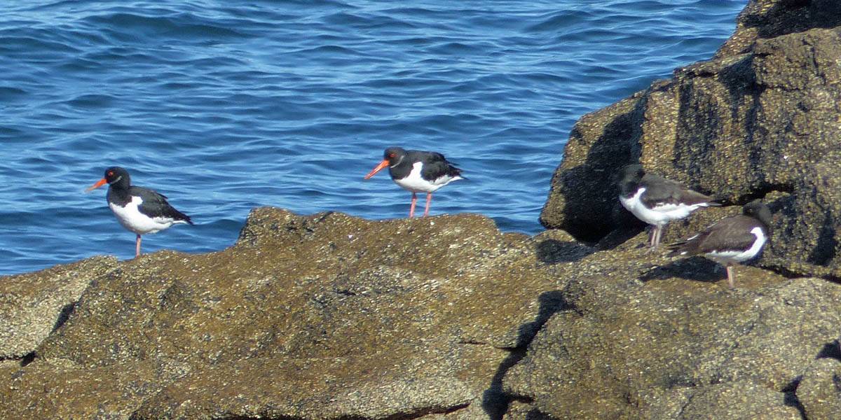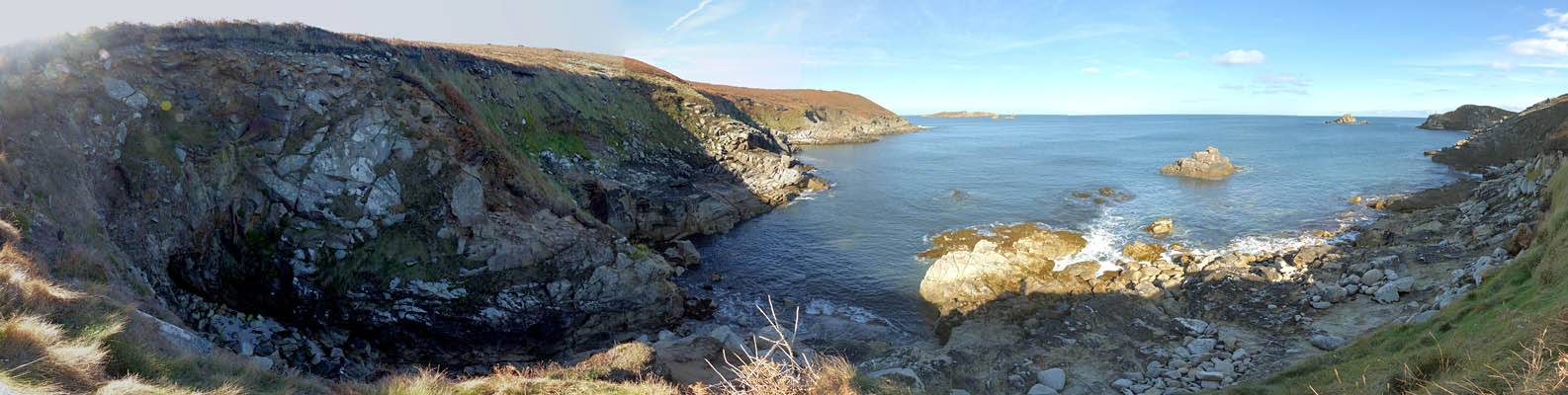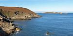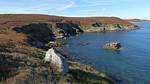 Past Burnt Hill, looking West towards Bull's Porth and Turfy Hill. | A wide view at the centre of Bull's Porth, where we reach the path back to Higher Town. | Looking at the snoozing Oystercatchers on the rocks nearby. | Looking West past Turfy Point to Great Merrick Ledge. |