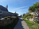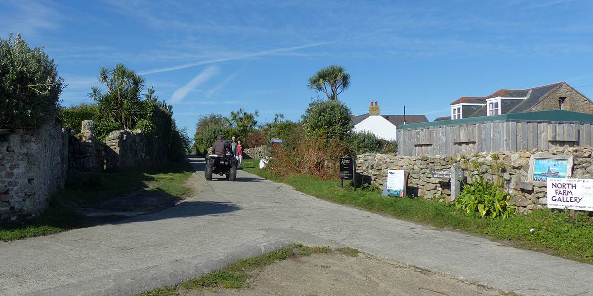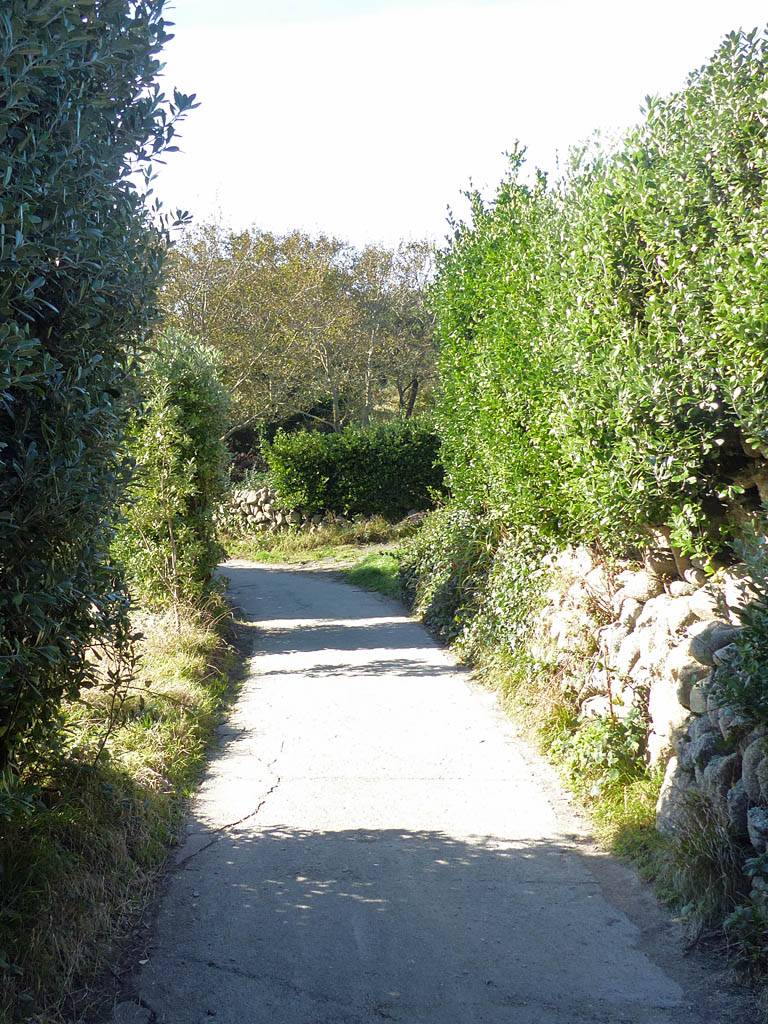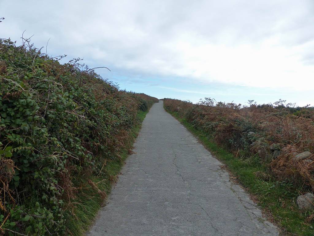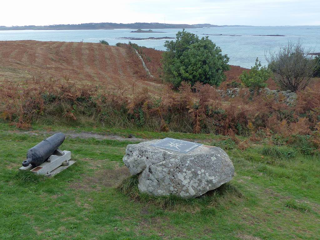 Walking up the main road from Middle Town. | A nice view over my shoulder of the beach and of Tresco in the distance. | A small cannon and a plaque near the top overlooking St. Mary. | St. Martin's Island Hall. | Walking West along a track along the ridge top from the Island Hall. |