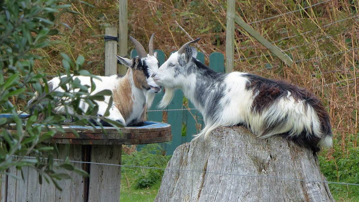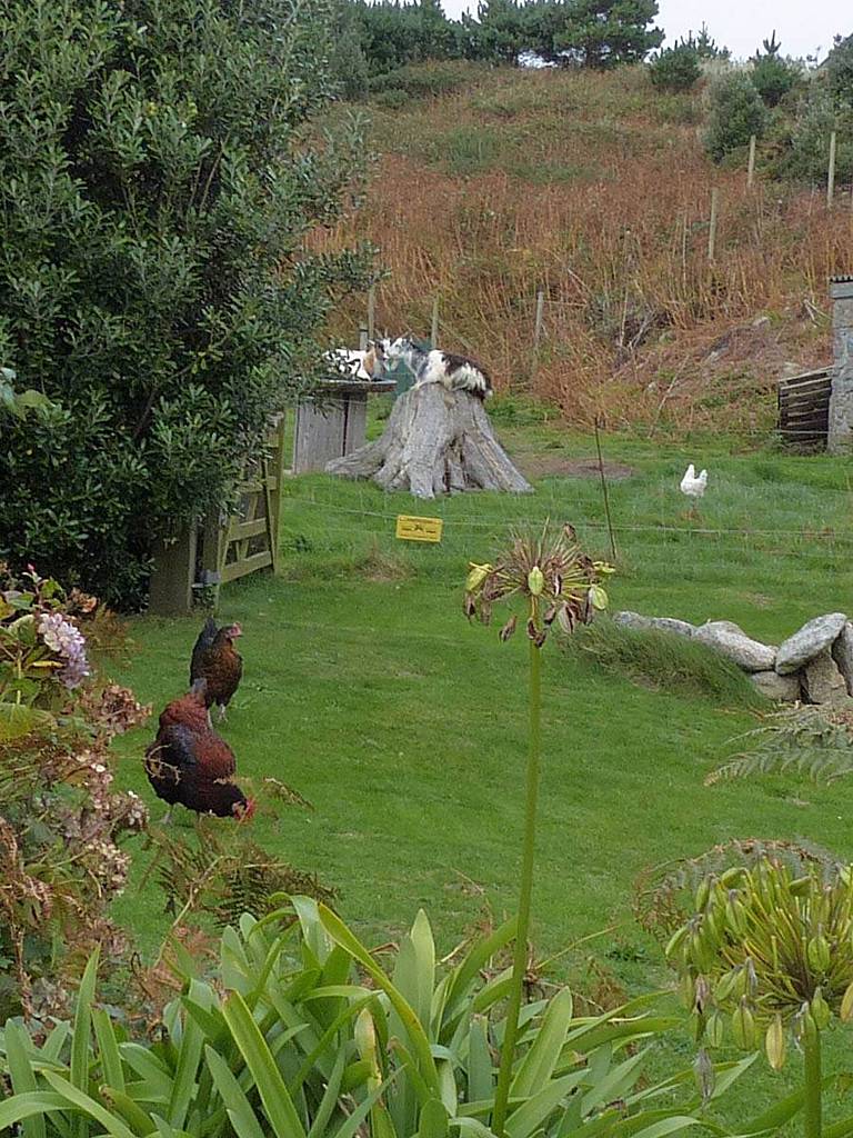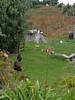 Clouding over. | Renée posing by a cool looking bush in Middle Town. | Chickens and goats in a Middle Town garden. |