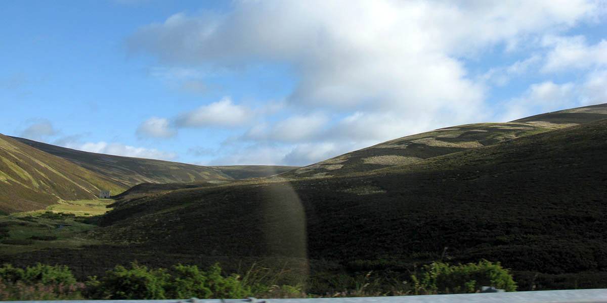 Heading from Tomintoul to Lecht the road continues to be a joy to drive. | A house nestled in the hills. | Climbing up onto the Lecht ski area. |