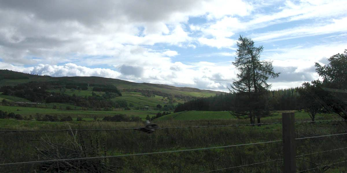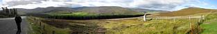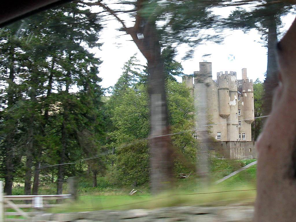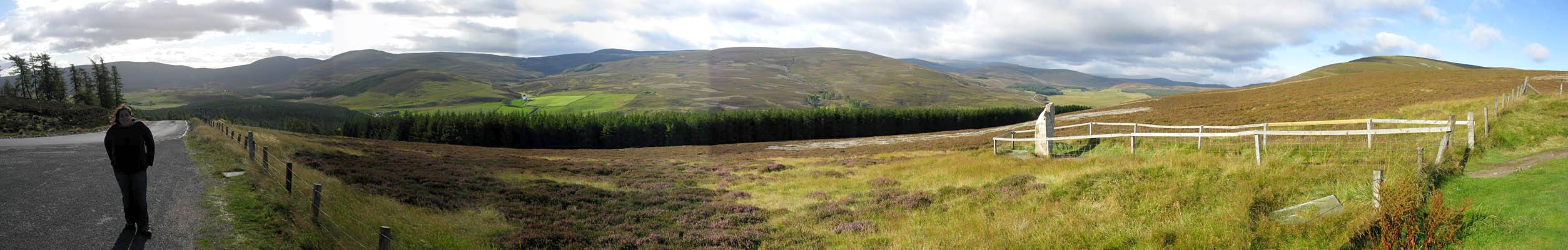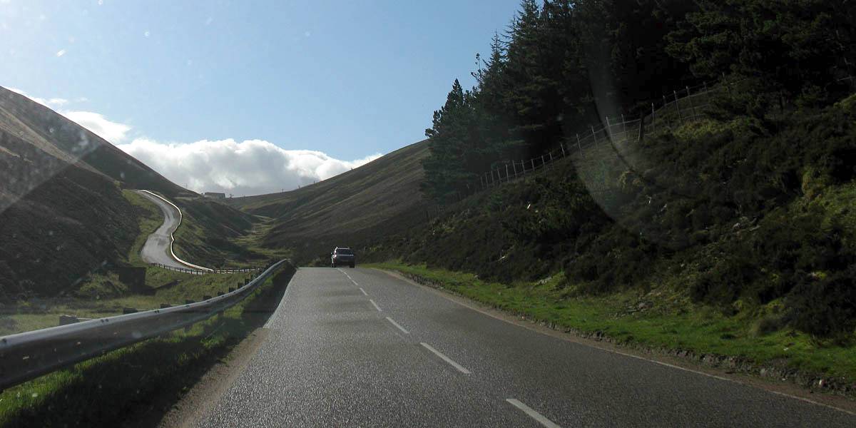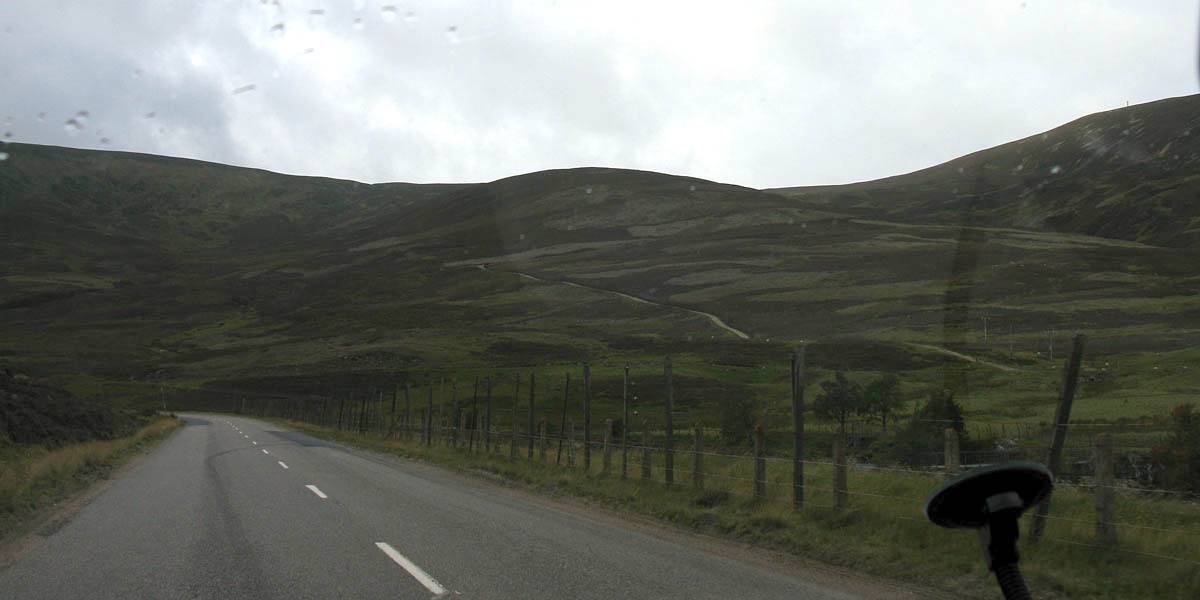Once past Tomintoul we drove over the Lecht ski area. Soon we descended like a roller coaster down a long downhill run. On the way down we stopped at a view point above Corgarff Castle where we could also see the 'rollercoaster' on the mountain high above us. Then we continued and dropped down to the A93 near Ballater.