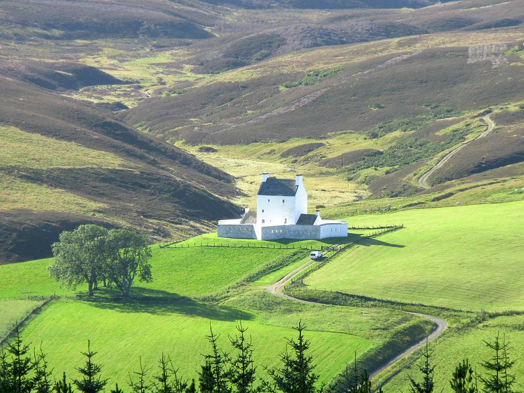 On the way down we stopped at a lovely viewpoint above Corgarff. | Corgarff castle. | Passing through Corgarff. | Looking back up at the 'rollercoaster' high up on the hillside. |