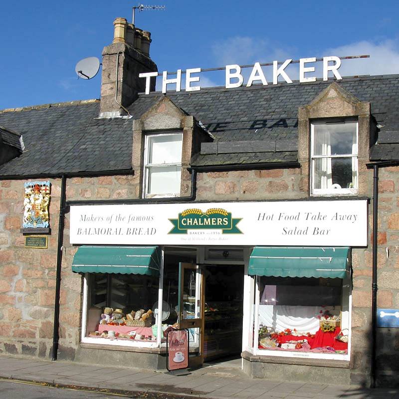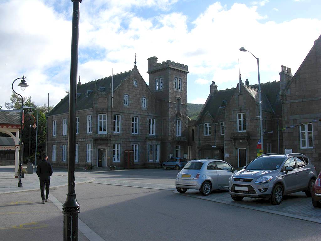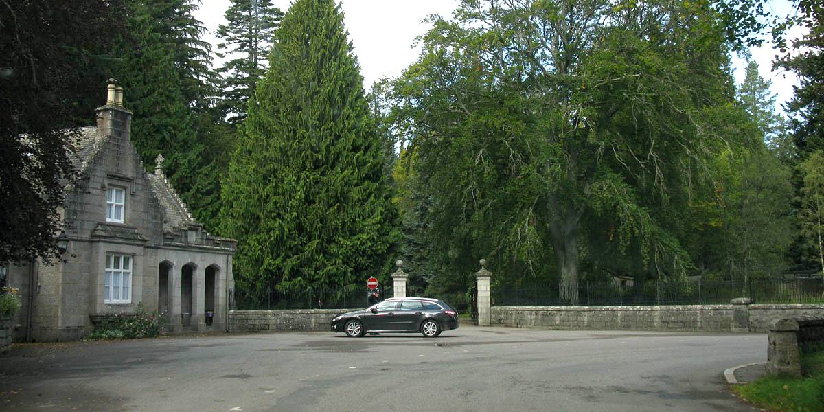 The Baker's Royal Charter. | Looking Northwest along the street to Craigendarroch. | The River Dee from the South side. | The gates of Balmoral. | Heading West along the A93 past Braemar Castle. |