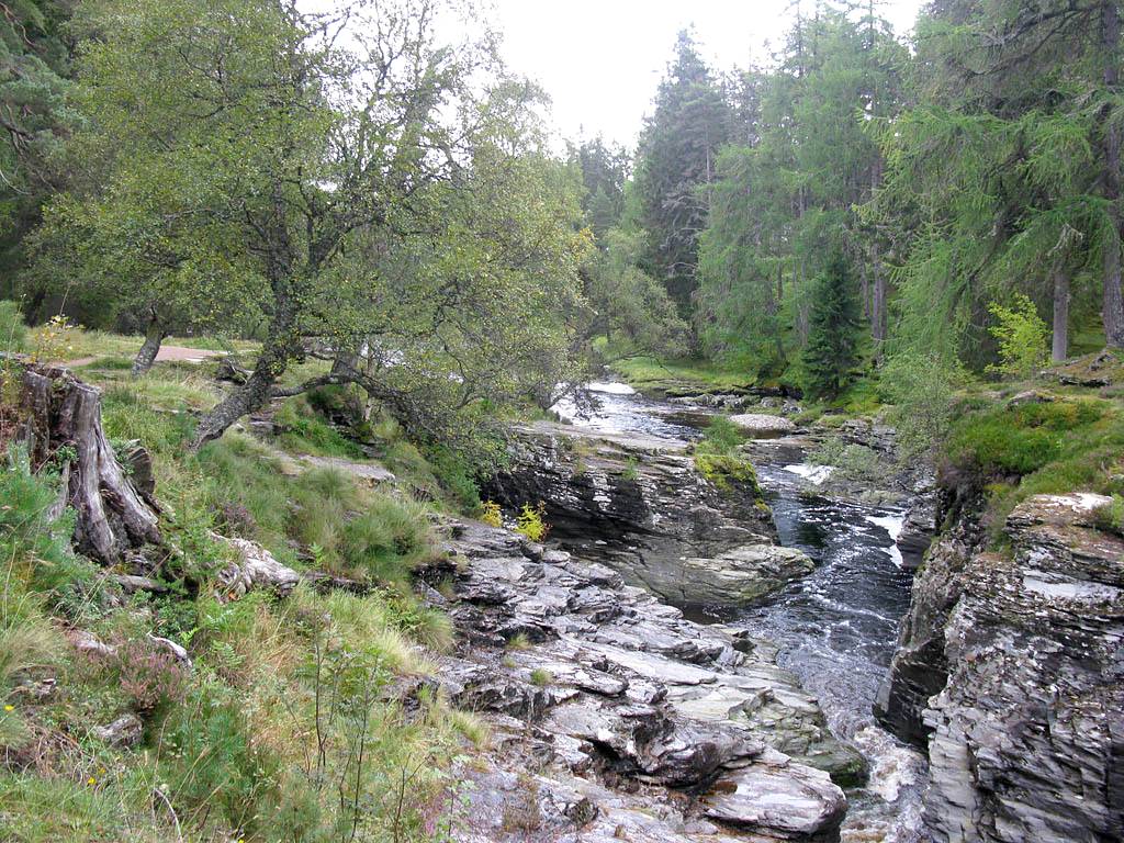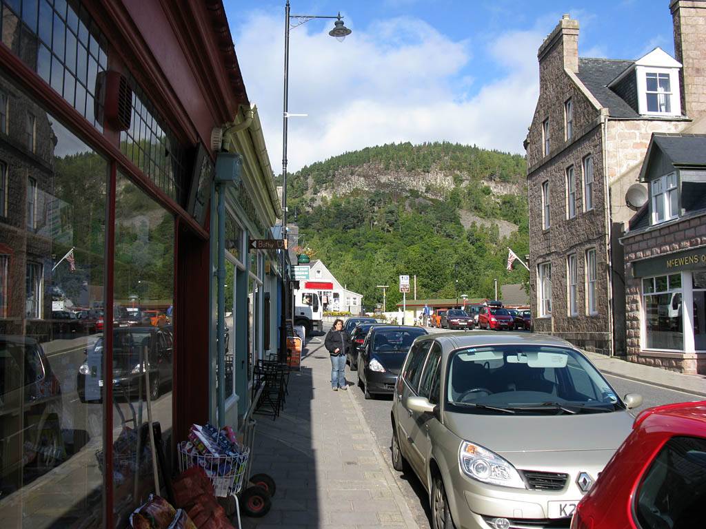 In Ballater I parked up at the old royal station and we had a look around. Then we went over the bridge over the River Dee and set off Westwards along South Deeside on the B976. This was a lovely windy narrow road through the woods, which took us to the gates of Balmoral Castle. Then we rejoined the A93 and pushed on to Braemar. Since it was only 11:30 we went straight through Braemar and carried on further west along a minor road to the Linn of Dee, a pretty gorge under the road. We got out for a short while to look and take pictures before returning the way we came to Braemar. We stopped at the Taste Café for some expensive lemonades and then had a look inside a couple of gift shops while we were there.