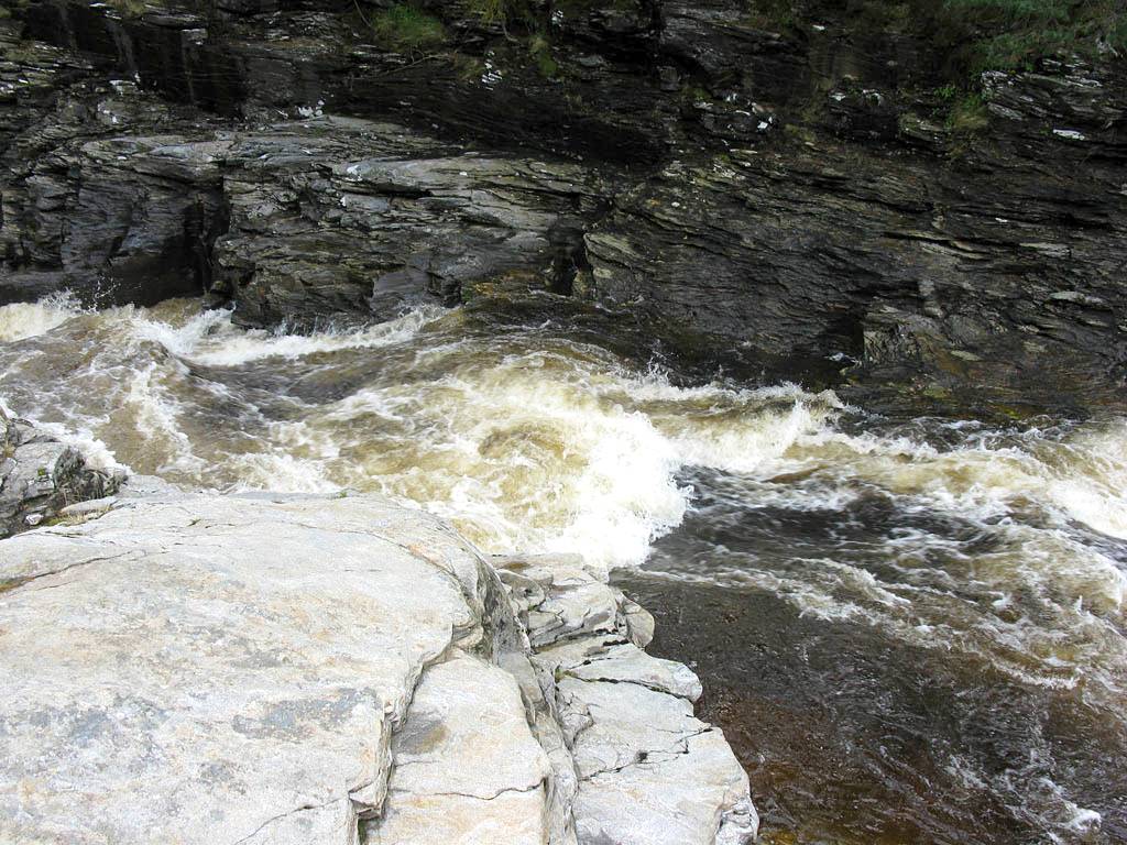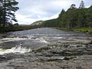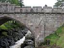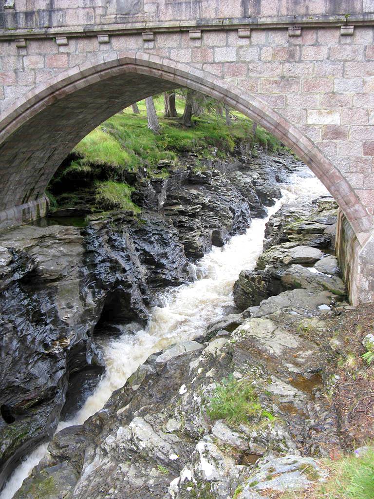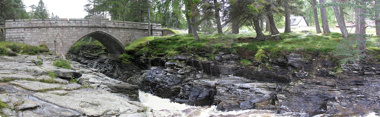 Looking Northwest across the River Dee from a view point opposite the Linn of Quoich. | The bridge at the Linn of Dee, built over a gorge, from the upstream side. This is as far upstream as we can drive. | Looking upstream from the bridge. | The water entering the gorge under the bridge. |