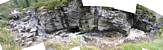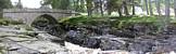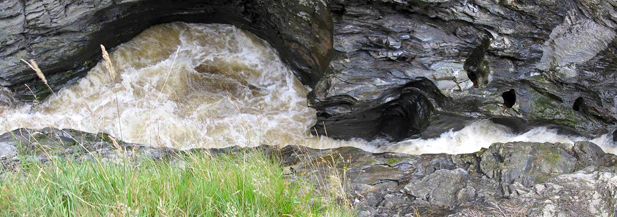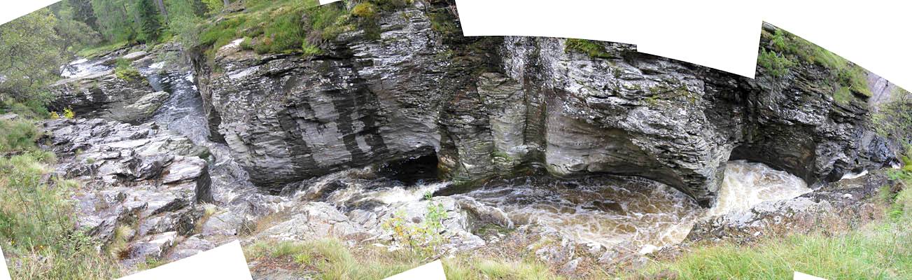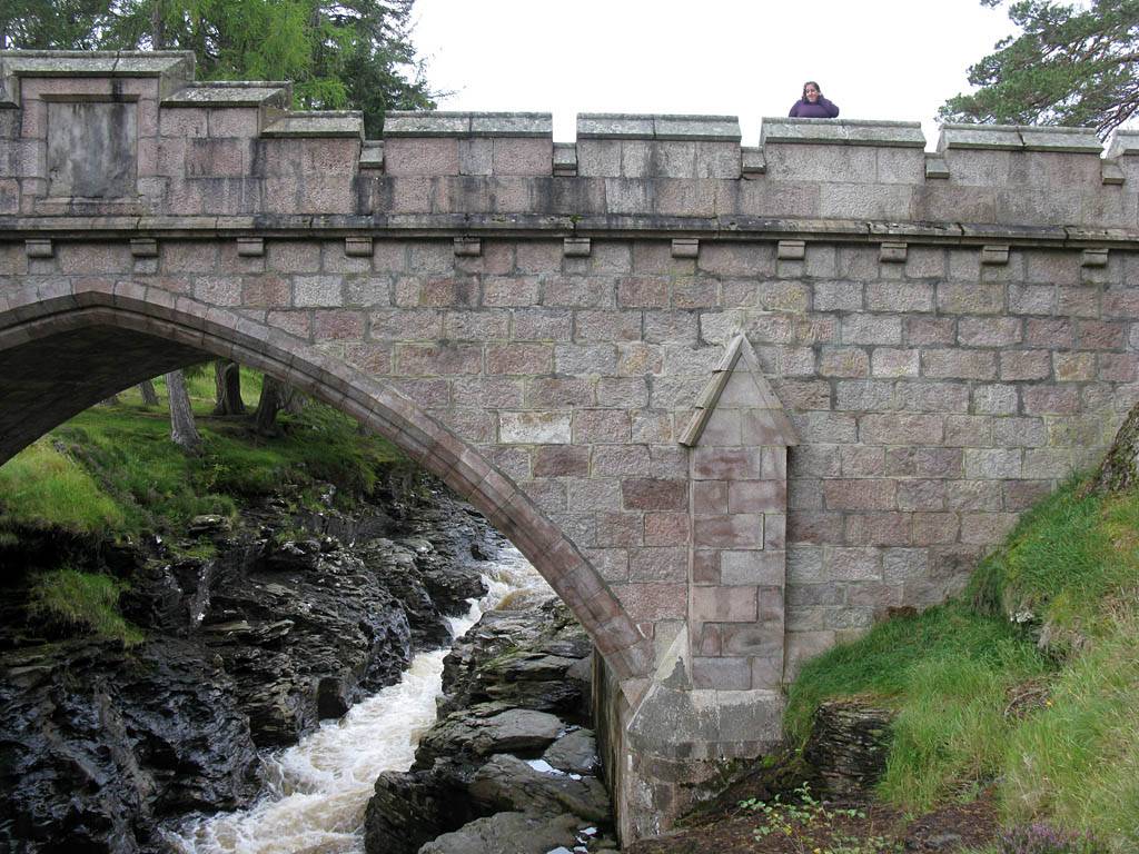 The bridge at the Linn of Dee from the downstream side. | Panorama of the gorge, including an eddie forming a whirlpool. | Renée on the Linn of Dee bridge. | A collage style panorama of the gorge downstream of the bridge. |