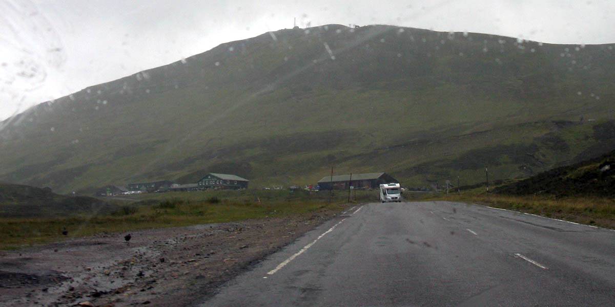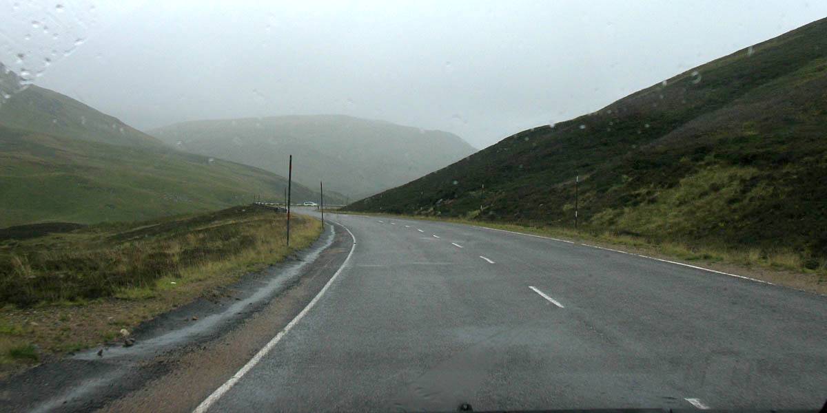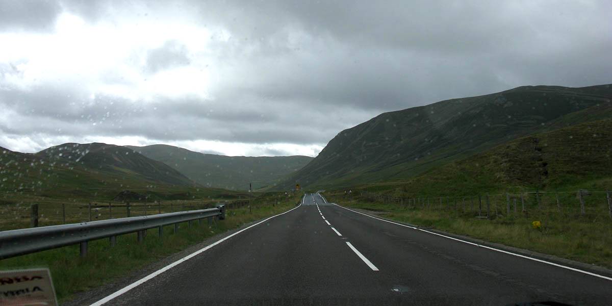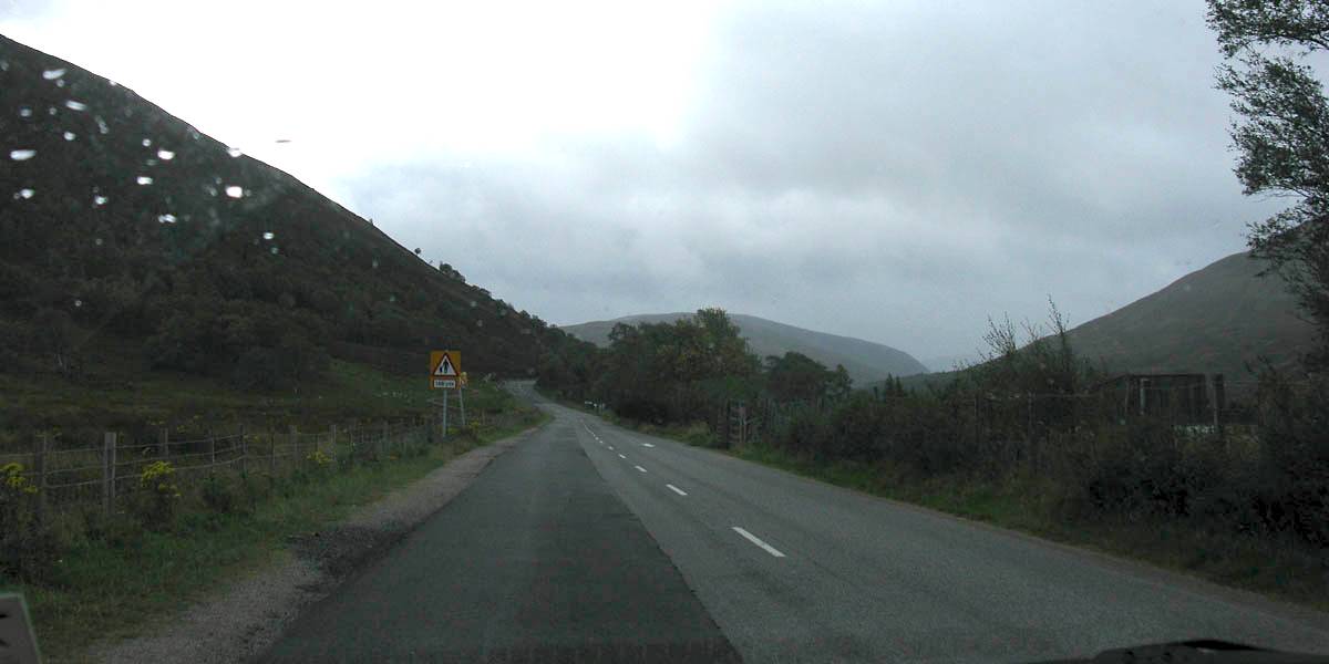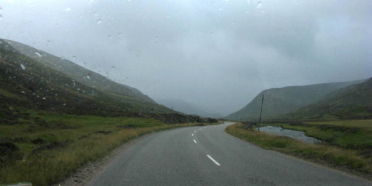 Heading South from Braemar into Glen Clunie. | As we follow Clunie Water upstream, the weather closes in up ahead on the Cairnwell Pass. | Approaching the top of the Cairnwell Pass. |