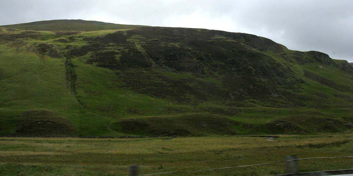 The Glenshee Ski Area at the top of the Cairnwell Pass. | Heading down the other side into Glen Shee. | Green hills line the pass. |