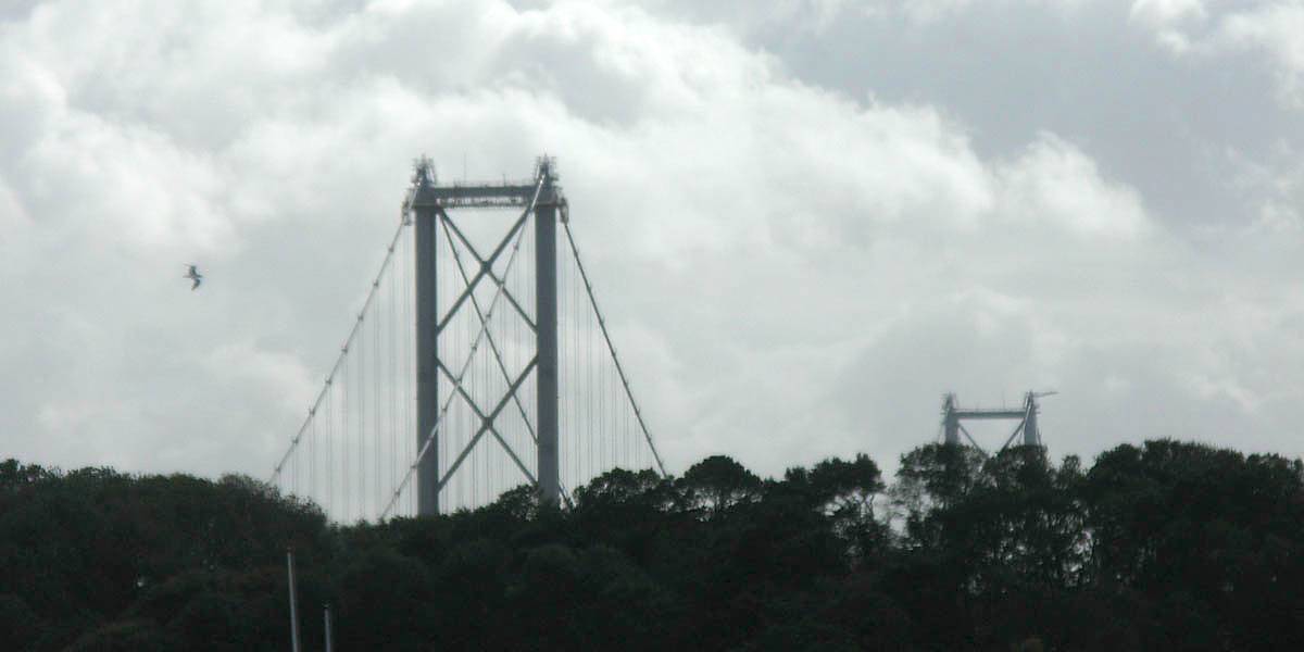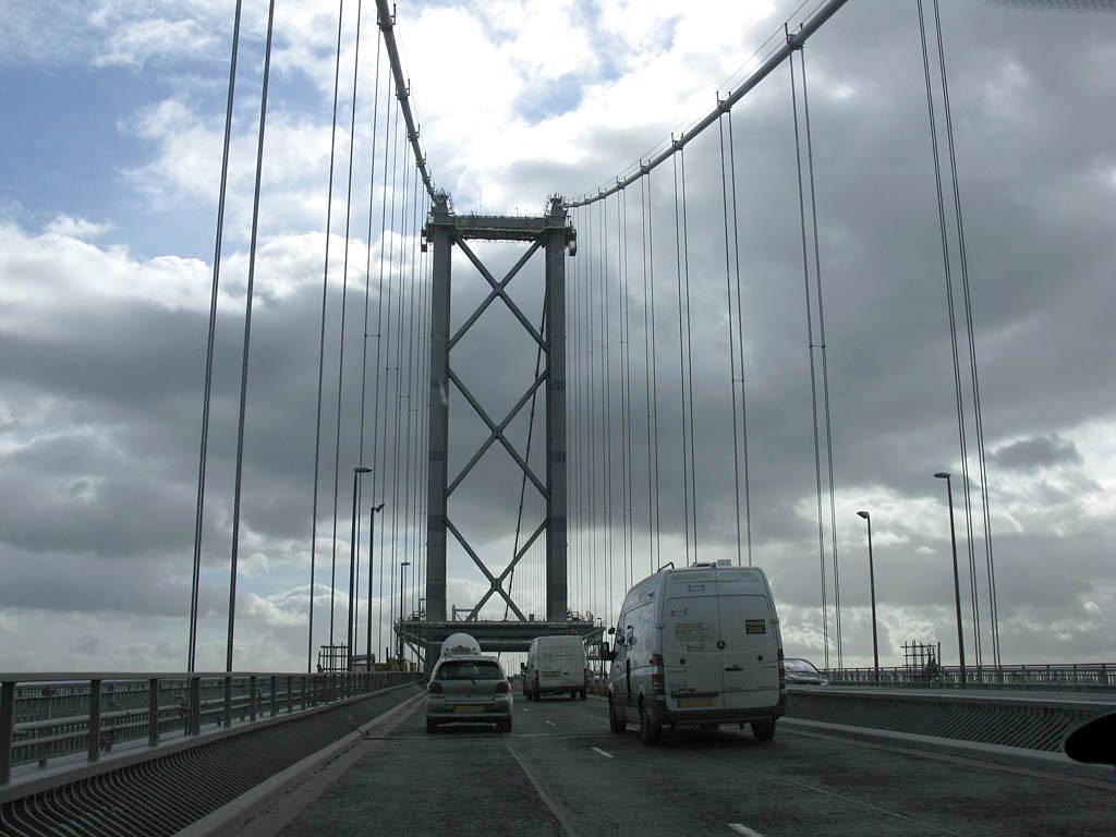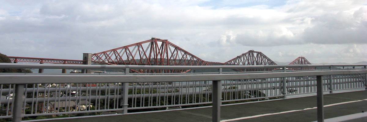 Crossing the Forth Road Bridge with the Forth Rail Bridge running alongside. |