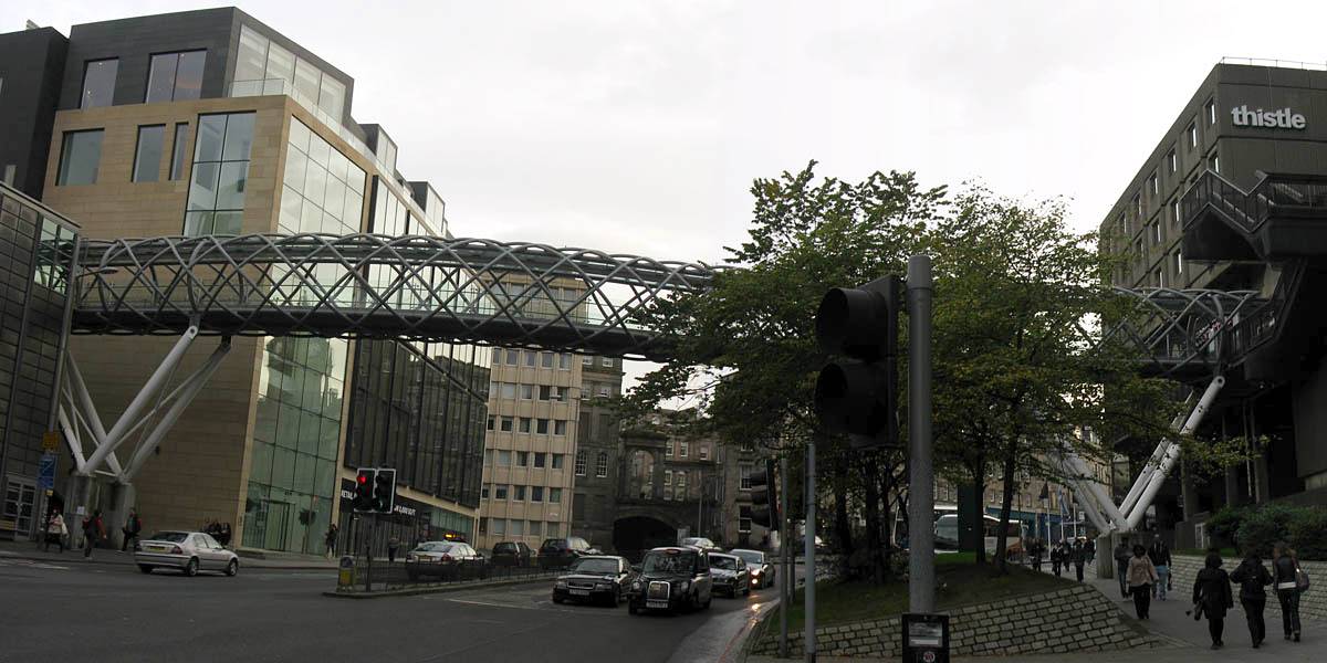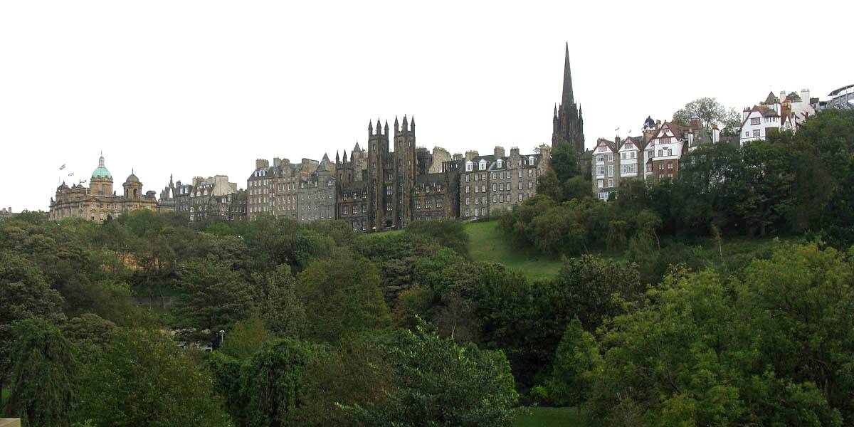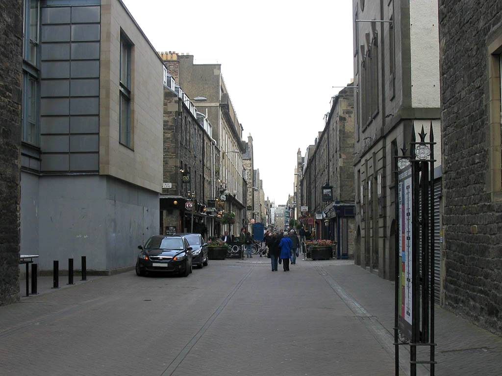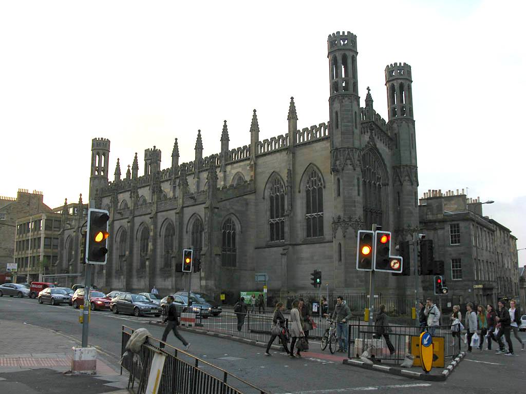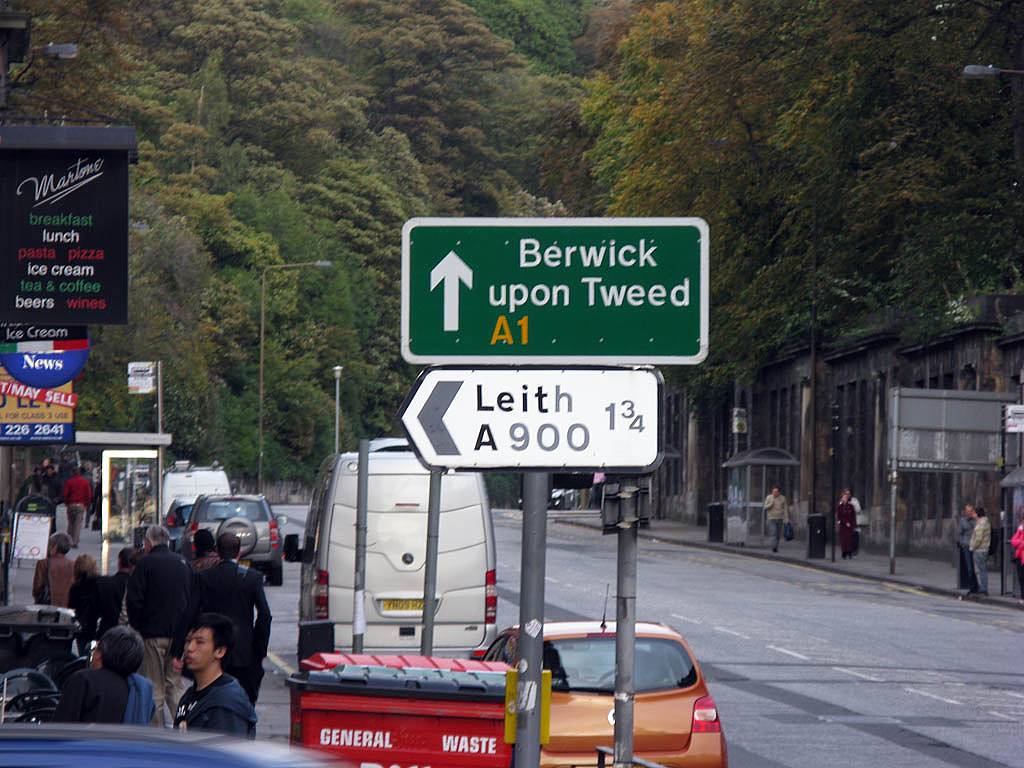Another view of Old Town to the South, with Princes Street Gardens in front. | Rose Street. | The start of the A1. The longest road in the country, and the opposite end to home. | A bridge over Leith Street as we head for Broughton. | A gothic looking cathedral on the corner of Broughton and Queen Streets. |