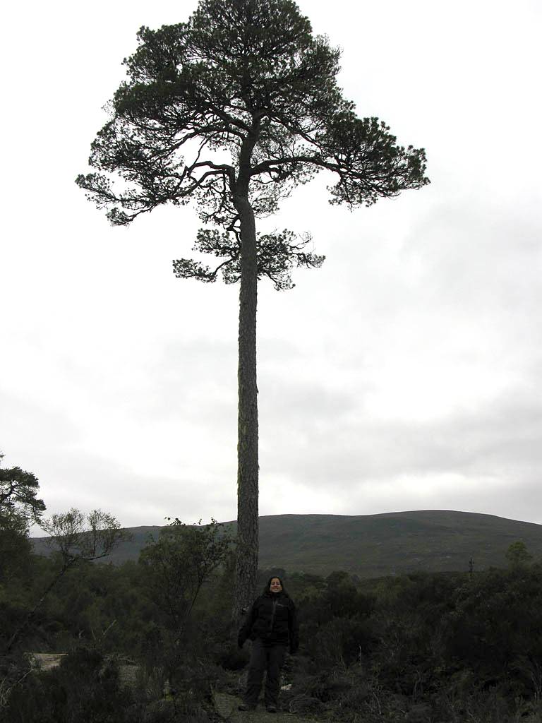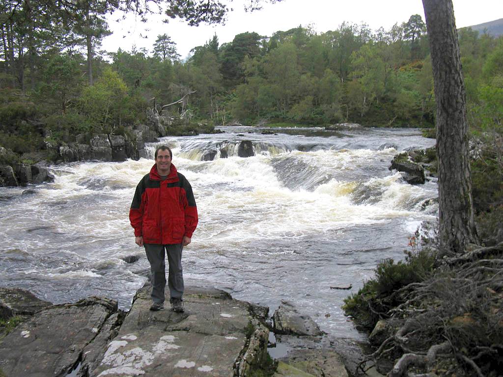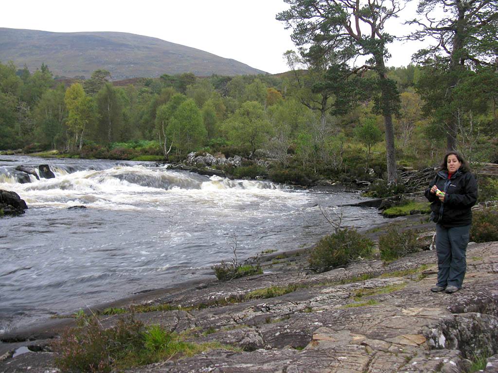 The River Affric, just upstream of Loch Beinn a' Mheadhoin and just downstream of Loch Affric. | Renée under a big prominent tree and enjoying the River Affric walk. | Mike at a series of waterfalls on the River Affric. |