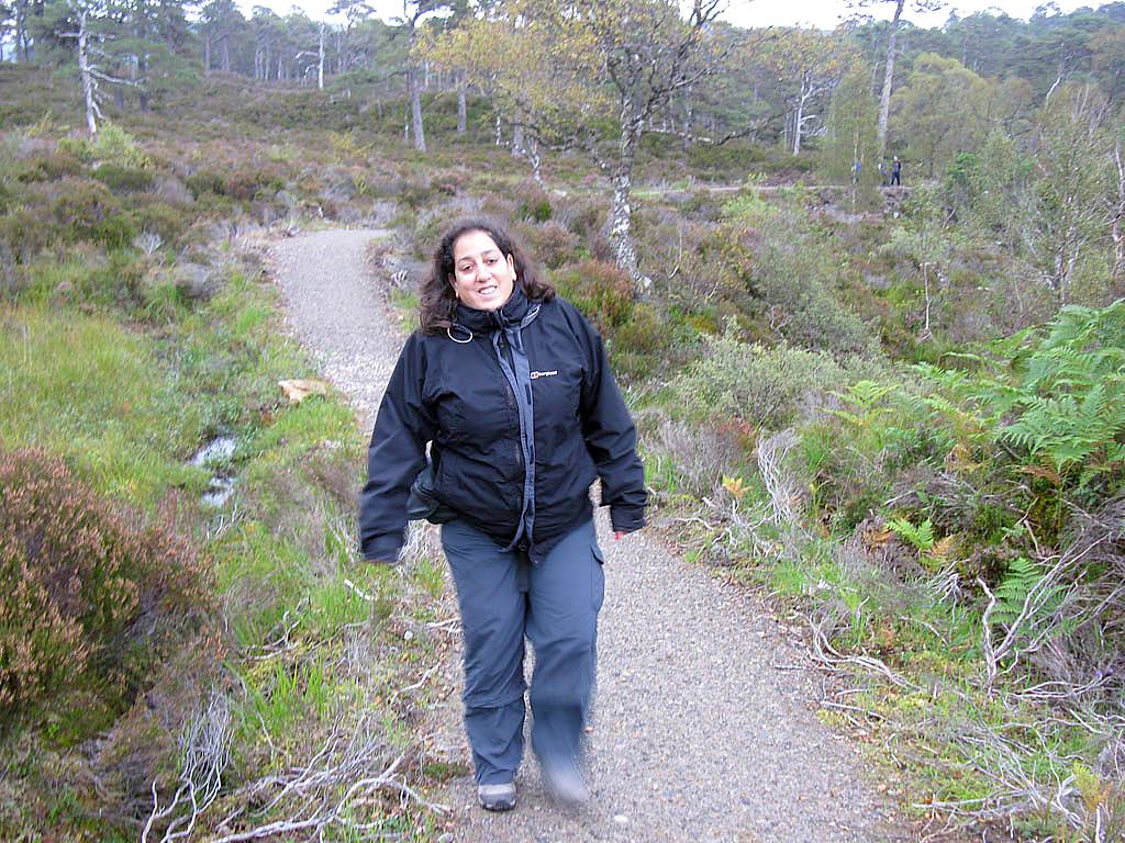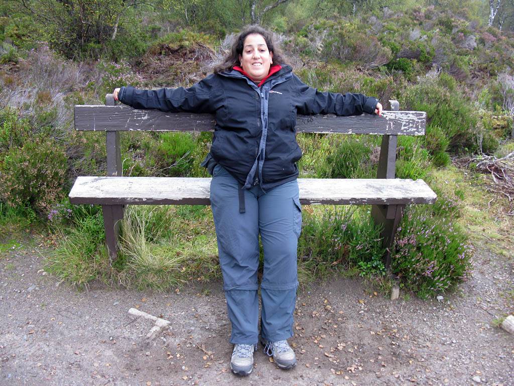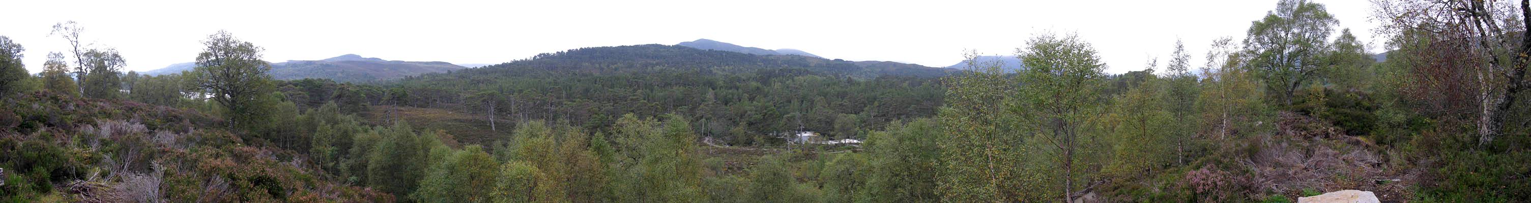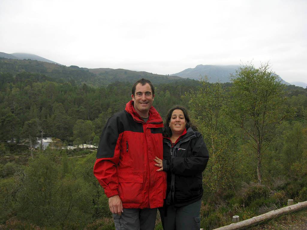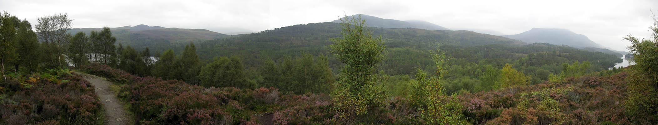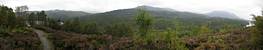 Renée doing a bit of benching near the viewpoint. | Mike and Renée above the River Affric. | Climbing up to an upper view point on a hill top as the weather deteriorates. | 180 degree panorama from Loch Beinn a' Mheadhoin downstream to Loch Affric upstream. |