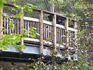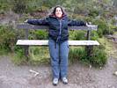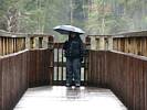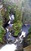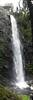 Renée on the upper platform as I go down to the lower view point. Yes the rain was pouring down while we were here. But the landscape is beautiful in all weathers. | Vertical panorama of Plodda Falls. |