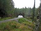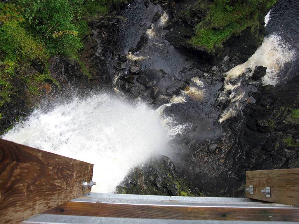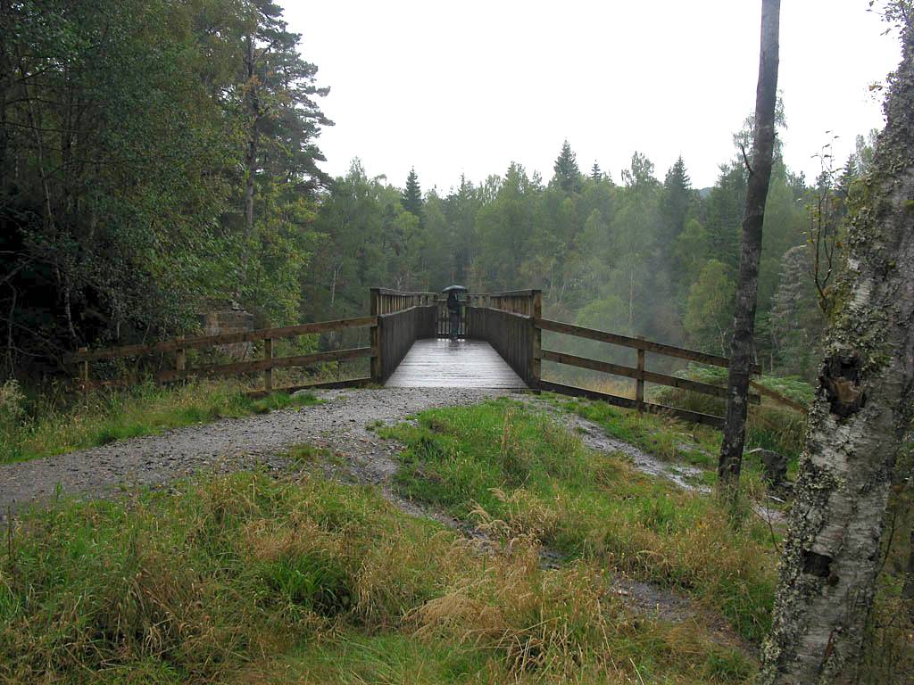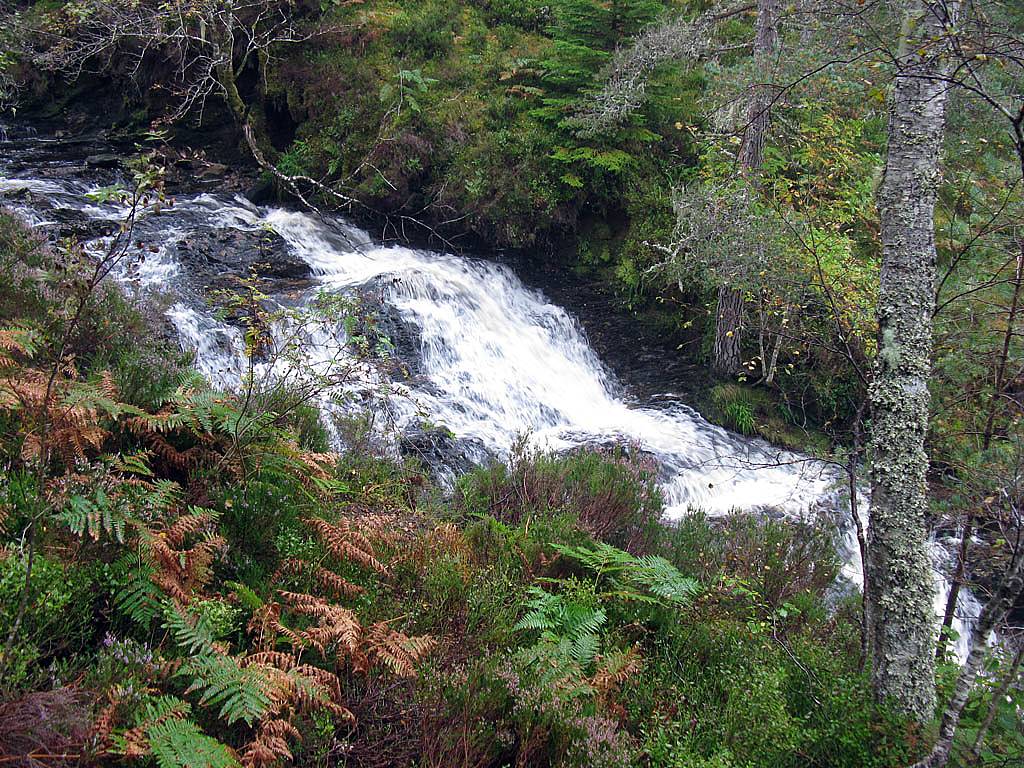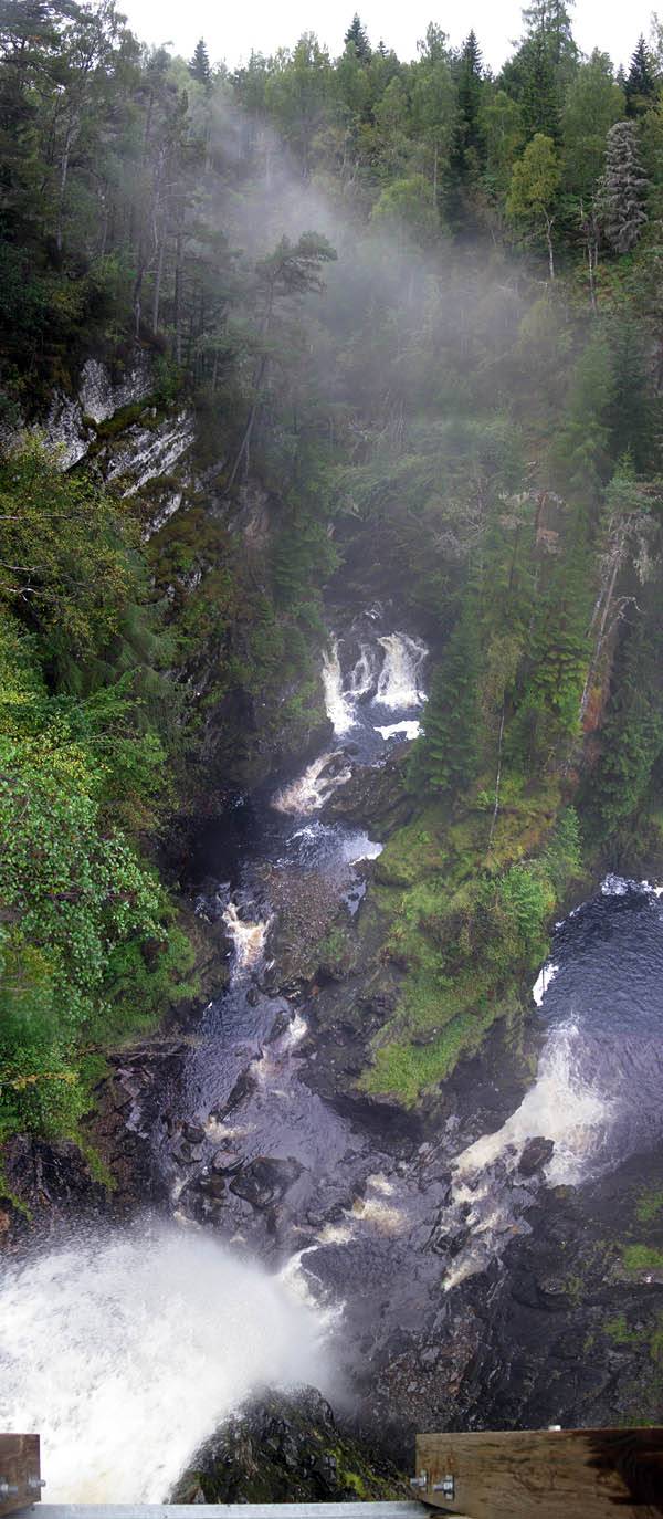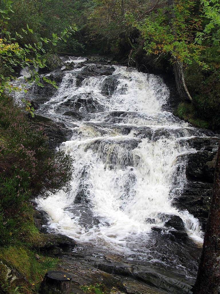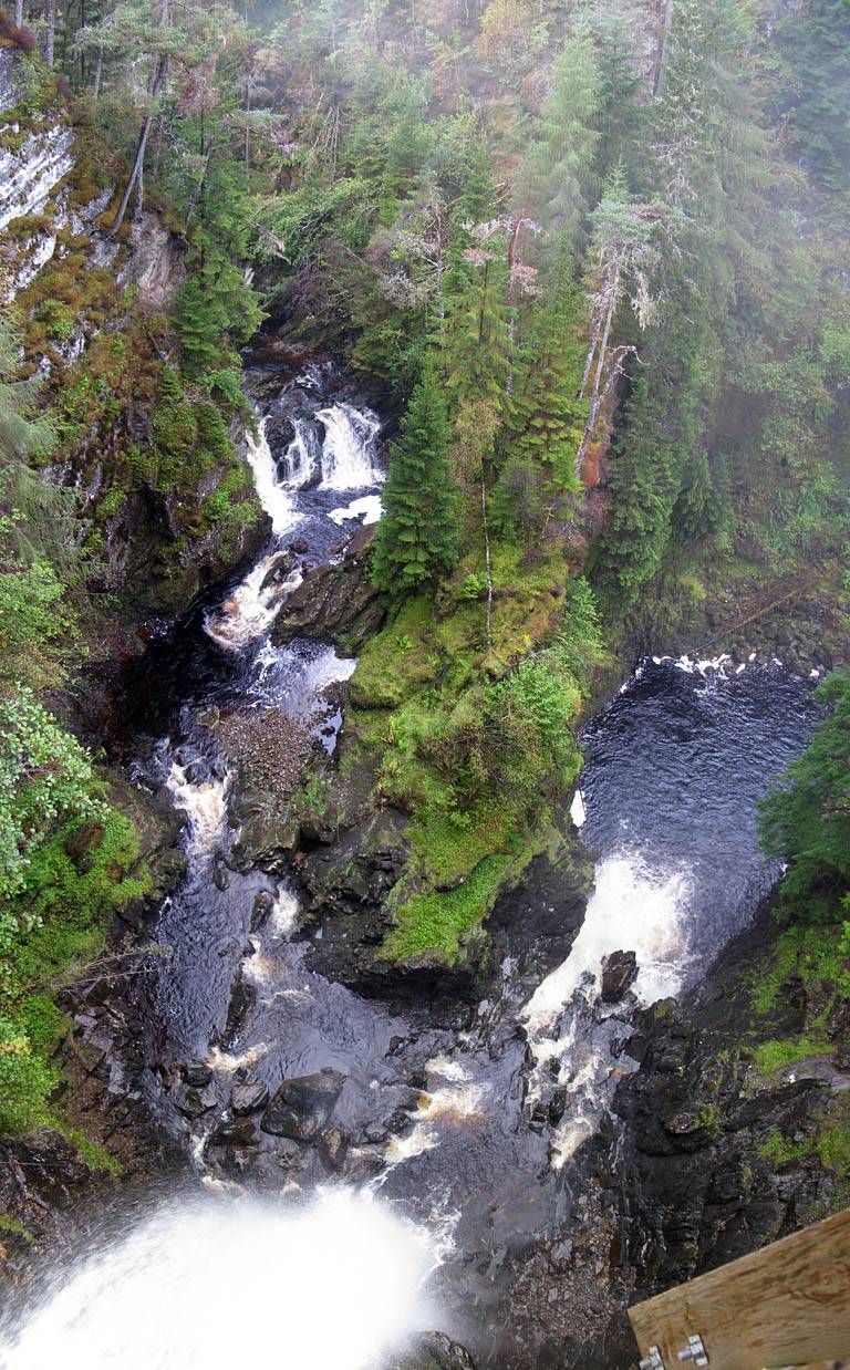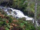Driving back East it was now rather wet. We crossed over the river just West of Cannich and then went to Plodda Falls, although not before a mild argument over whether to go and how much to walk. We compromised, and just visited the waterfall instead of the whole walk. The last mile or so was a very muddy track in the rain and made the car filthy. On arrival we did find the car park closed for works with keep out signs. I almost turned around but spoke to a workman who said to park in a nearby muddy lay-by and allowed us through. It was worth it indeed! Renée stayed up top on the viewpoint while I raced down to the bottom and back for pictures.