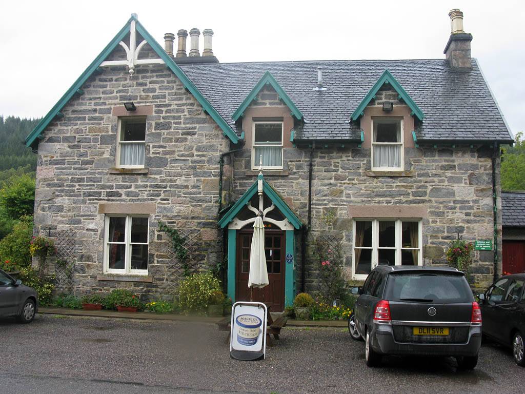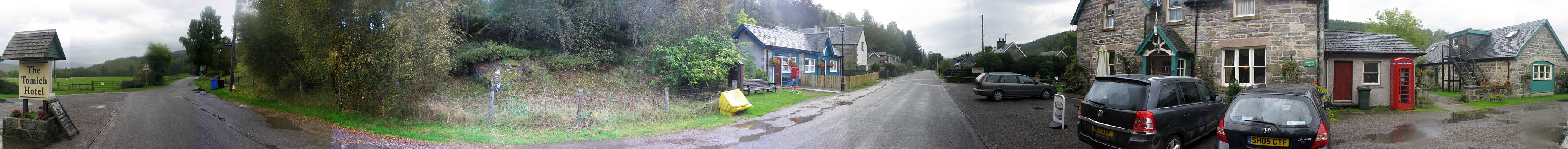 It was so nice to get back to tarmac after a very muddy drive along a wet gravel road. | 360 degree panorama of Tomich. The way to Plodda Falls in the centre, the way back to civilisation to the left. | The Tomich Hotel where we stopped for tea. |