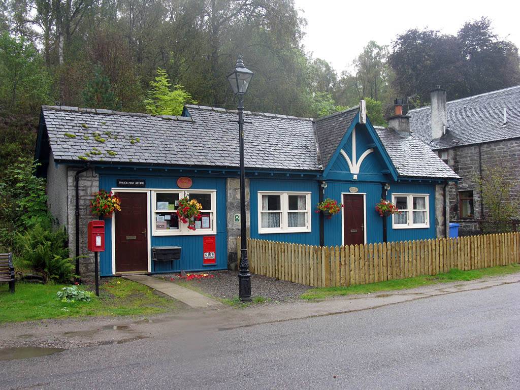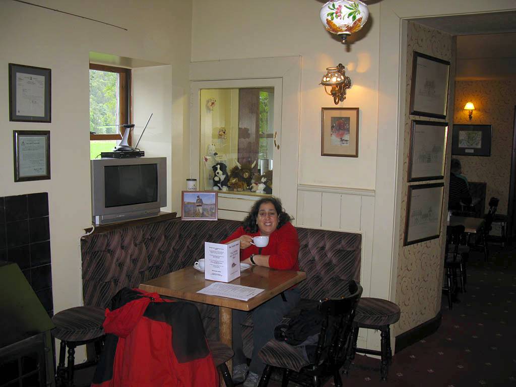A post office across the road. | The Tomich Hotel bar. | Renée enjoying a nice warm hot chocolate after being out in the rain. | Driving up over the hills on the A833 to get us to the Beauly Firth. |