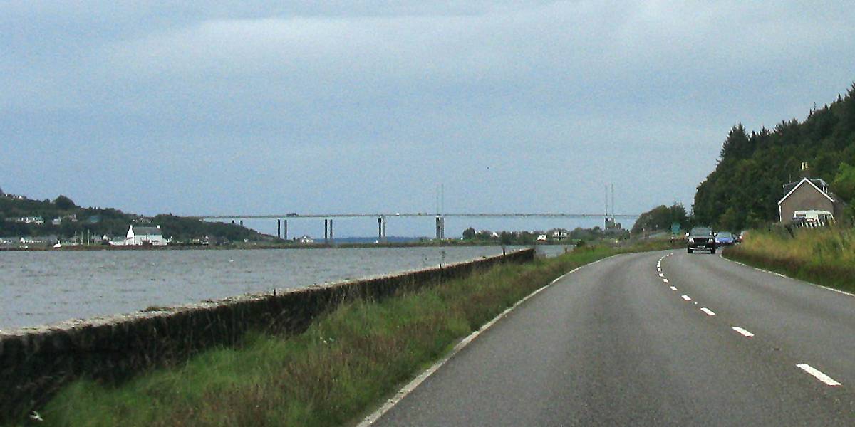 Driving East on the A862 alongside the Beauly Firth. Across the other side is the town of Redcastle. | Up ahead the A9 Kessock Bridge over the Moray Firth looms large. Inverness isn't far away now. | A boat at the Eastern end of the Caledonian Canal where it empties into the Beauly Firth. A far cry from the Fort William / Corpach end where it empties into Loch Linnhe. |