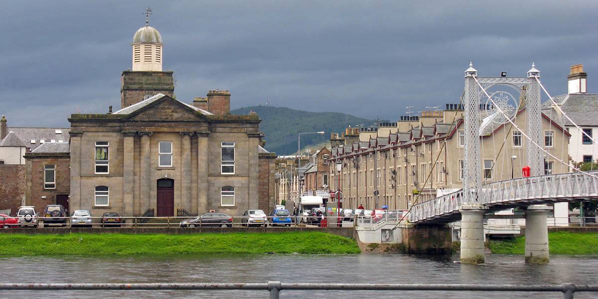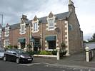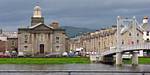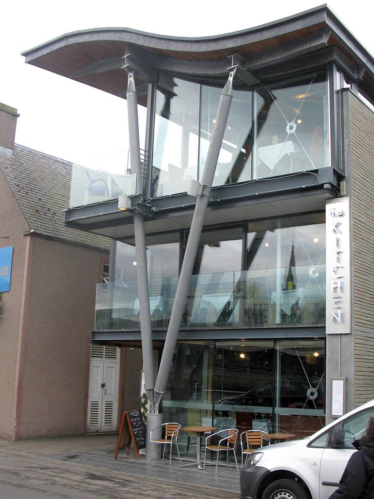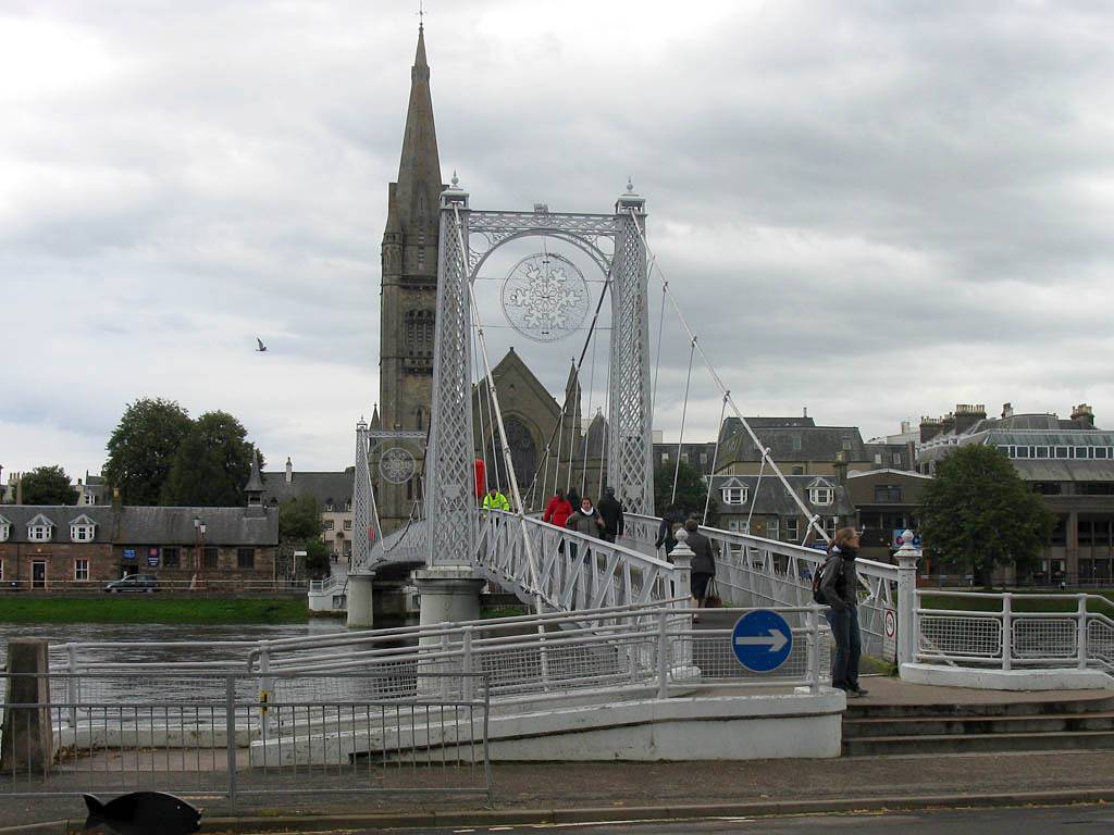 Roseneath Guest House. | Looking Northeast along Greig Street from the BnB to the footbridge. | The footbridge. Look how high the River Ness is. Right up onto the grass banks. | The Kitchen restaurant has a cool looking building housing it. |