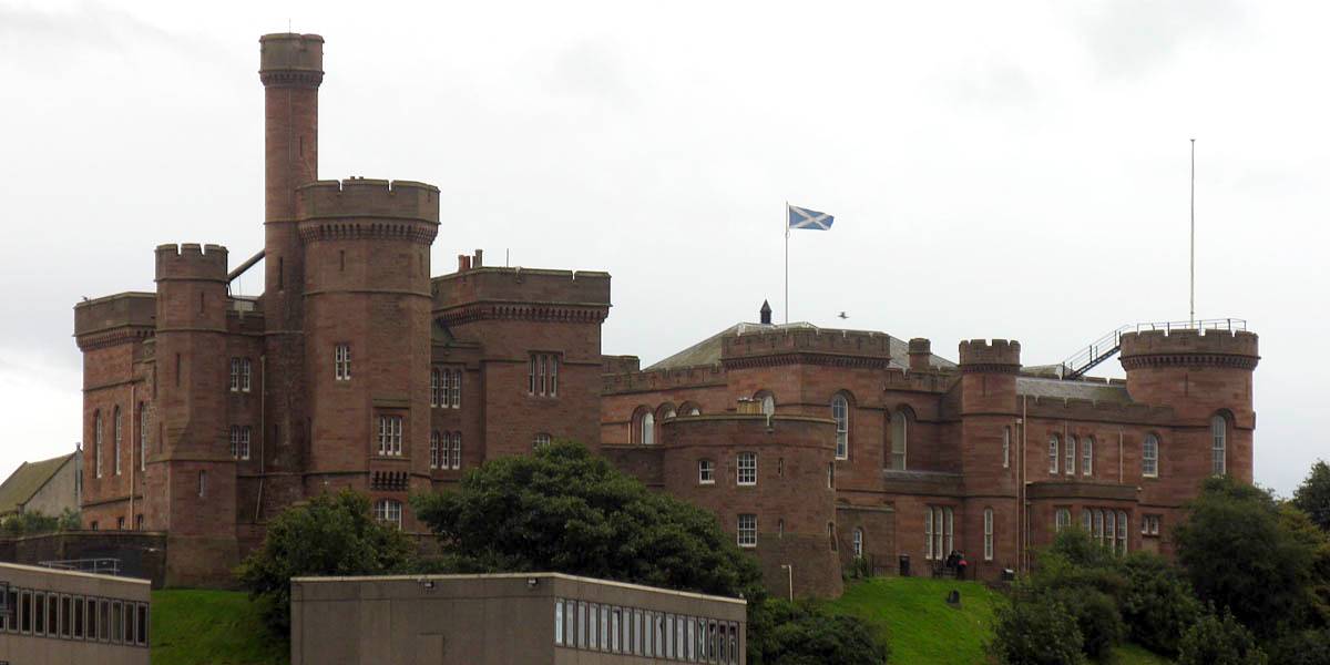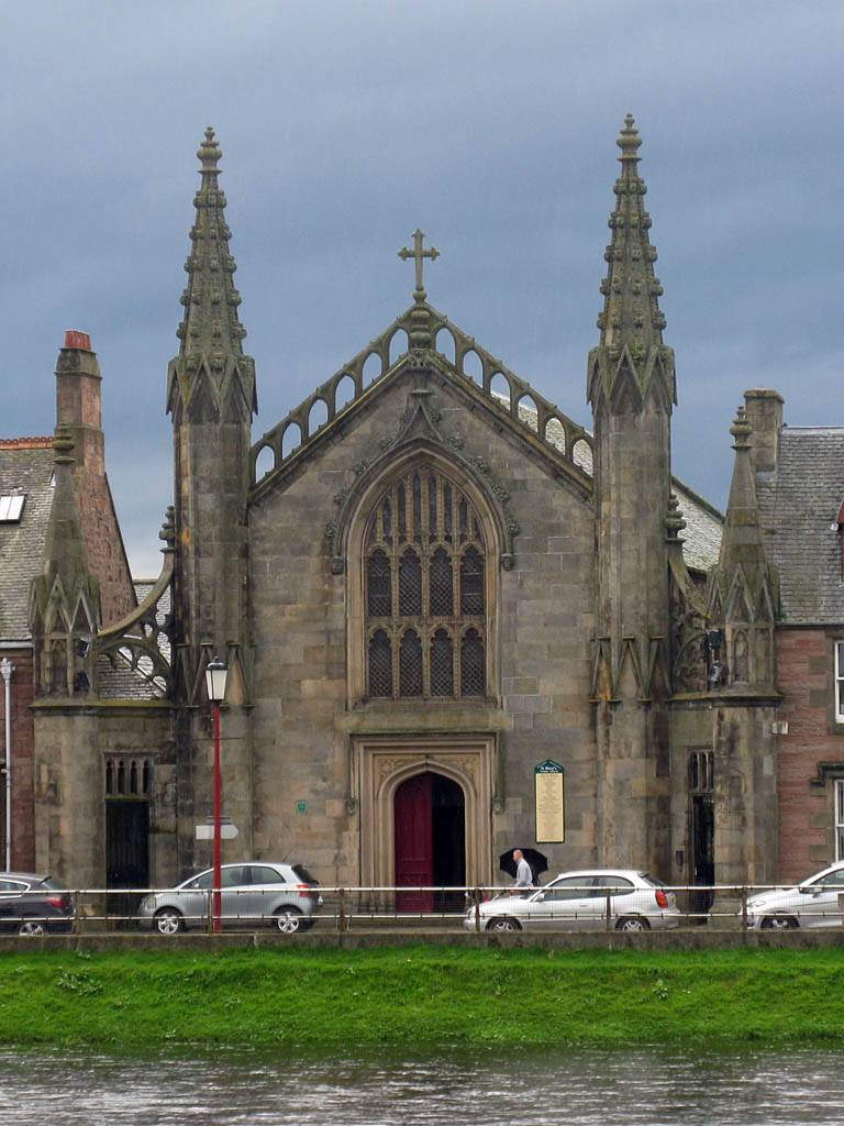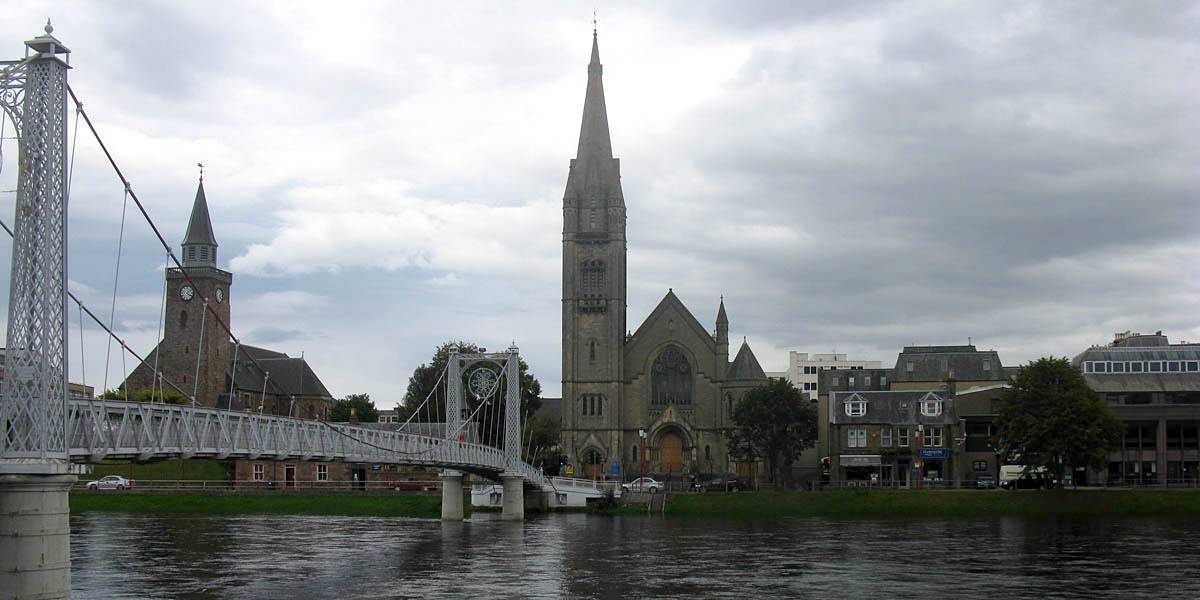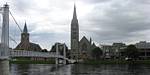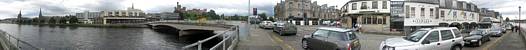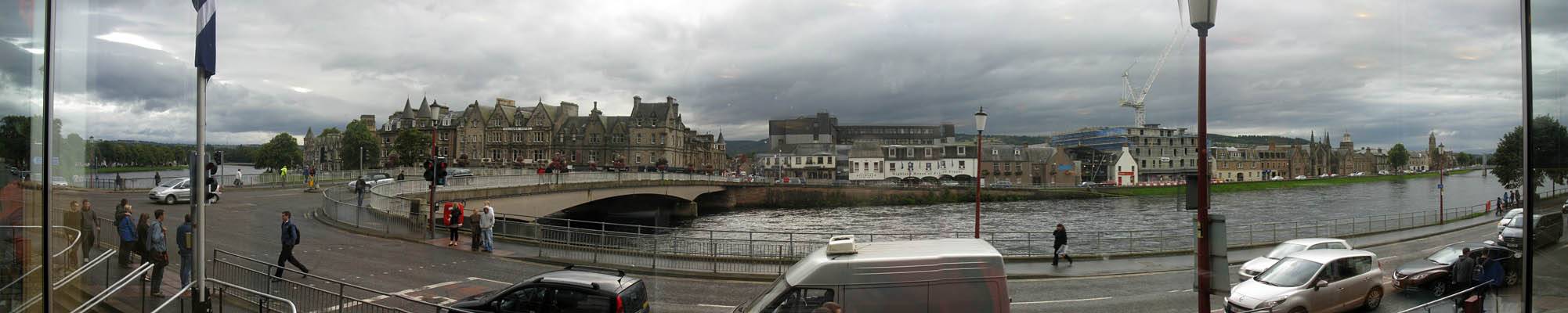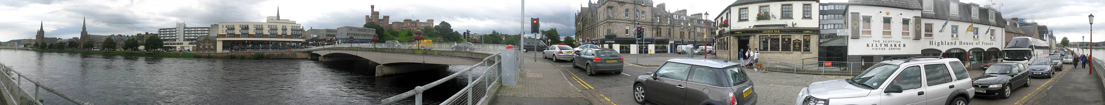 St. Mary's Catholic Church and its buttresses on Huntly Street seen from the other side of the river on Bank Street. | Looking back across the bridge towards Greig Street. | Panorama of the view from Jimmy Cheung's restaurant near the Bank Street / Young Streat bridge junction. | Inverness Castle. |